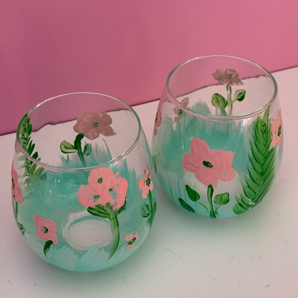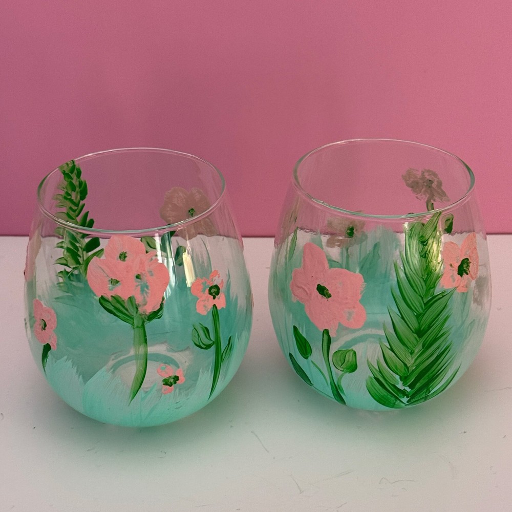 Set of 2 Hand Painted Stemless Wine Glasses - Floral Design, 4" in Tall. Pre-owned. Overall in good condition. 4 inches tall with an approximately 3-inch diameter opening. Shows some signs of wear, including minor scratches and possible slight fading of some painted areas. Hand-painted floral design. Please see photos for more details. The pictures are of the exact item you will receive. Please check the photos for more details. Please note that this item might have a slight smell of smoke due to storage and the cardboard box used for shipping. We take great care in cleaning and carefully packing the item to minimize any potential odors. Additionally, we prioritize fast shipping to ensure the item arrives quickly and in excellent condition. If you have any concerns, feel free to contact us before purchasing. Thank you for your understanding!