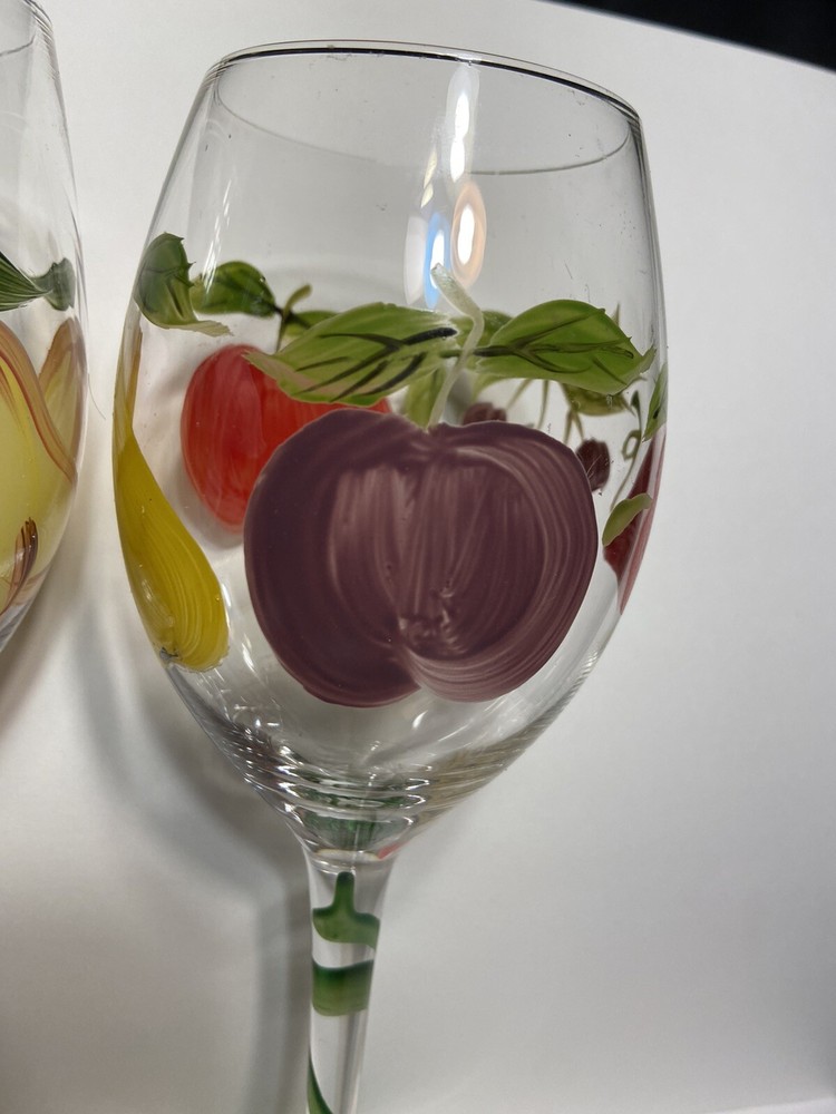 HomeHand Painted Fruit Wine Glasses Set of 2 with Pears Apples Grapes Plum Berry