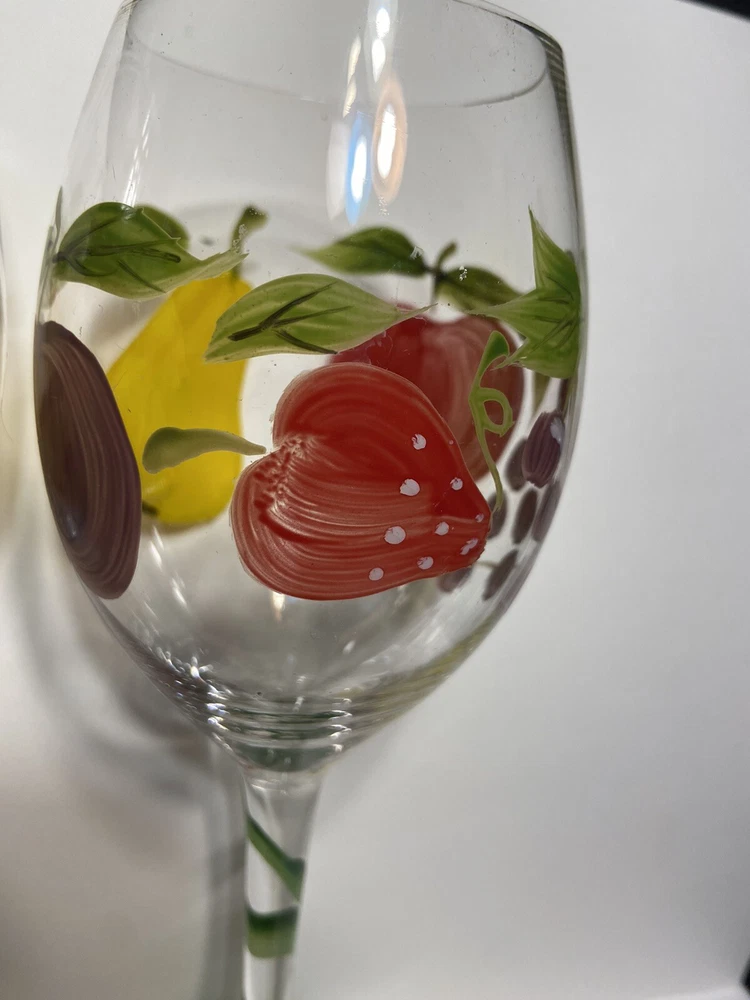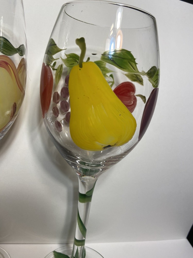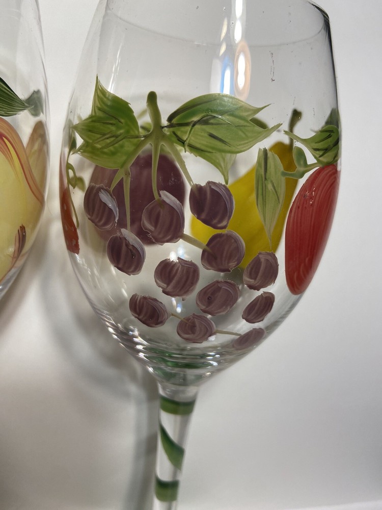 Hand Painted Fruit Wine Glasses Set of 2 with Pears Apples Grapes Plum Berry