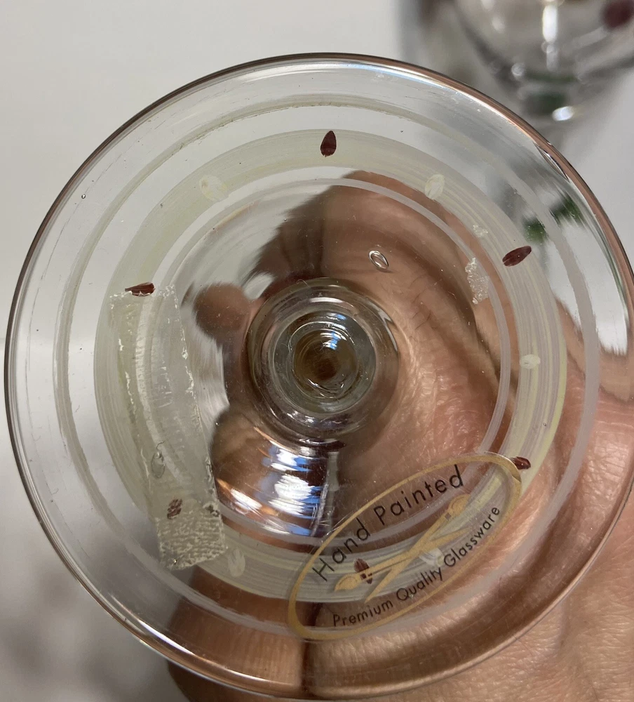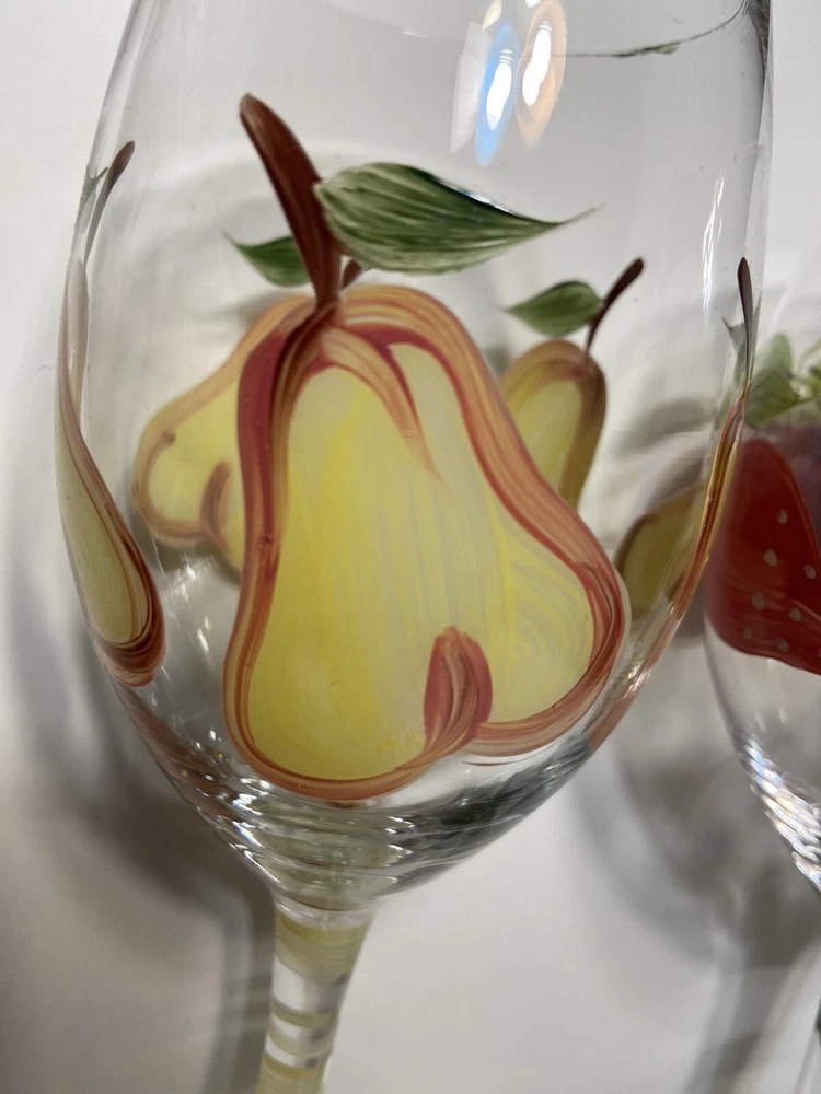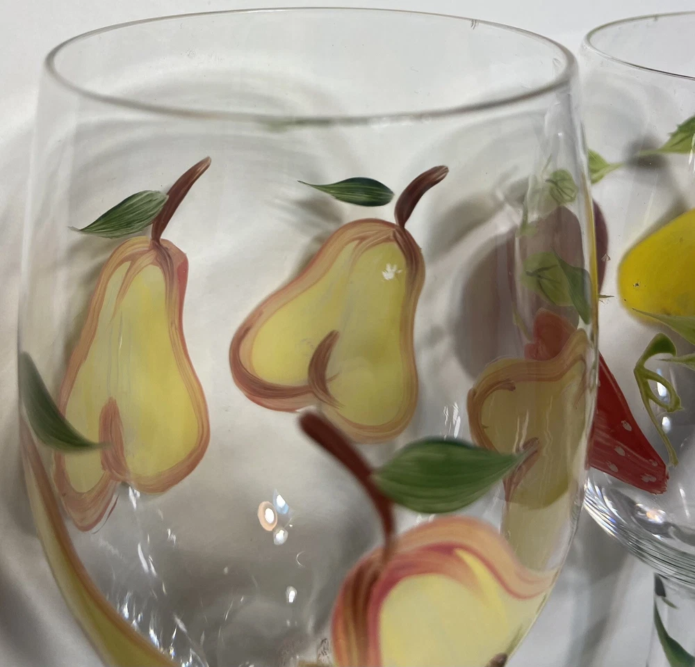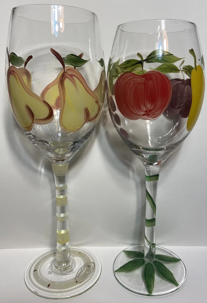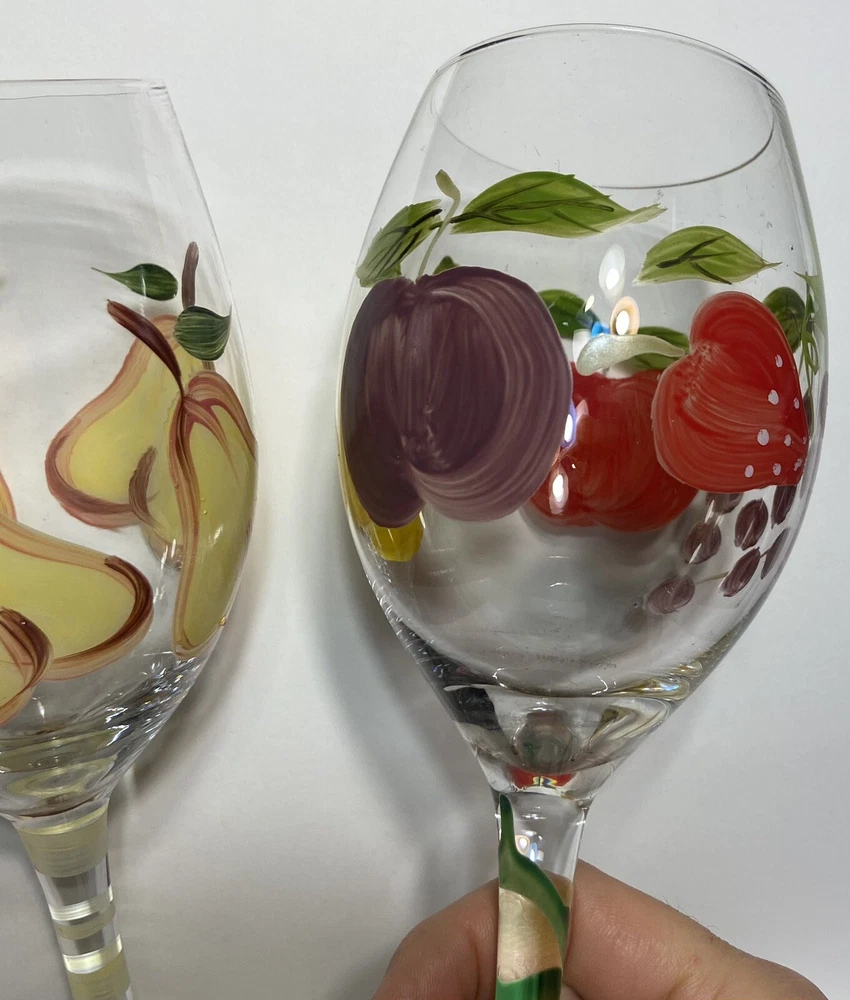 Number of Items in Set:Two-PieceFeatures:Hand PaintedCharacter:FruitShape:RoundMaterial:GlassBrand:UnbrandedColor:MulticolorDesign:RoundOccasion:All OccasionsSet Includes:Wine GlassStyle:ClassicCharacter Family:Apple, PearType:Wine GlassService For:2Theme:FruitCountry/Region of Manufacture:UnknownPattern:FruityGlassware Type:Wine GlassCapacity:12 OzDepartment:Adults