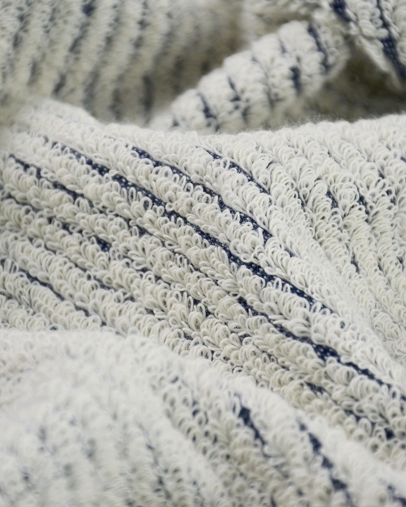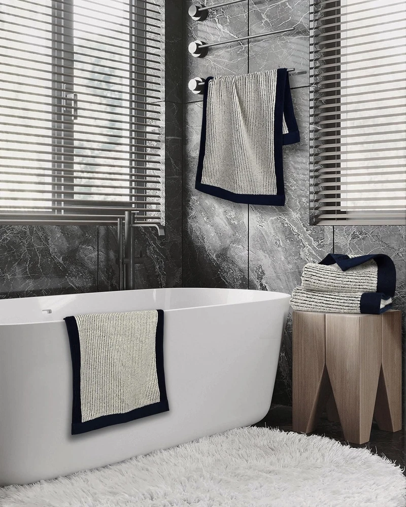 Decorative Hand Towels for Bathroom: The 4 hand towels are made of 100% cotton, the edges are wide navy-blue color, and the middle is white, individual textured lines; The stylish jacquard weaved design makes them both beautiful and practical, especially great for bathroom decoration Soft & Comfortable – Each hand towel has 56 intricately woven lines, each line has more than 1600 loops, so, each surface has more than 89,000 terry loops. This high-density texture provides a soft and gentle feel, perfect for everyday use Durable & Color-Fast – Thoughtfully designed with reinforced edges and double-stitched corners to enhance durability. The medium-weight 3.8 oz fabric strikes a balance between absorbency and breathability. Thanks to our reactive dyeing process, the colors stay vibrant wash after wash Long-lasting: We’ve poured care into every inch; Each 3.8 oz towel, perfect in its medium thickness, boasts edges that are diligently reinforced; Corners? Double-stitched for longevity; And with our reactive dyeing process, you’ll find the colors remain bright and fresh, wash after wash For Every Occasion: Whether you're decking out your guestroom, need a gym companion, want a stylish presence near your kitchen sink, or looking for a thoughtful gift, our set of 4 towels has got you covered; The jacquard design isn't just an aesthetic choice; it's a statement of elegance