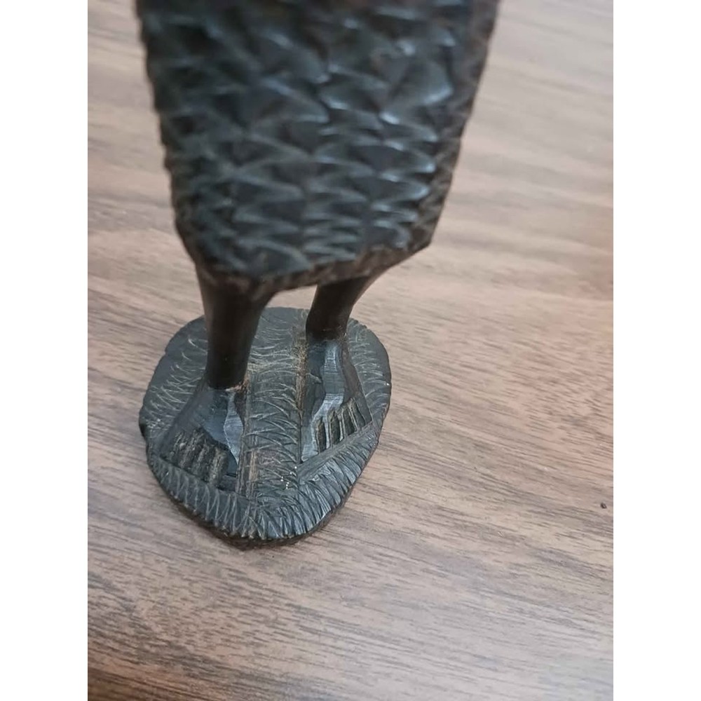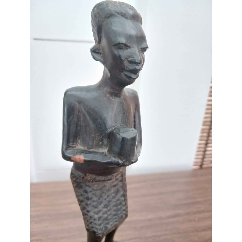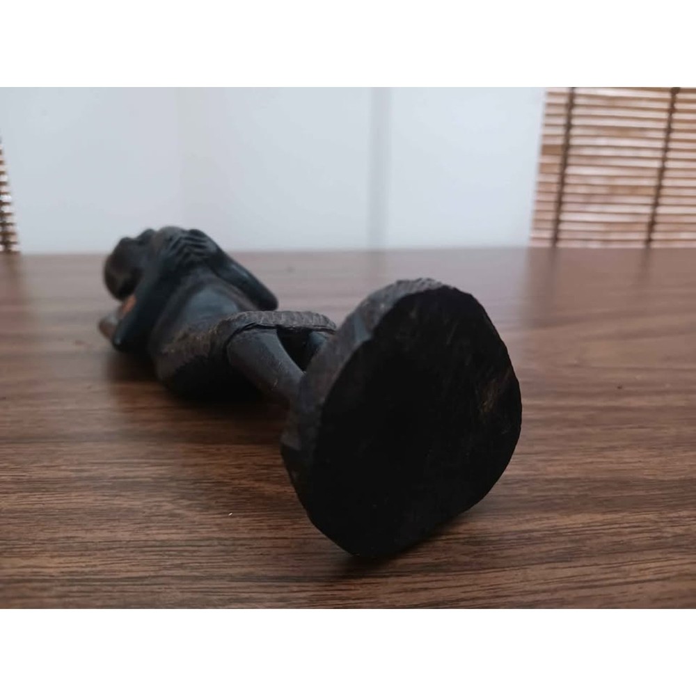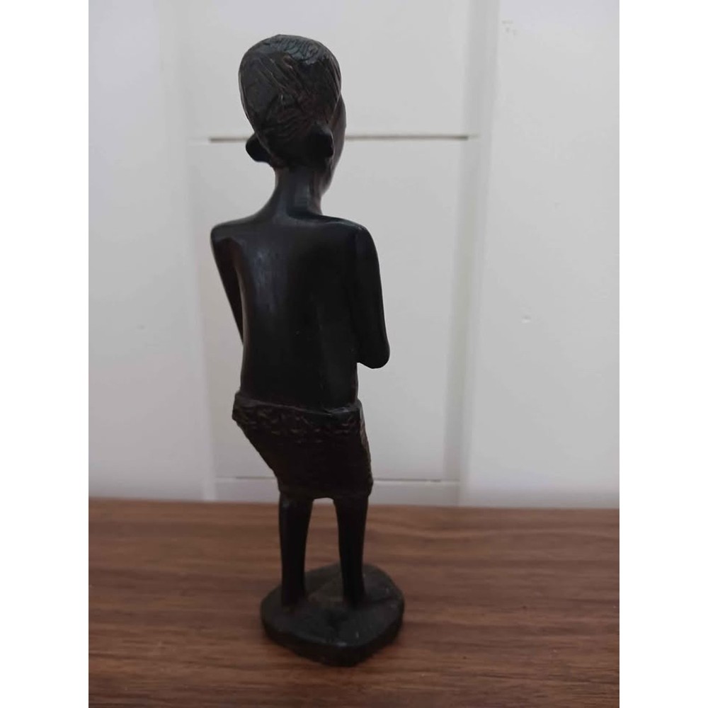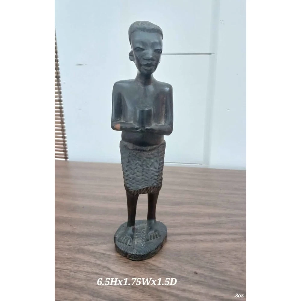 This hand-carved African wood sculpture is a unique and beautiful piece of art. The intricate details and craftsmanship are truly remarkable, making it a wonderful addition to any home or office. The rich, warm tones of the wood bring a touch of nature and culture into your space. This sculpture is perfect for collectors, art enthusiasts, or anyone who appreciates handcrafted items. It makes a thoughtful and unique gift idea as well. Add this exquisite piece to your collection today! 6.5Hx1.75Wx1.5D