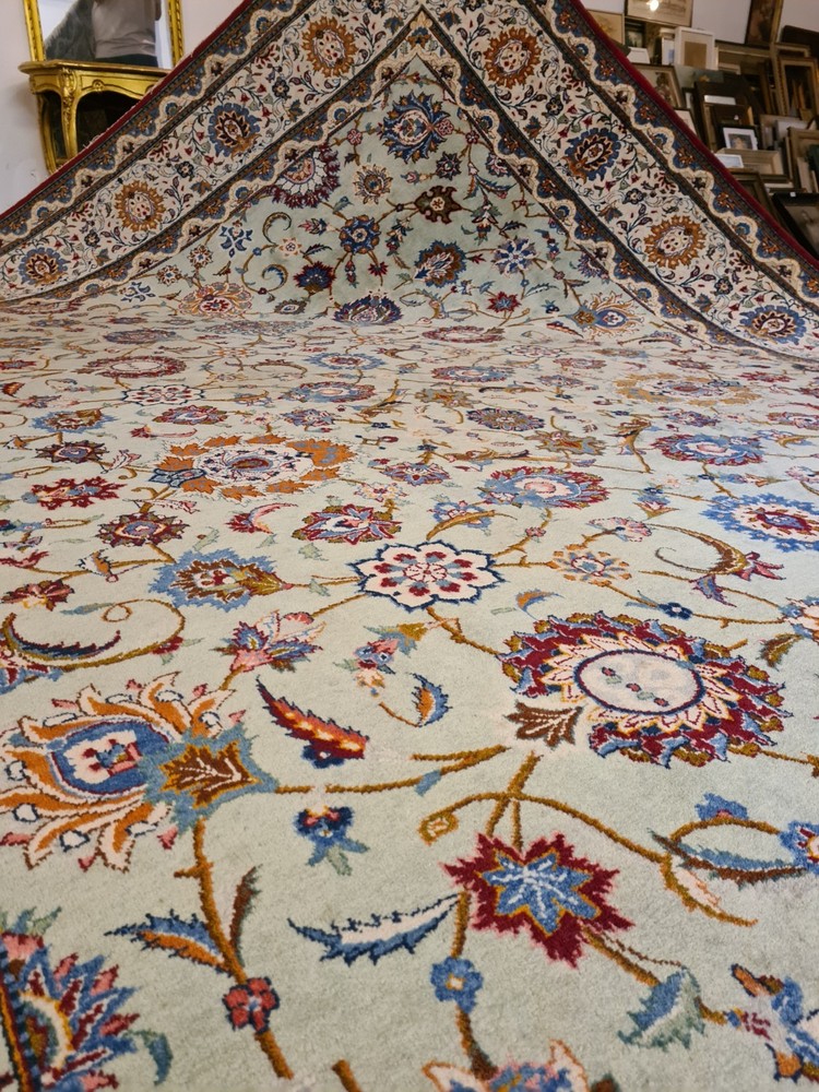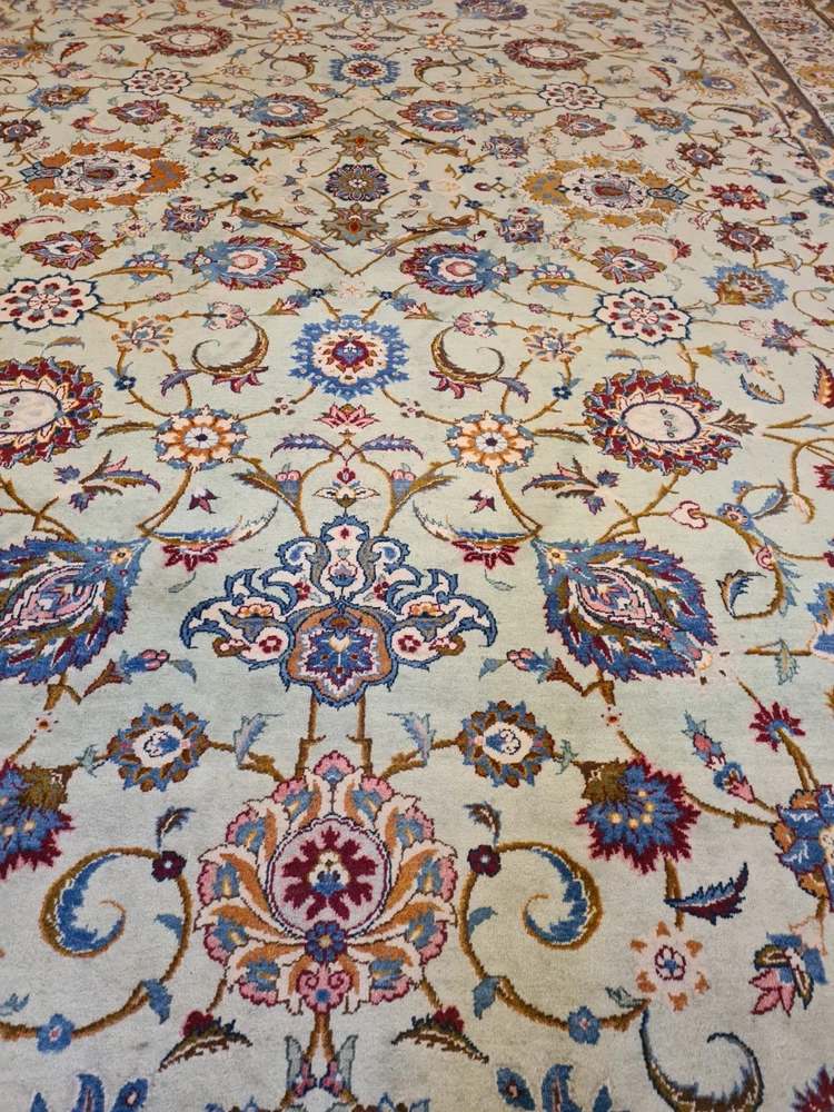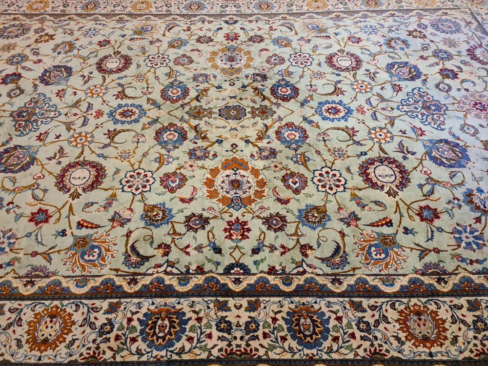 Königlicher Handgeknüpfter Orientteppich – Perser Keshan Palast-Teppich Erleben Sie den majestätischen Charme des antiken Perser Keshan Palast-Teppichs . Mit seiner exquisiten Pistazien grünen Farbgebung und dem durchlaufenden Blumenmuster, das sich über die gesamte großzügige Fläche von 404 cm x 268 cm erstreckt, ist dieser Teppich ein atemberaubendes Beispiel persischer Handwerkskunst. Dieser Teppich wurde vor etwa 70 Jahren aus feinster Korkwolle gefertigt, die auf einer robusten Wollbasis geknüpft ist, und verfügt über eine beeindruckende Knotendichte von 350.000 Knoten pro Quadratmeter. Details: Farbe: Pistaziengrün Muster: Durchlaufende Blumen Material: Feinste Korkwolle auf Wolle Knotendichte: 350.000 Knoten pro Quadratmeter Maße: 404 x 268 cm Artikelnummer: GJ/BL139 Zustand: Sehr gut Besonderheit: Feinste Korkwolle Alter: 70 Jahre Höhepunkte: Elegantes Blumenmuster: Das durchlaufende Blumenmuster dieses Keshan Palast-Teppichs ist eine Hommage an die Natur und füllt den Raum mit seiner harmonischen und doch lebhaften Darstellung floraler Motive. Es symbolisiert das ewige Leben und die beständige Schönheit, die jeden Raum in eine Oase der Ruhe verwandelt. Luxuriöse Korkwolle: Dieser Teppich ist aus feinster Korkwolle gefertigt, die für ihre außergewöhnliche Weichheit und Widerstandsfähigkeit bekannt ist. Korkwolle ist eine seltene und hochwertige Form von Schafwolle, die den Teppich besonders luxuriös und langlebig macht. Hervorragende Handwerkskunst: Mit einer Knotendichte von 350.000 Knoten pro Quadratmeter zeigt dieser Teppich eine beispiellose Präzision und Detailtreue. Diese hohe Knotendichte ermöglicht es, komplexe und filigrane Muster mit außergewöhnlicher Klarheit darzustellen, was den Teppich zu einem wahren Kunstwerk macht. Imposante Größe: Mit seinen beeindruckenden Maßen von 404 cm x 268 cm ist dieser Teppich ideal für große Räume oder Empfangshallen. Er setzt ein markantes Statement und verleiht Ihrem Zuhause eine königliche Eleganz. Königlicher Keshan: Keshan-Teppiche sind weltbekannt für ihre edlen Designs und die meisterhafte Knüpftechnik. Dieser Palast-Teppich ist ein Paradebeispiel für die hervorragende Qualität und das traditionelle Design, das Keshan-Teppiche auszeichnet. Sehr guter Zustand: Obwohl dieser Teppich bereits 70 Jahre alt ist, ist er in einem bemerkenswert guten Zustand. Die Farben sind kräftig und leuchtend, und die Struktur ist fest und unbeschädigt, was ihn besonders wertvoll für Sammler und Liebhaber antiker Teppiche macht. Besonderheit: Dieser Perser Keshan Palast-Teppich besticht durch seine außergewöhnliche Farbgebung in Pistaziengrün und seine exquisite Verarbeitung aus feinster Korkwolle. Seine Größe und seine künstlerischen Details machen ihn zu einem zentralen Element jeder Raumgestaltung. Dieser Teppich ist nicht nur ein dekoratives Stück, sondern auch ein Ausdruck von Luxus und kulturellem Reichtum. Er bietet eine seltene Gelegenheit, ein Stück persischer Geschichte und Handwerkskunst zu besitzen und zu schätzen.