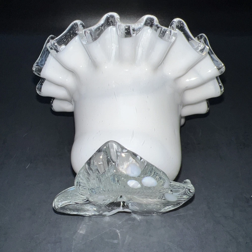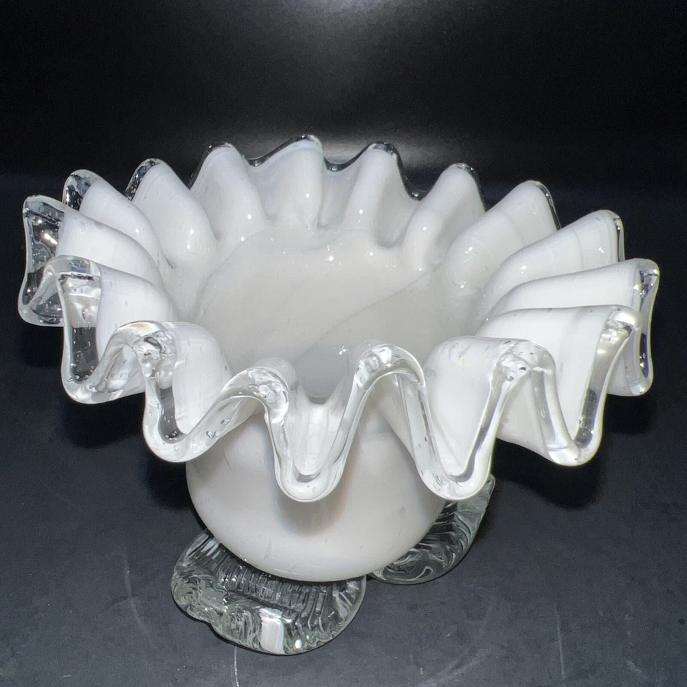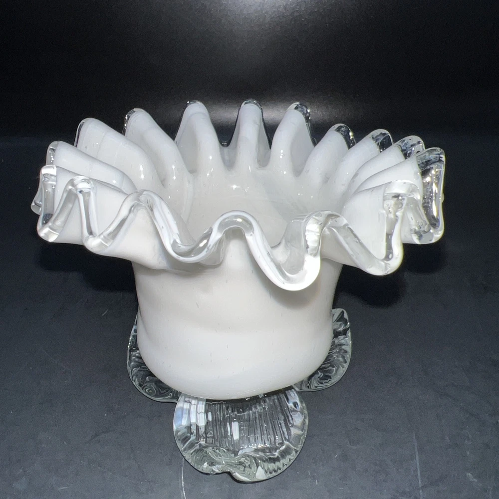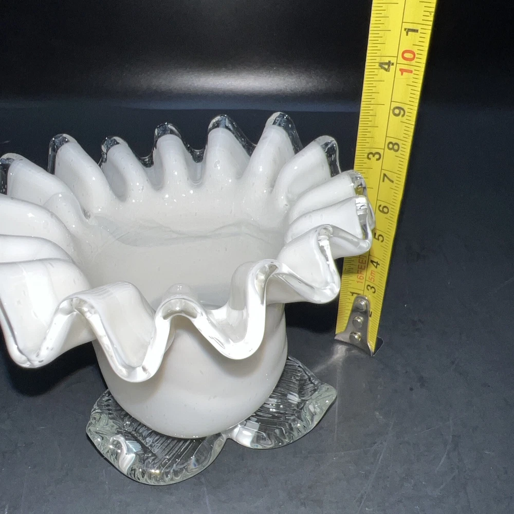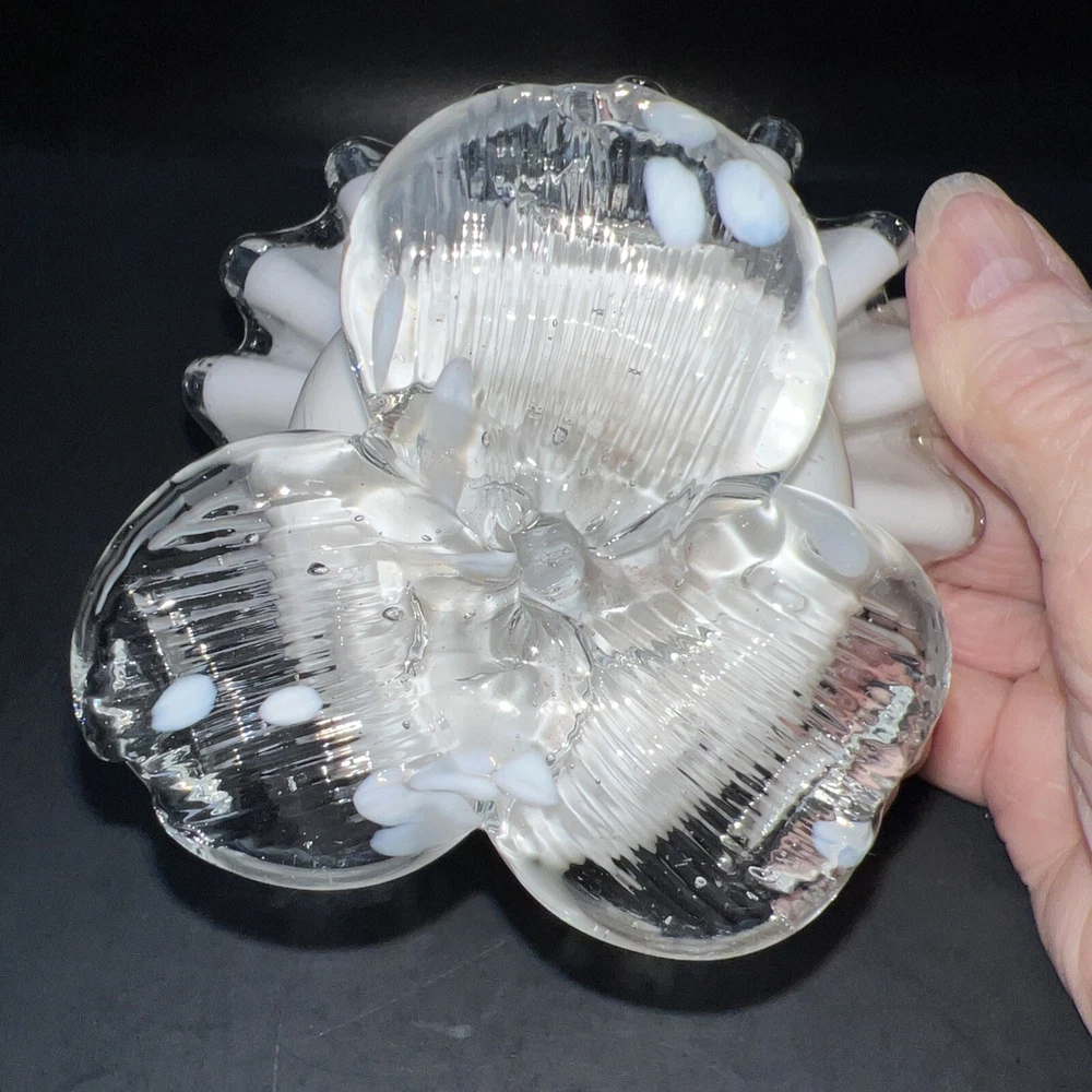 This exquisite piece of hand-blown art glass is sure to catch your eye. The flower-shaped tea light holder features a beautiful white swirl pattern and silver crested edges that give it an elegant and luxurious look. The glass is of the highest quality and has been expertly handcrafted to create a unique and one-of-a-kind piece. This tea light holder is suitable for any home decor style and is perfect for adding a touch of sophistication to your living space. The holder is handmade and features intricate details that make it a true work of art. Whether you're a collector of art glass or just someone who appreciates beautiful things, this tea light holder is sure to impress. I will pack with care and get it to you ASAP Thank you for looking !