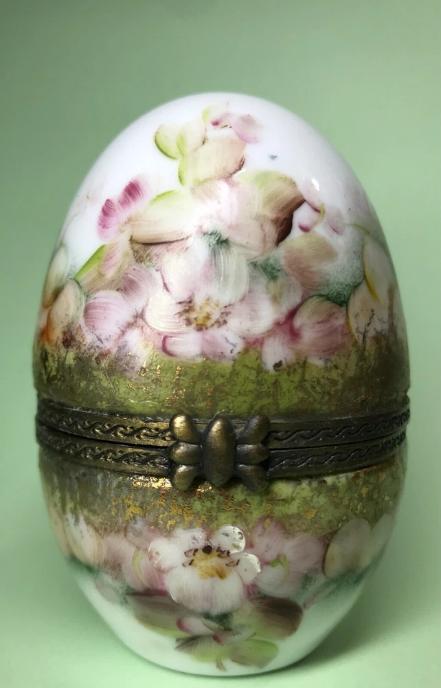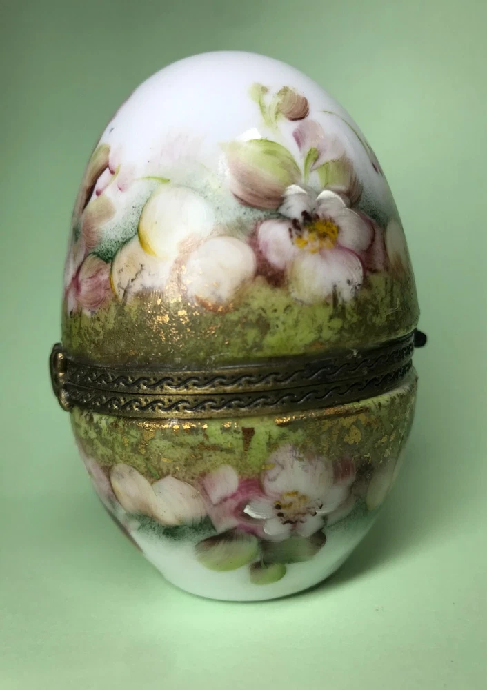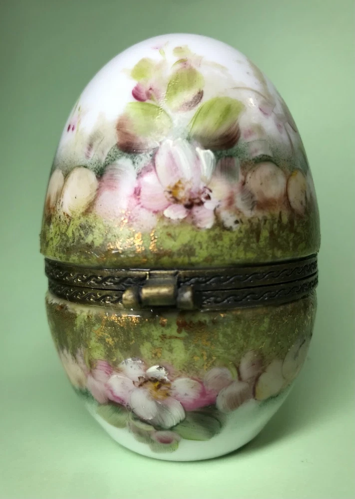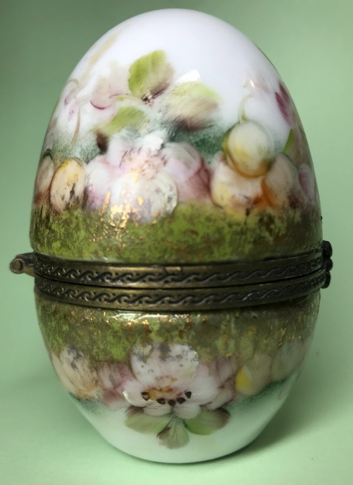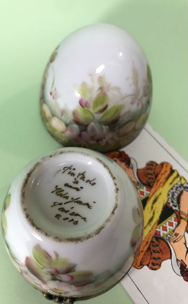FROM MADEIRA WITH LOVE.... Found in an estate liquidation on the island of Madeira in Portugal, that of a family with ties to France. Purchased a decade ago at the Flea Market in Paris, a hand painted trinket box in the form of an egg. It stands 3 inches tall and was signed by the artist and dated 2006. Additionally marked "Peinte a`la Main" for hand painted. The artist name is i mpossible to decipher. It has survived in good condition, free of chips or cracks, no abrasions. I did notice a small drop of hardened glue on the inside of the lower half that I have left as found. I have inserted a standard size playing card in one photo as a reference for size. MUCH OBLIGED