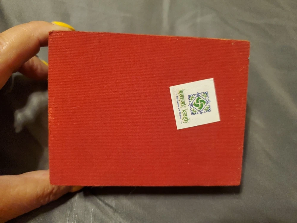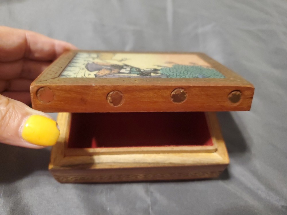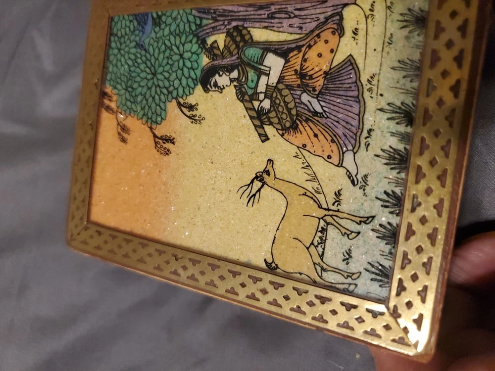 This is a Stone Dust Rajasthani Art Hand-Painted Jewelry/Trinket Box. This handcrafted box is made of wood and features a painting on its lid, depicting traditional Rajasthani scenery figures like the woman and deer in the image. The painting is created using finely crushed real gemstones on a glass base, a traditional art form from Rajasthan, India. It has a brass border and a glass is Inlaid over the painted lid. The inside is llined with red felt. These boxes are commonly used for storing jewelry or small keepsakes and are considered collectible items due to their artistic and cultural value.