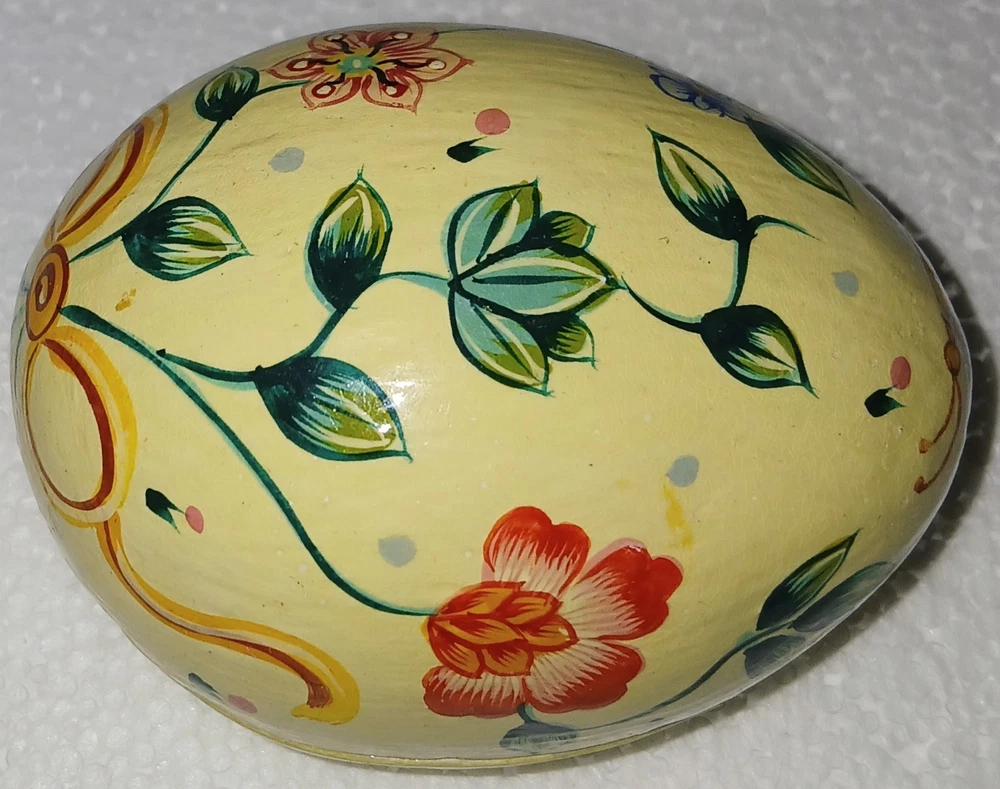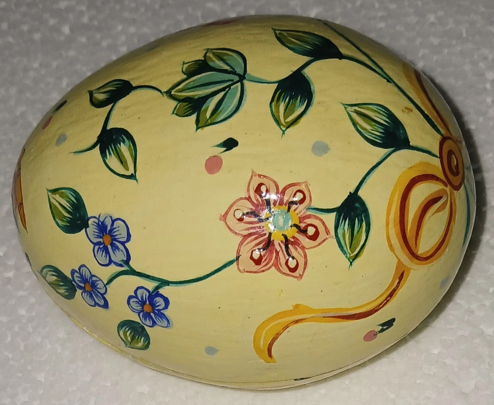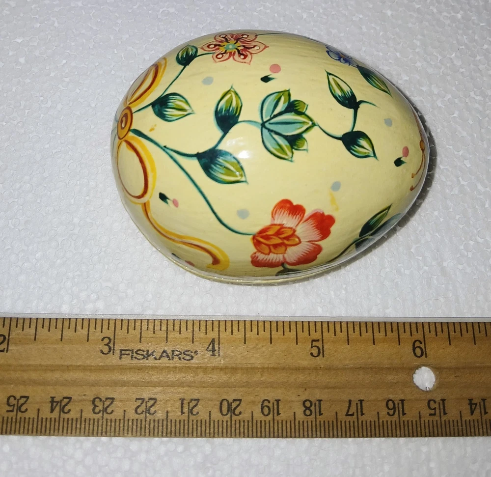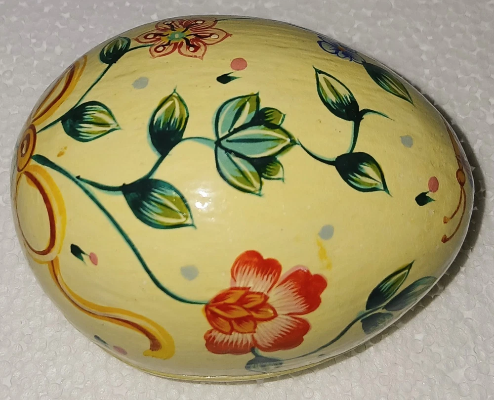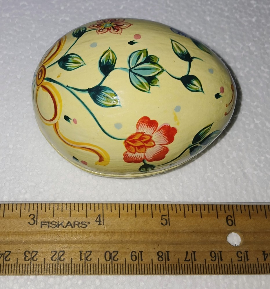 KASHMIR INDIA TRINKET BOX, egg shaped 1.) PLEASE CHECK THE EXPECTED DELIVERY DATES 2.) PLEASE BE PATIENT, there's a longer handling time on my auctions, but I try to ship faster... I work around chemo, dialysis and I'm mostly paralyzed so I rely on family members in their spare time for all of my shipping+ 3.) KASHMIR INDIA LIDDED TRINKET BOX 4.) MEASURES 3" LENGTH X 2-1/4" WIDE X 2-1/4" TALL 5.) HAND PAINTED AND LACQUERED 6.) EXCELLENT CONDITION WITH VERY BRIGHT VIBRANT COLORS 7.) I DO COMBINE SHIPPING AND ANY OVERPAID AMOUNT IS REFUNDED ***