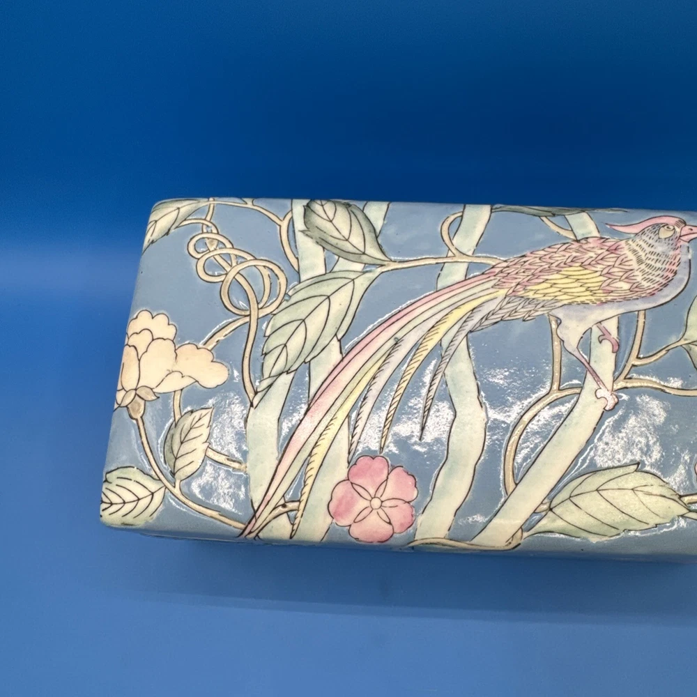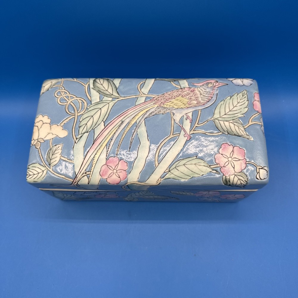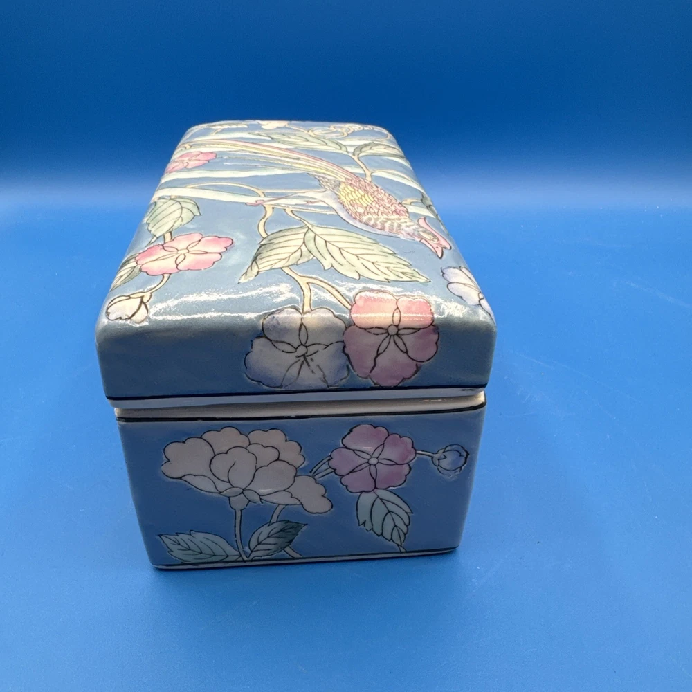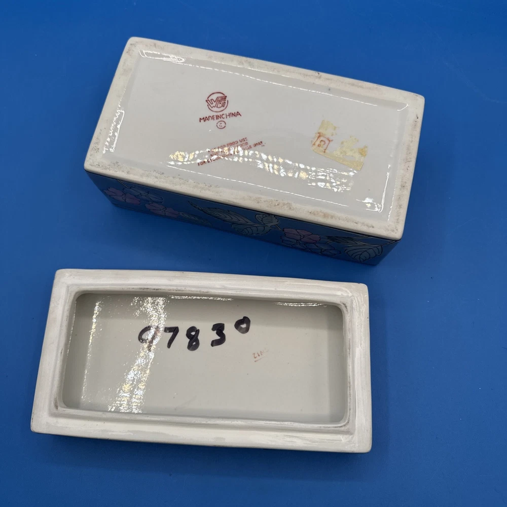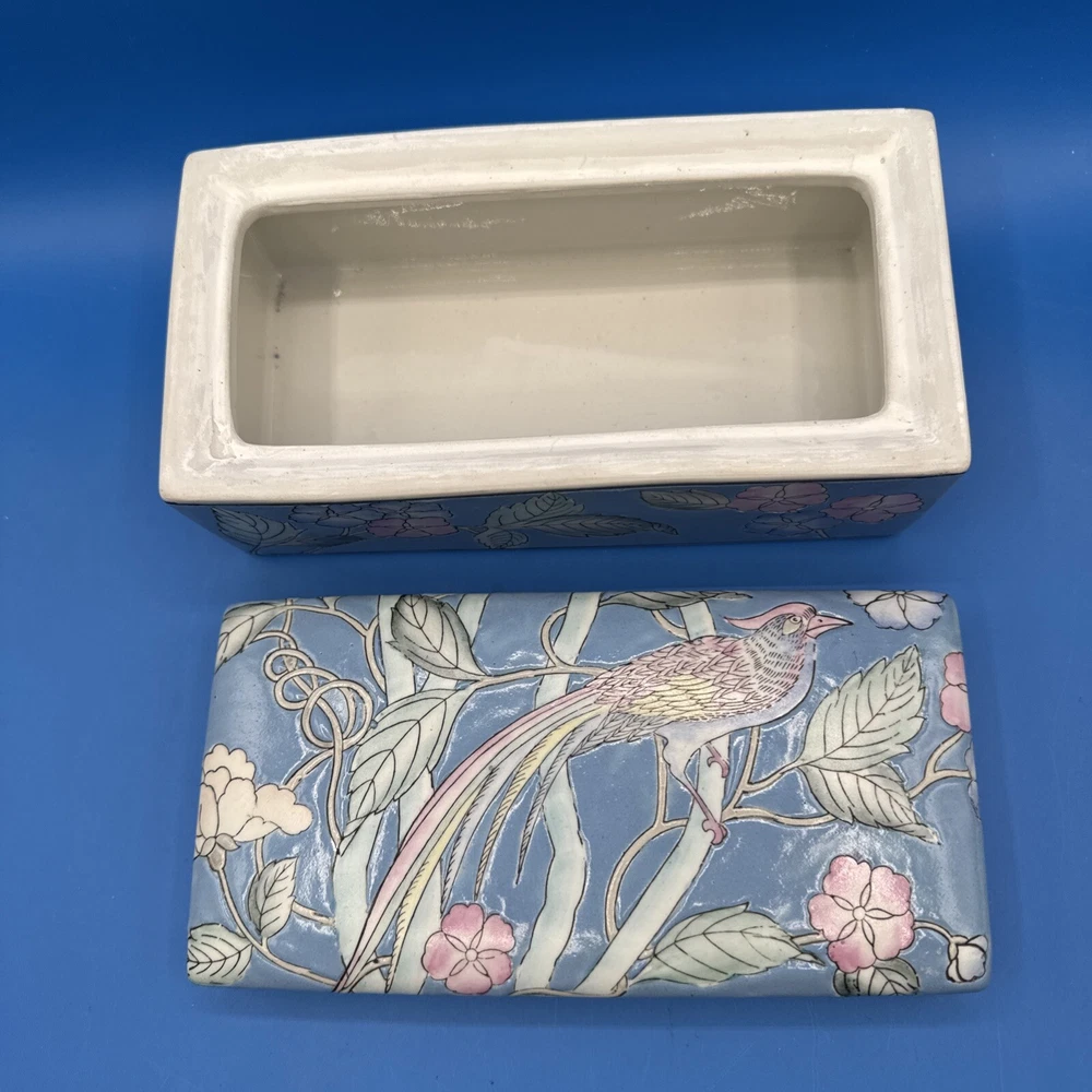 This is a WBI porcelain trinket box featuring a hand-painted design of a bird of paradise. The trinket box is rectangular in shape, with multicolor detailing. It measures 8.25 inches in length, 4.5 inches in width, and 3 5/8 inches in height. Made in China, this decorative piece is suitable for any room and is crafted from porcelain. Pre-owned excellent condition. No cracks or damages. No original box. Please check the pictures carefully as part of the description. Feel free to ask questions if you need more information before you buy it. Thank you for your interest B-10