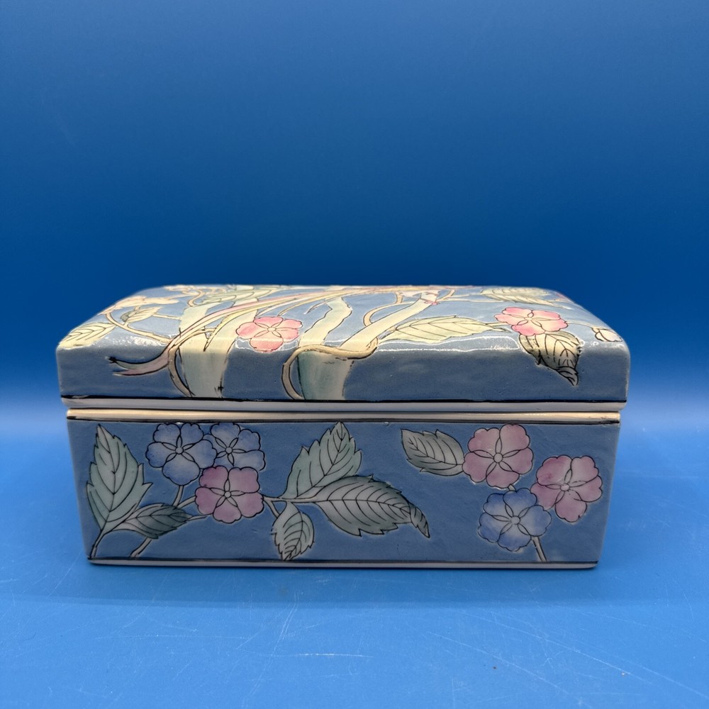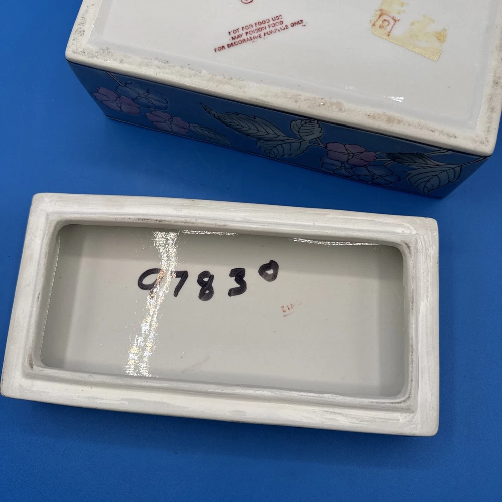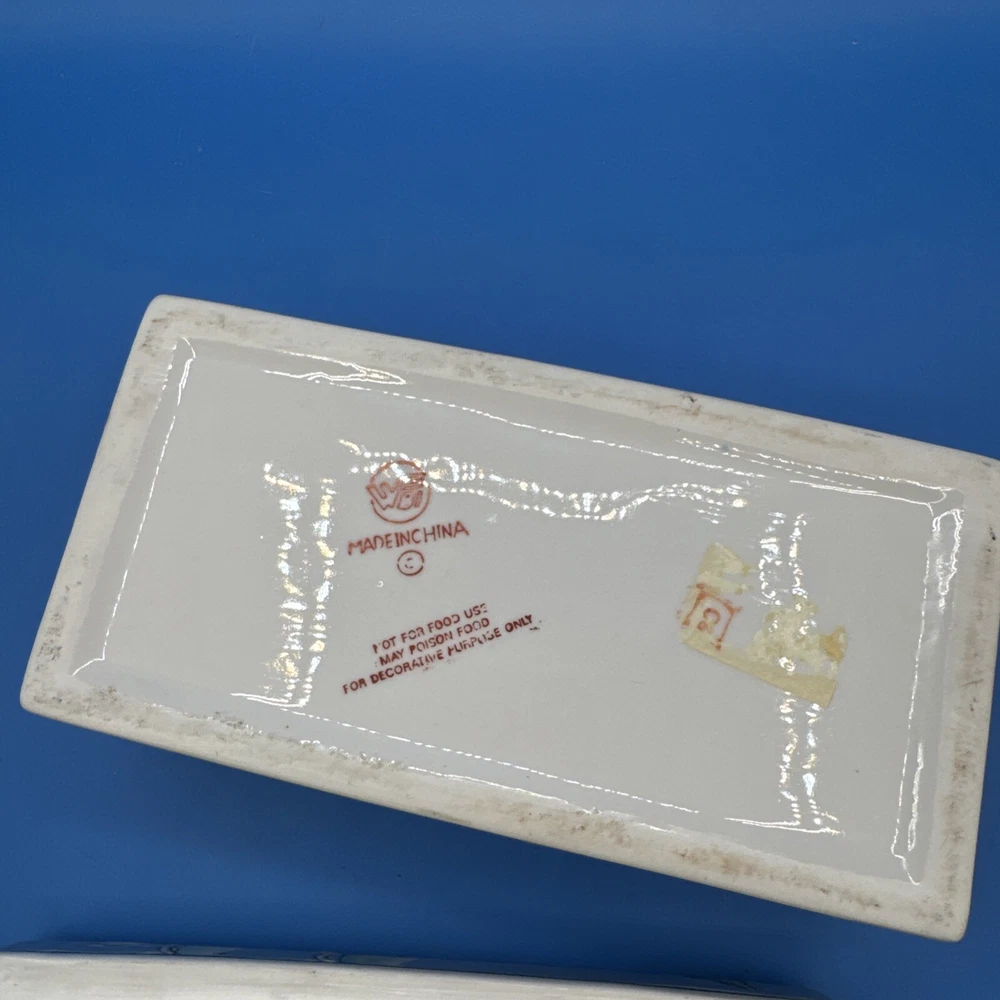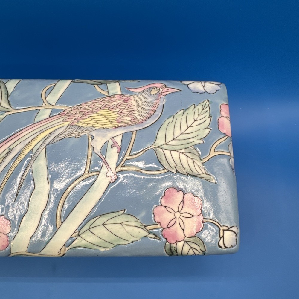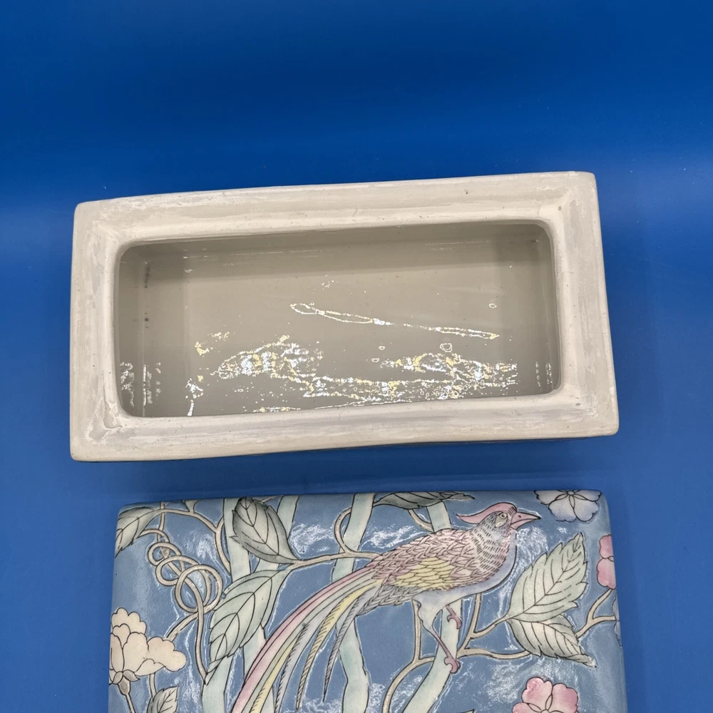 This is a WBI porcelain trinket box featuring a hand-painted design of a bird of paradise. The trinket box is rectangular in shape, with multicolor detailing. It measures 8.25 inches in length, 4.5 inches in width, and 3 5/8 inches in height. Made in China, this decorative piece is suitable for any room and is crafted from porcelain. Pre-owned excellent condition. No cracks or damages. No original box. Please check the pictures carefully as part of the description. Feel free to ask questions if you need more information before you buy it. Thank you for your interest B-10