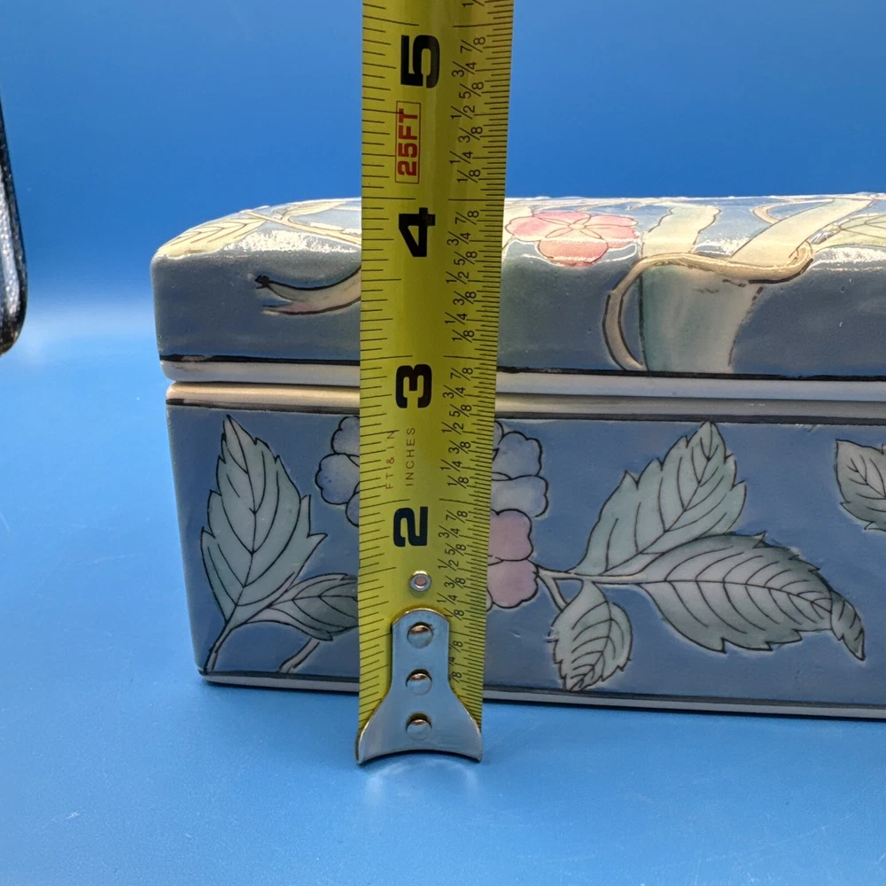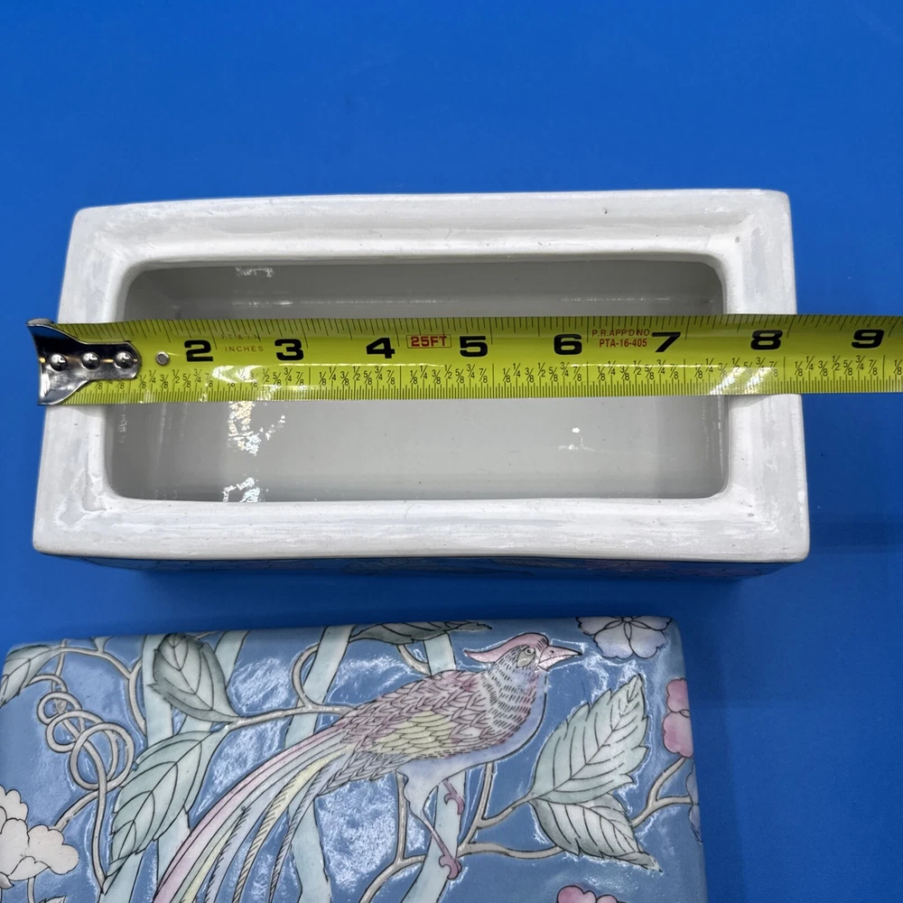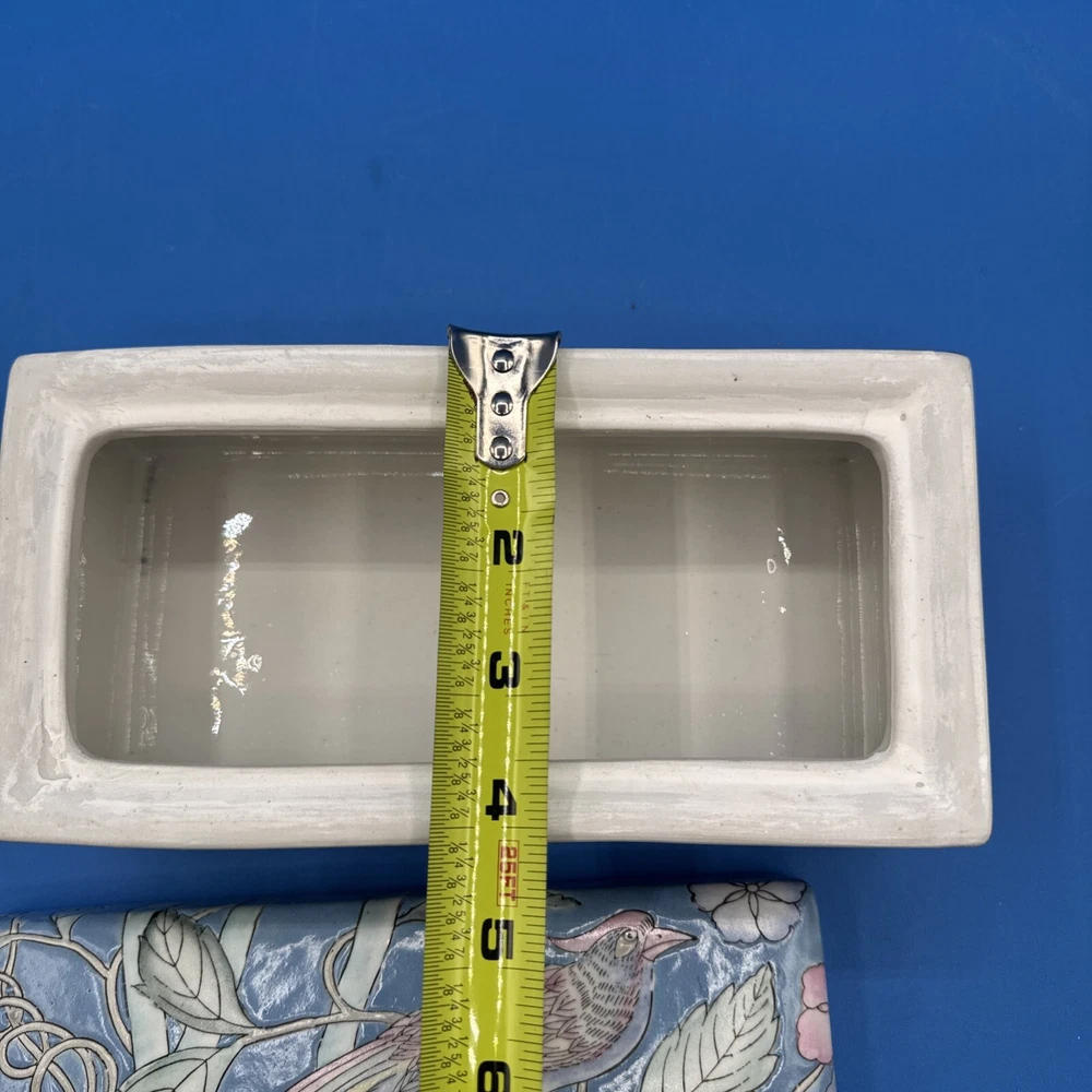 Item Height: 3 5/8 Subject: Bird Country/Region of Manufacture: China Type: Trinket Box Room: Any Room Material: Porcelain Color: Multicolor Item Width: 4 1/2 Item Length: 8.25 in Shape: Rectangle Brand: WBI Features: Hand Painted