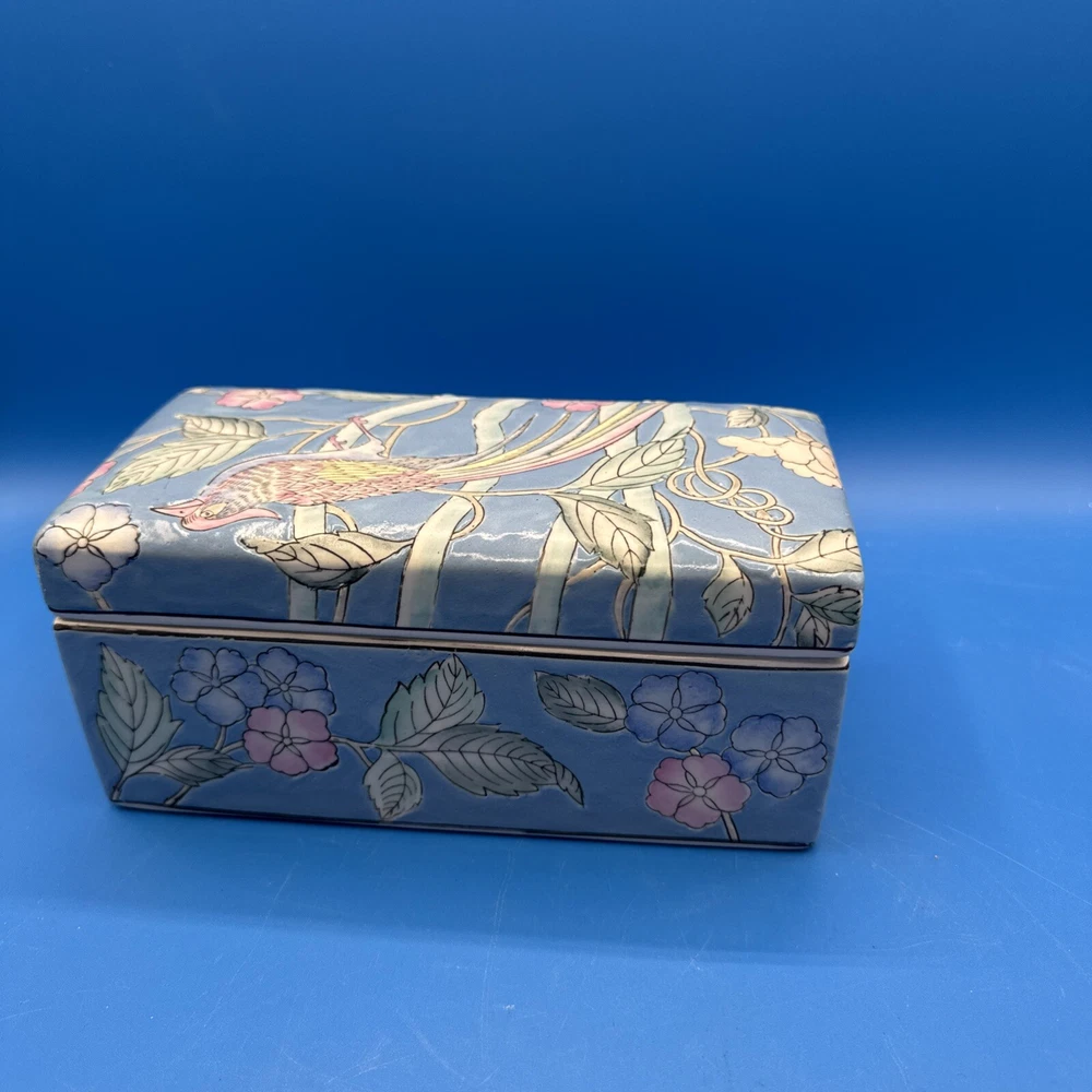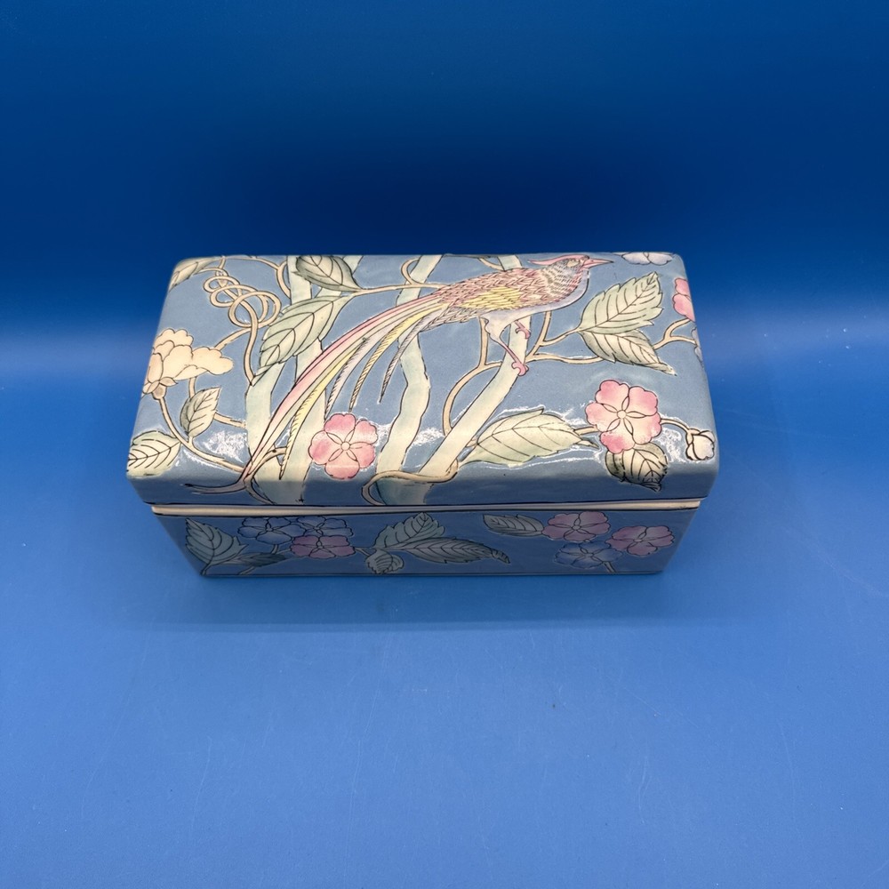 Hand-Painted Porcelain Blue Trinket Box with Bird of Paradise