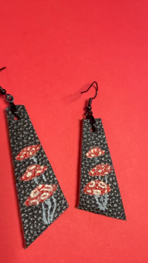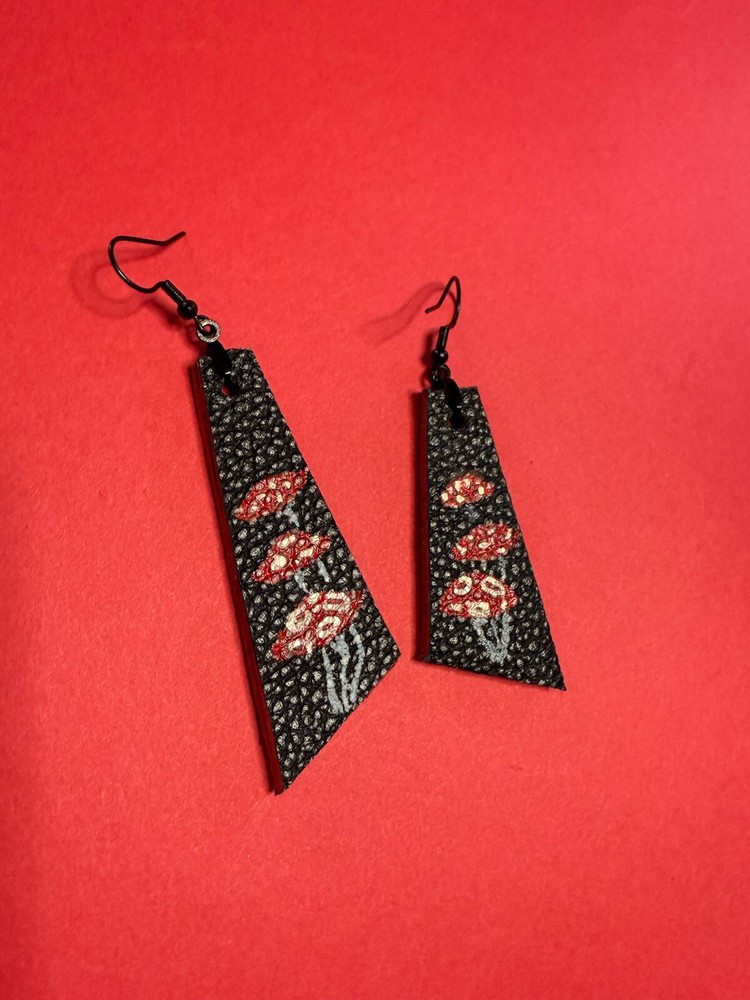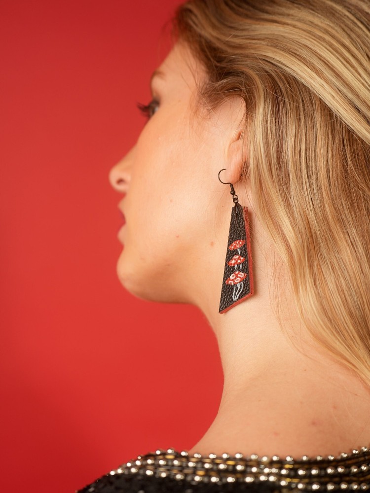 Make a statement and express your unique style with these one-of-a-kind earrings, hand-painted by our SPARK + REBEL team. DETAILS: Crafted from upcycled leather scraps, these black earrings are all about edgy, sustainable fashion. Featuring a bold red-and-white mushroom print, they’re designed to stand out and spark conversations. The high-quality 925 silver hooks add a touch of elegance while ensuring durability, so you can rock these beauties with confidence. STYLING: Pair these creative earrings with a simple black turtleneck and jeans to let them take center stage, or add them to a playful, colorful outfit for a quirky and fun vibe. ABOUT US: We’re your go-to sustainable fashion blog, making the world mindful, stylish, and eco-friendly one outfit at a time. Shopping at Sparkpick means joining a movement that champions sustainability, minimalism, self-expression, and supports causes like Fashion Revolution and Art for Change. SUSTAINABILITY: We’re committed to looking good and doing good. We offset carbon emissions with Klima, plant trees with One Tree Planted, and ship our garments in recyclable boxes made from post-consumer waste.