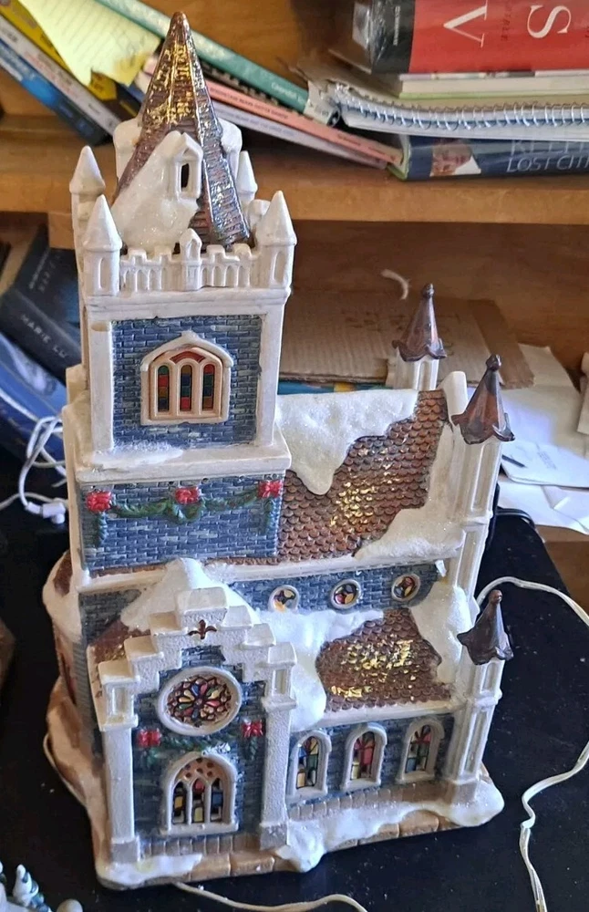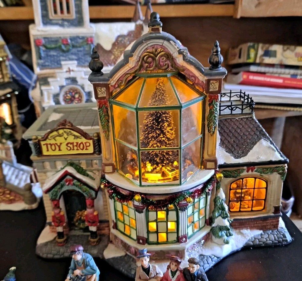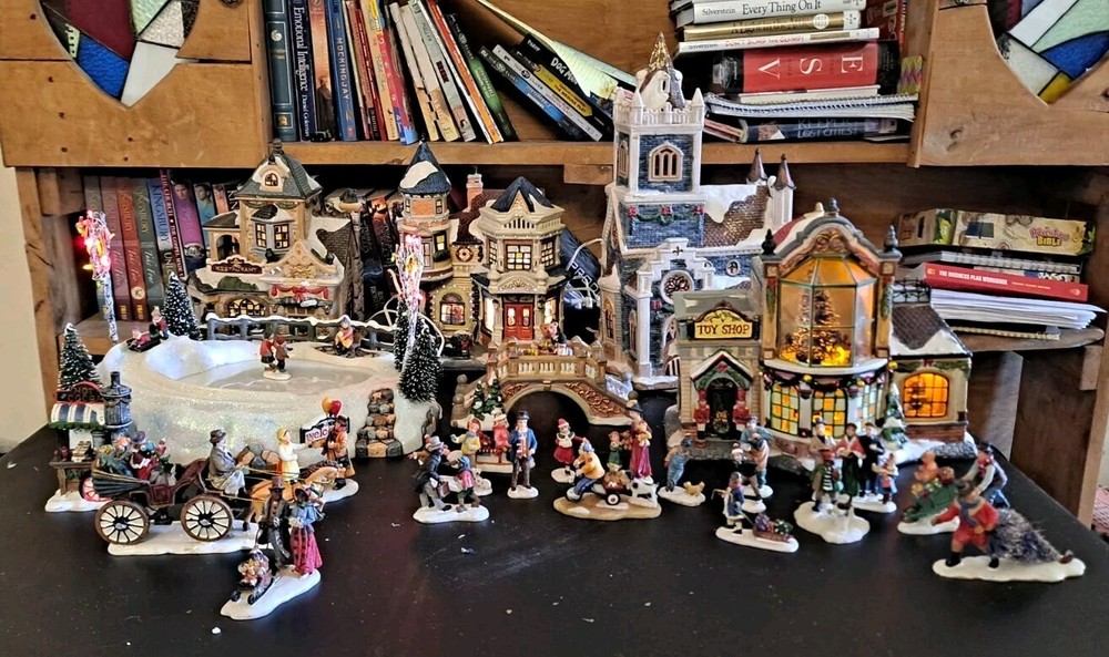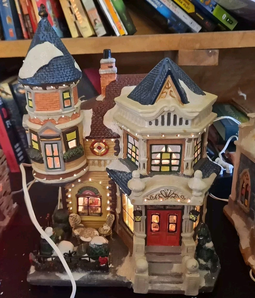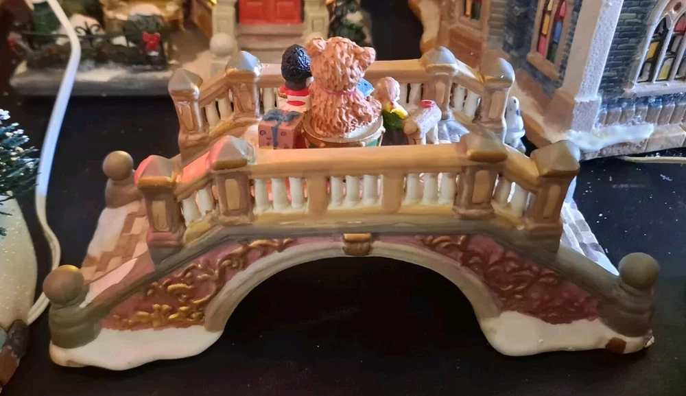 In some of my recent treasure hunting I came across this 2006 Members Mark Victorian Village Hand Painted Christmas Set. I hope to bring it to someone who will enjoy the set for the Christmas holiday as it is truly a beautiful set. This 2006 Members Mark Victorian village is in Very Good condition. In this set is: 1. The Restaurant: Needs replacement bulb, but the motor works fine. There are no broken or missing parts or pieces. 2. The House: The motor and lights all work on the house. There are no broken or missing parts or pieces to the house. 3. The Church: The light nor the motor seem to work on this building. There are no broken or missing parts or pieces to the Church. 4. The Ice Sakting Rink: All the lights work as they should and there are no broken or missing parts or pieces to the Ice Skating Rink. 5. The Bridge: There are no broken or missing parts or pieces tot he Bridge. 6. Figurines: All the Figurines that come with the set are included and there are no broken or missing parts or pieces except to the eddy Bear Toy Store Figurine. 7. Set comes with all of the power chords to the main set and to the street lamps. 8. Set comes with the original figurine picture chart. 9. All the street lamps come with the set and both sets have been tested and work as they should. There are no broken or missing parts or pieces to the street Lamps. 10. Set comes with some extra small screws 11. Set comes with fake snow.