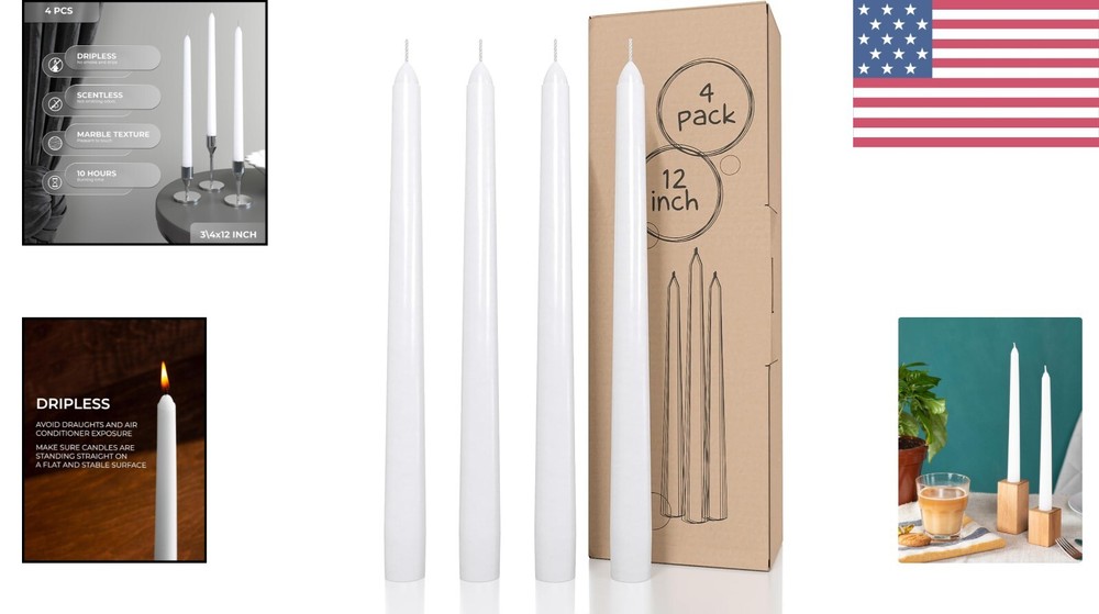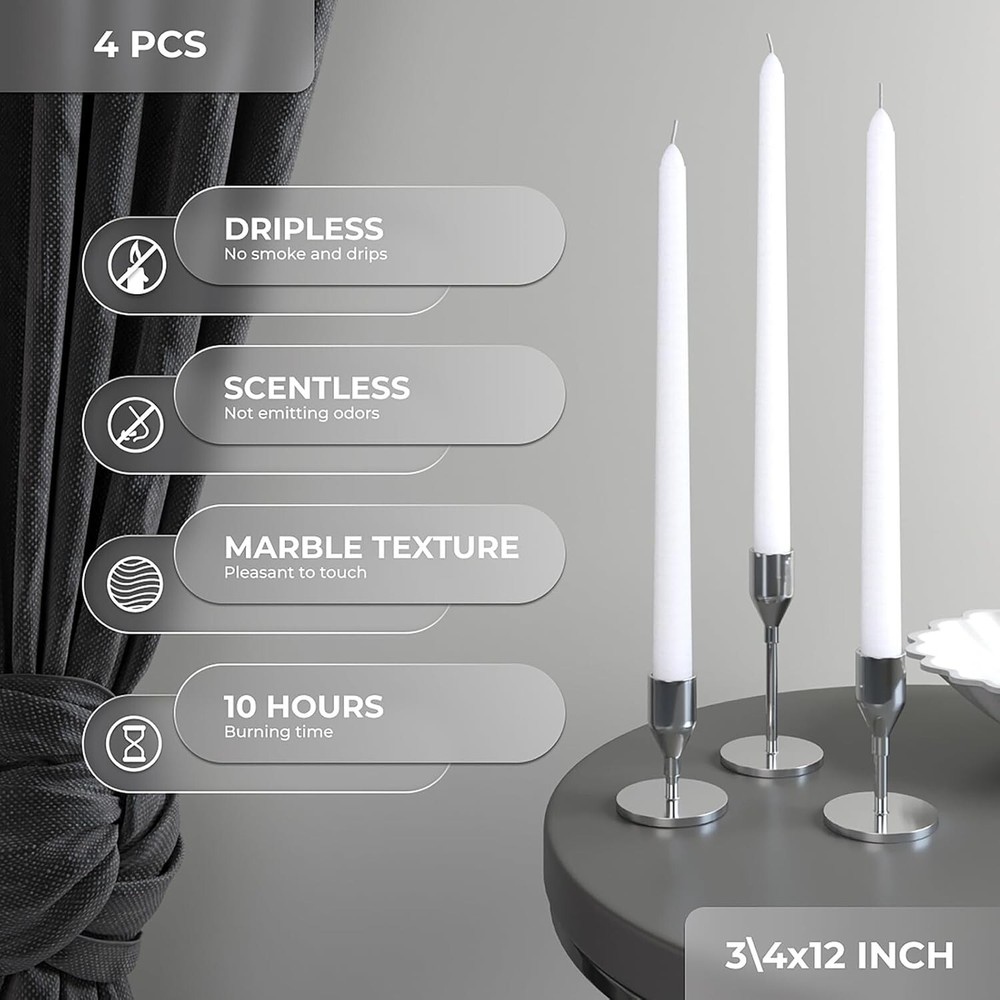 Scent: Unscented Theme: Classic Indoor Outdoor Usage: Indoor Style Name: Classic Unit Count: 4 Count Material: Paraffin Wax Wick Quantity: 4 Material Features: Does Not Drip, Unscented Indoor/outdoor Usage: Indoor Shape: Round Additional Features: Dripless,long Burning,smokeless,unscented Are Batteries Included: No Size: Large Number Of Items: 4 Specific Uses For Product: Wedding Type: Taper Candle Batteries Are Included: No Product Dimensions: 0.75"w X 12"h gtin13: Does not apply Scent Name: Unscented Material Type: Paraffin Wax Container Type: No Container Seasons: All Season Customized: No UPC: Does not apply Item Height: 30.48 Centimeters Number in Pack: 4 Item Weight: 10.4 oz Burning Time: 10 hrs Personalize: No Item Dimensions W X H: 0.75"w X 12"h Container Material: Containerless Style: Classic Candle Type: Taper Candle Brand: Unbranded Occasion: Wedding Features: Dripless, Long Burning, Smokeless, Unscented Handmade: Yes Room: Indoor Color: White