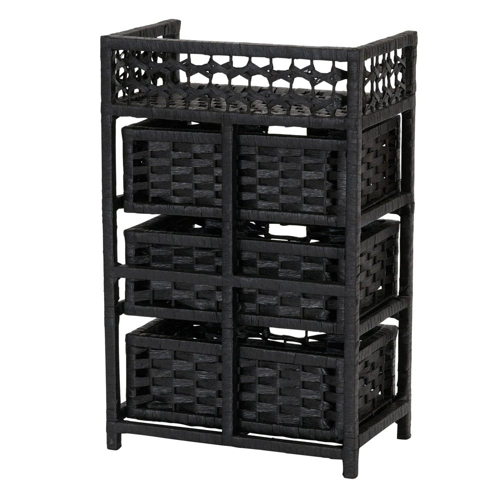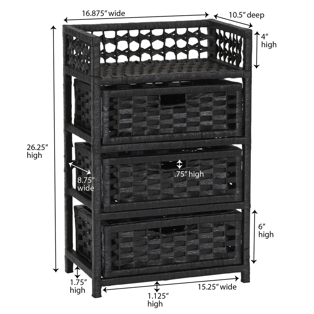 Tuck these compact 3-Drawer Chests into the nooks and crannies of your home and make the most of every cranny. Hand-woven, these paper rope chests are sturdy and beautiful, with a winsome charm that turns any space into an instant haven. Keep in the bathroom for linens, towels, and extra rolls of paper; place a bowl on the open top shelf filled with washcloths and soaps for a stylish and practical flourish. Place in the hall or closet to scarves and gloves, magazines, or anything else! Bring a little understated elegance to your world with these chic black chests and keep it all in order. Hand-woven, paper rope 3-Drawer Unit. Open top shelf. Finished with a chic black stain and protective coating. Humidity tested. Dimensions: 26. 4" H x 16. 9" W x 10. 6" D. Designer styled 3 drawer chest for use in any room Paper rope wicker Sturdy wood frame Black color Measures 26. 38-Inch high by 10. 63-Inch deep by 16. 93-Inch wide