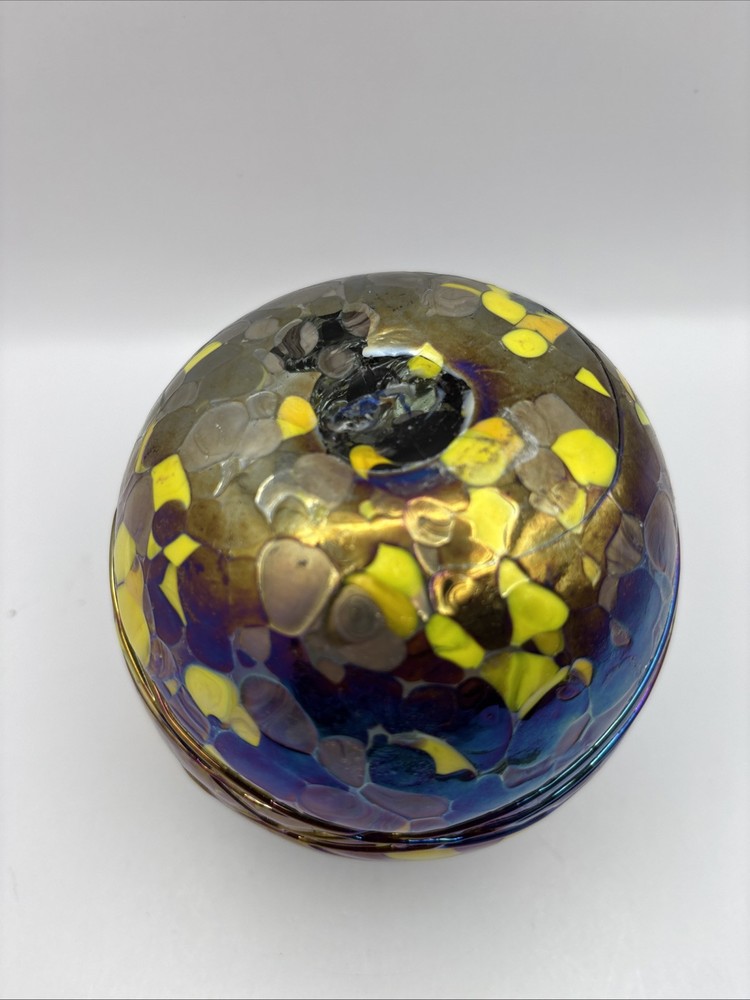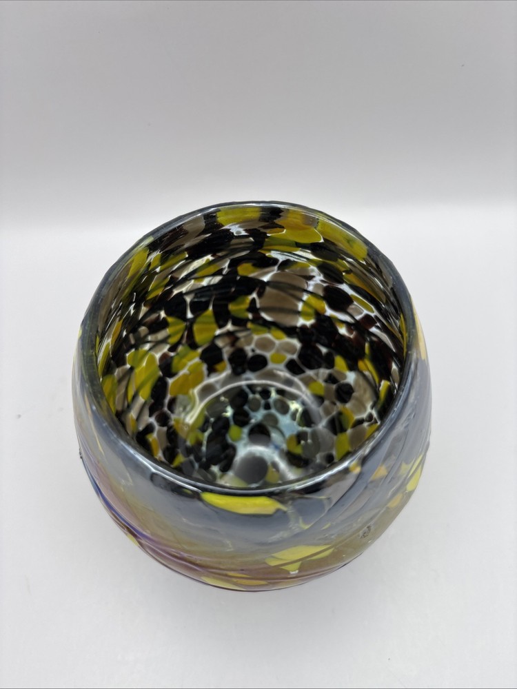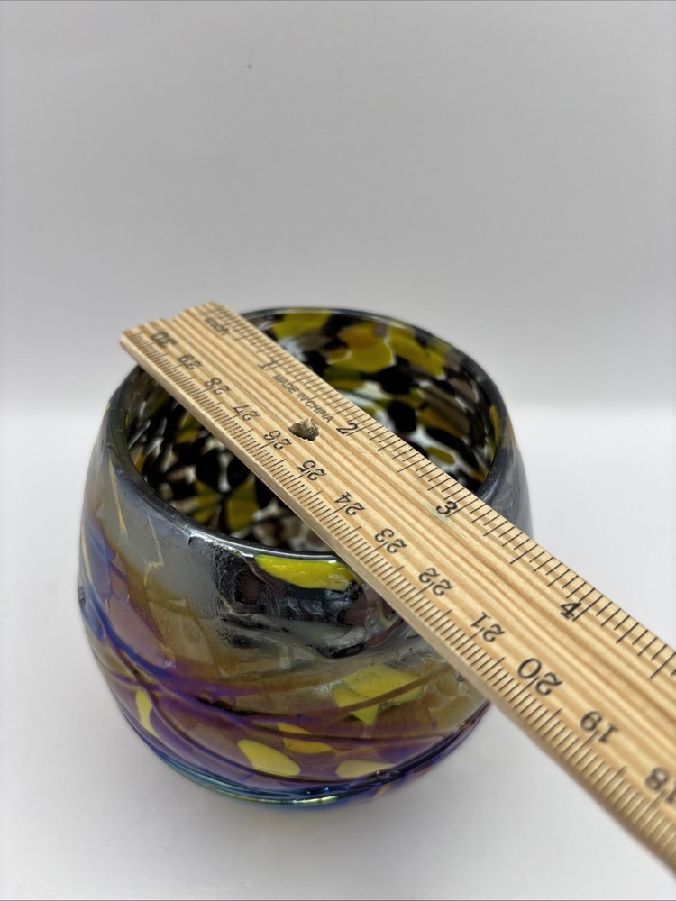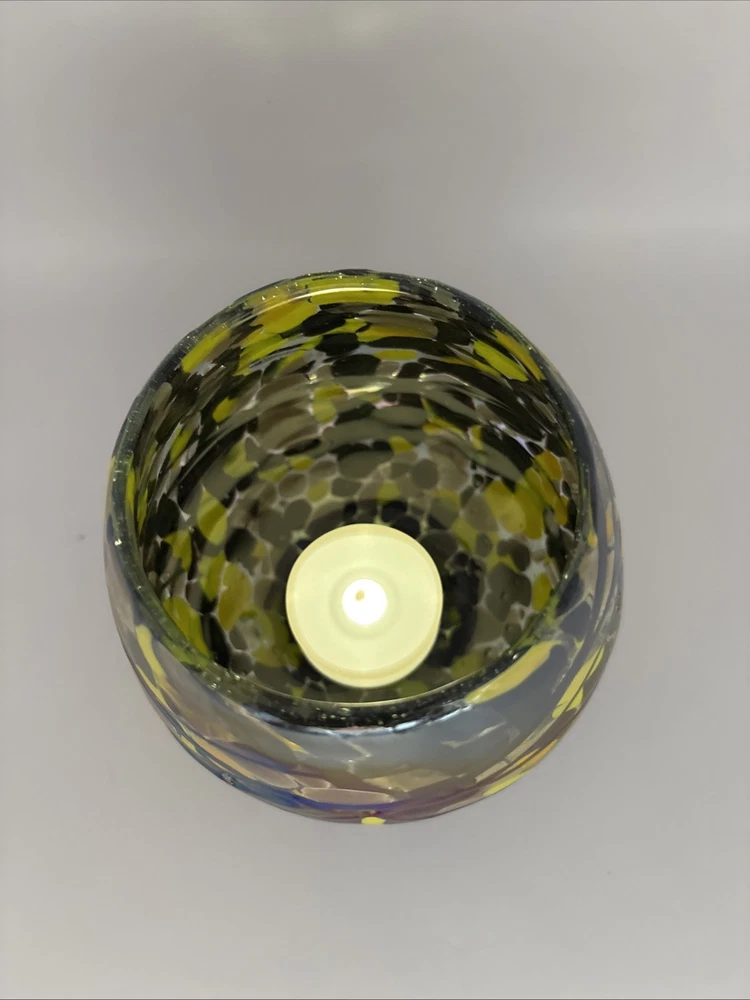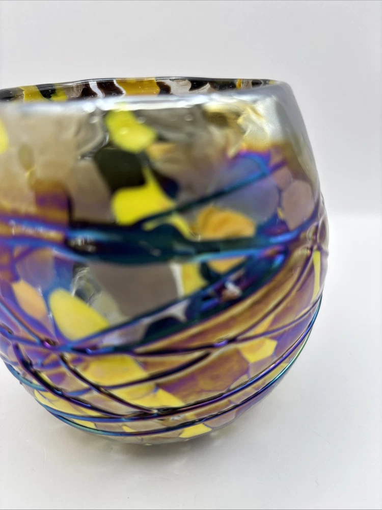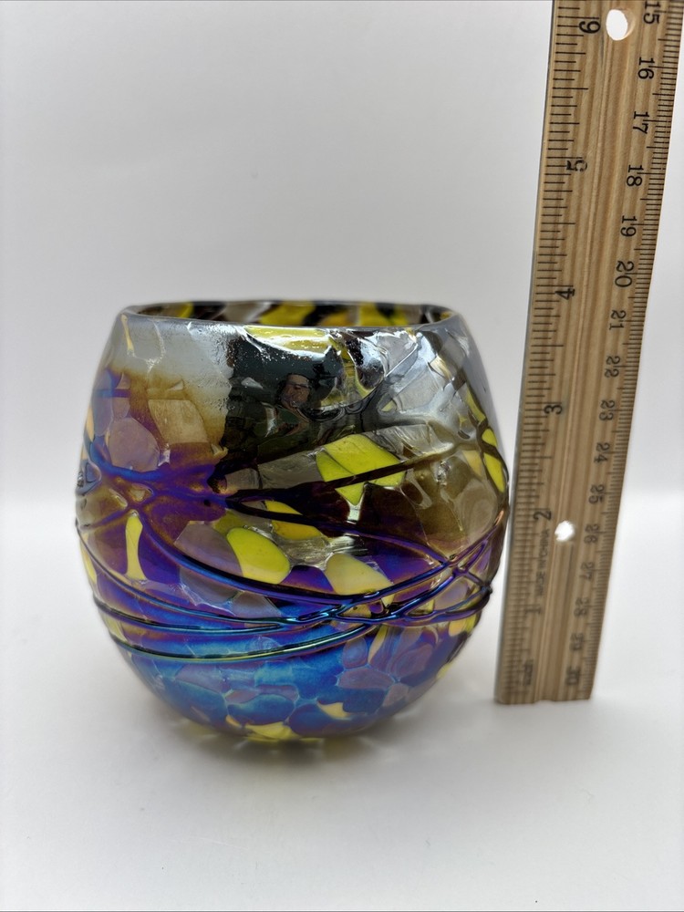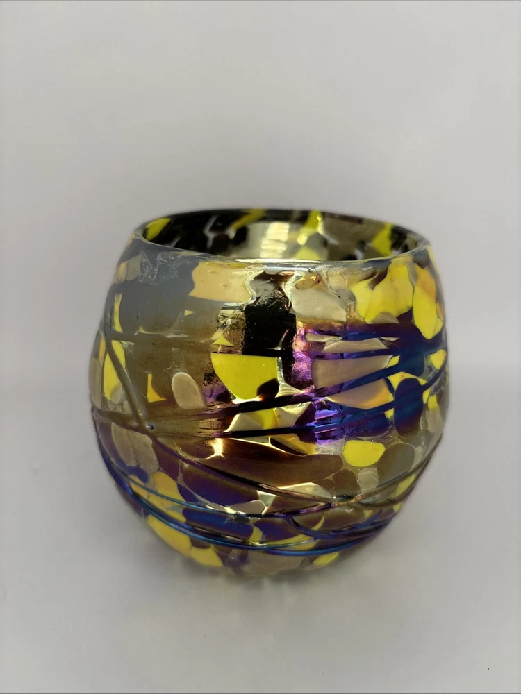 This is a handblown colorful art glass tea light holder with iridescence. Blue, purple, yellow and gold with a textured blue swirl all around. A very pretty piece. Please notice one rough spot as shown in last photo. B 9
