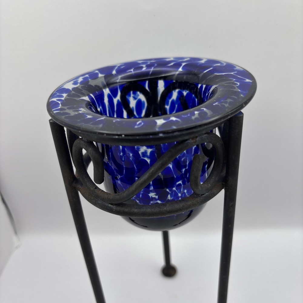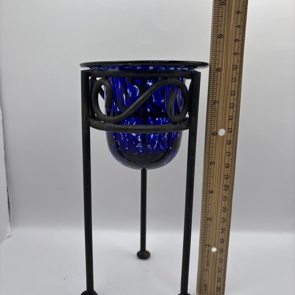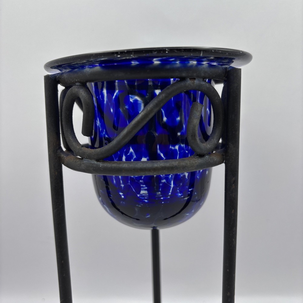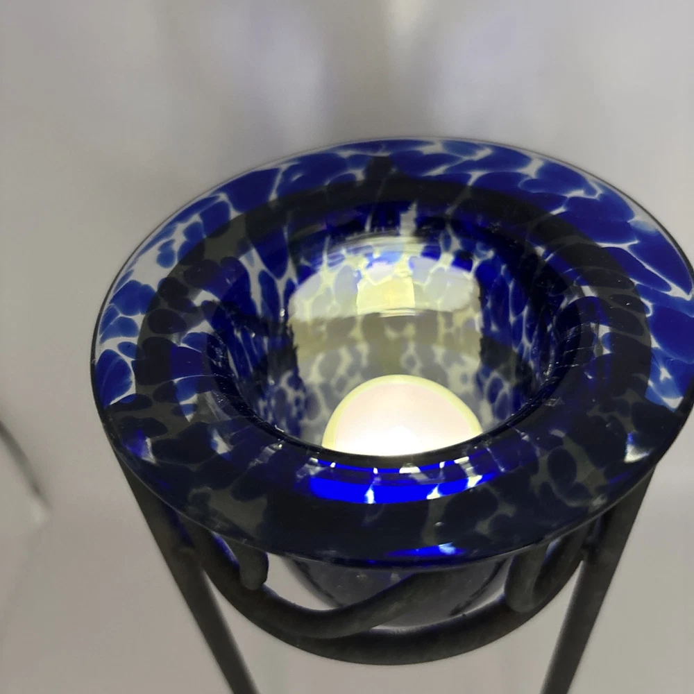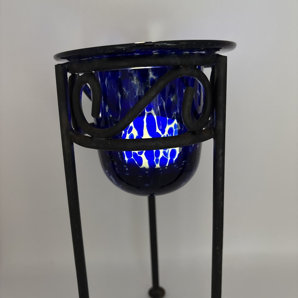 This is a blue and clear handblown tea light holder on a black metal base. 8 inches tall. Some rust on bottom of base legs as shown. I demonstrated using a battery powered tea light~not included. PP