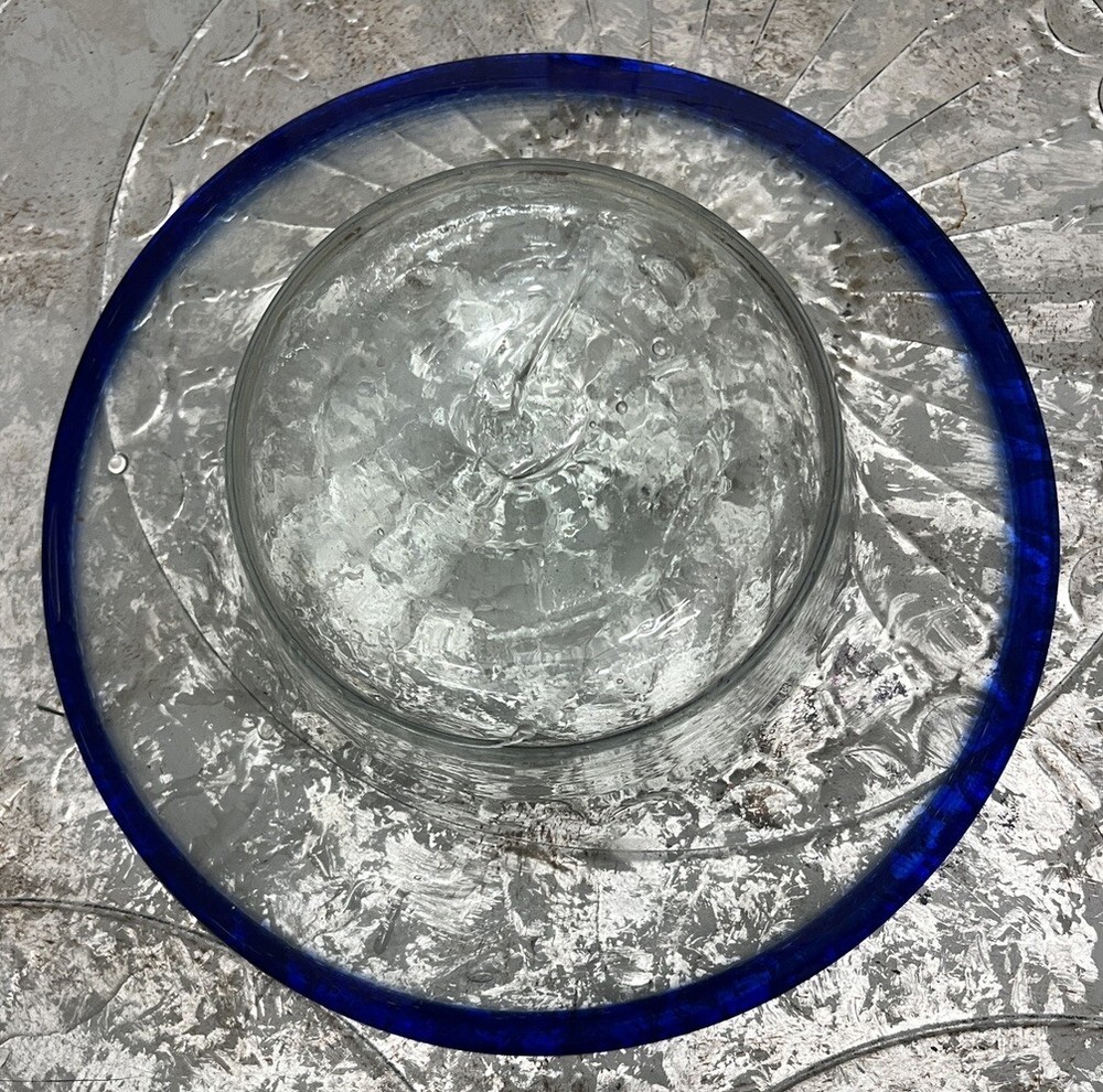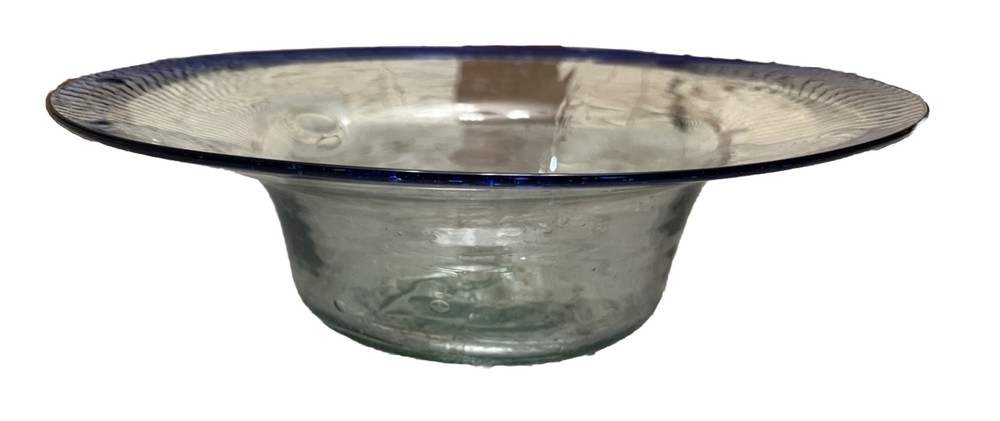 Cobalt Blue Rim and Clear Glass Bowl Mexican Hand-Blown Serving Dish for Salad, Chips and salsa, snacks, or fruit Dimensions 11.5 total diameter 2.5 depth 2.5 rim width 6.25 diameter of bowl in inches. Handmade hand-blown recycled glass with expected variations or air bubbles.