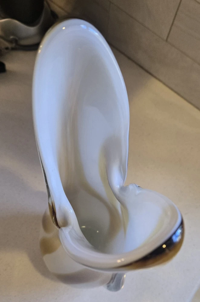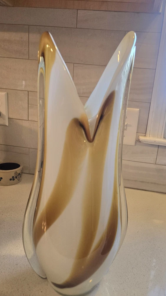 Unique swung-style glass vase with amber and white streaks. This vase is tall at a little over 15" and sleek with its curves and rounded bottom. It's heavy - around 4 lbs and the glass is thick. There is clear glass that juts out on the sides to add extra interest. Multiple bubbles can be found as well, which I believe adds character. The amber gradually lightens and darkens throughout the wide streaks. This vase begs to be put in just the right place in just the right home.