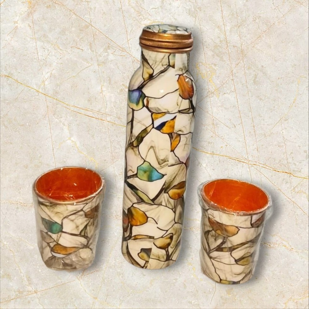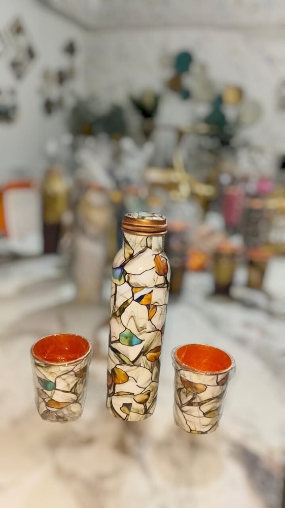 Stay healthy and hydrated in style with this premium handcrafted copper water bottle and tumbler set. Decorated with colorful floral and paisley motifs, this set combines traditional Indian craftsmanship with functional wellness. Copper vessels are known in Ayurveda for their health benefits, including improved digestion, joint health, and enhanced immunity. Set Includes: 1 x Copper Water Bottle (1 Liter capacity) 2 x Matching Copper Tumblers (300ml each) 1 x Leak-Proof Screw-On Lid Features: Pure copper interior for maximum health benefits Vibrant enamel-coated exterior with ethnic floral designs Durable, leak-proof, and eco-conscious Easy to clean (hand wash recommended) Ideal as a gift or for daily health-conscious use