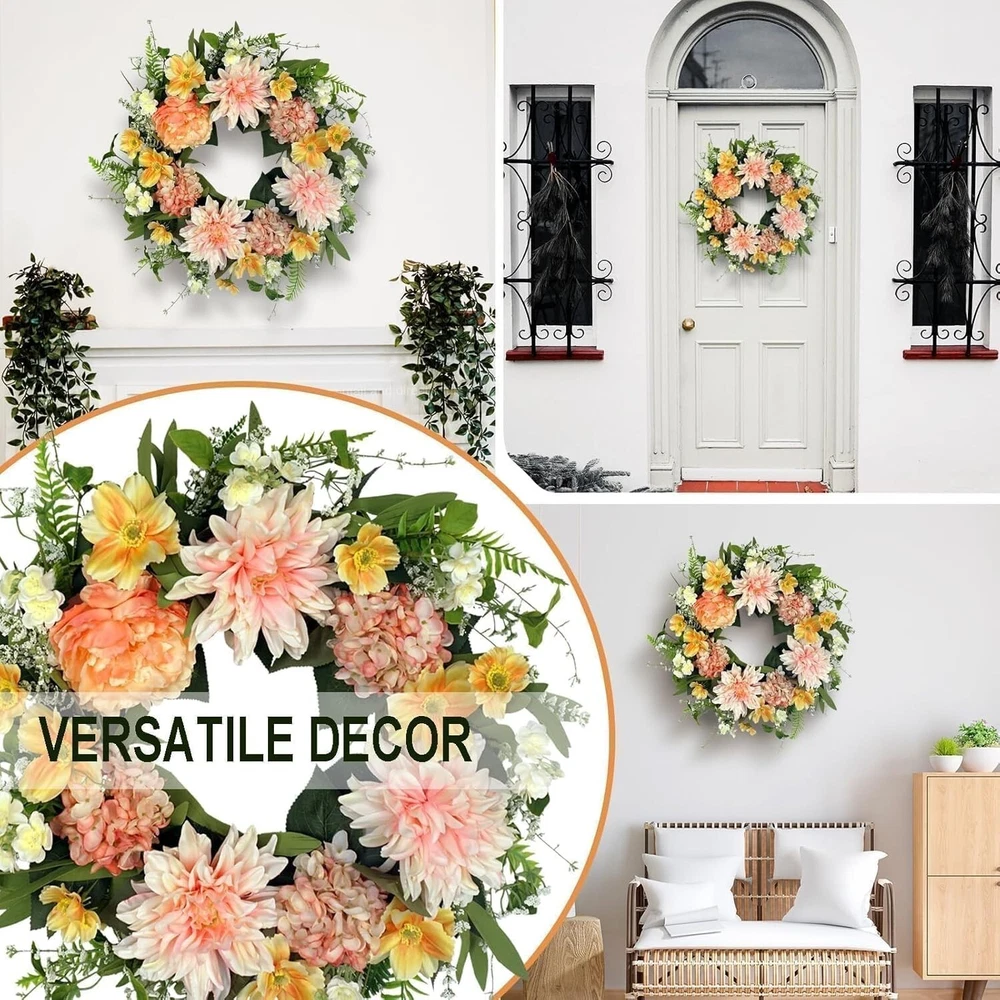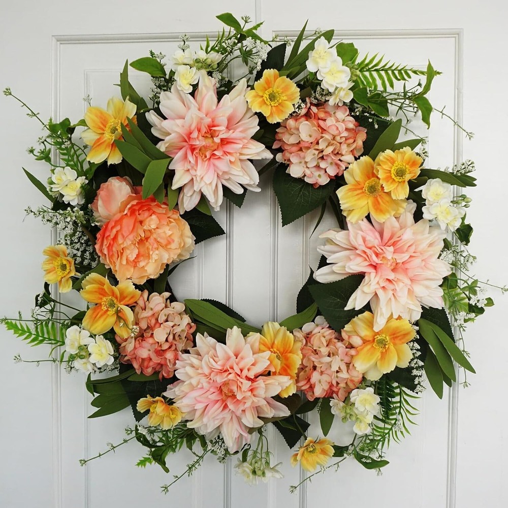 This wreath is absolutely stunning—the vibrant colors and lush tropical flowers instantly brighten any room. The craftsmanship is top-notch, with a sturdy twig base that holds up well. Perfect for Easter or summer decor, it adds a cheerful pop of color to doors, walls, or tables. The mix of dahlias, peonies, and hydrangeas looks so real, and the size is just right. Love how versatile it is—works in any space! A must-have for seasonal decorating.