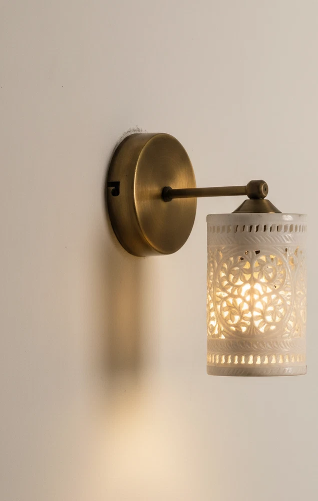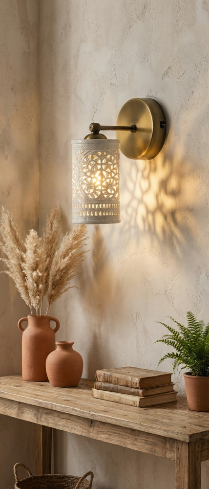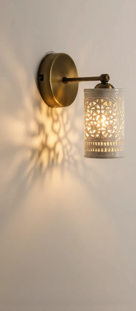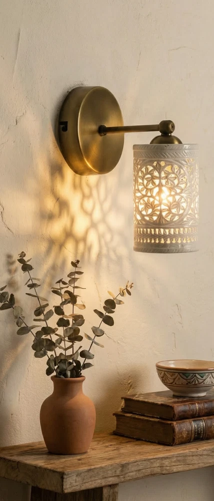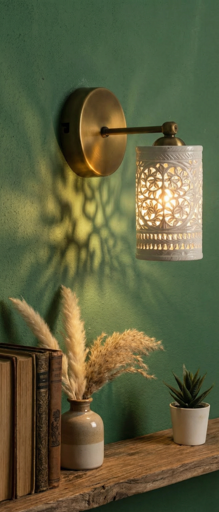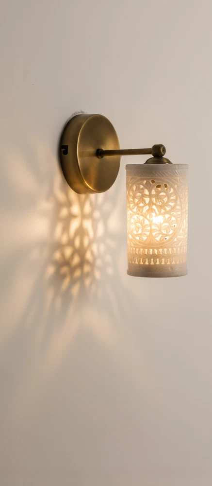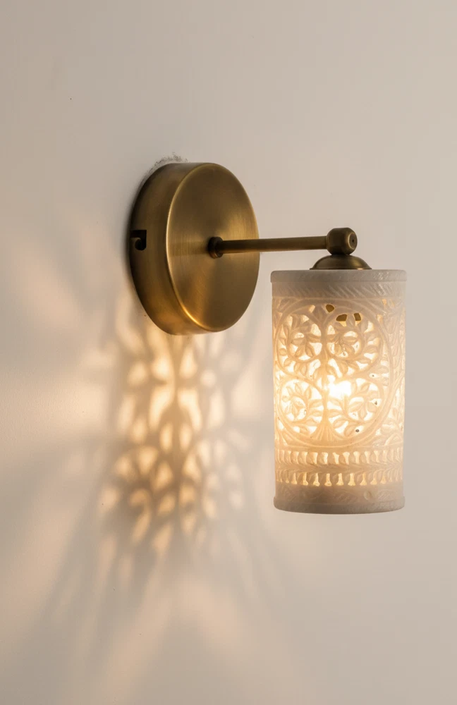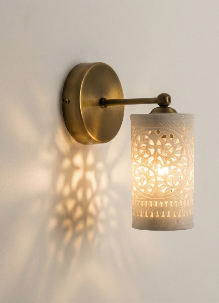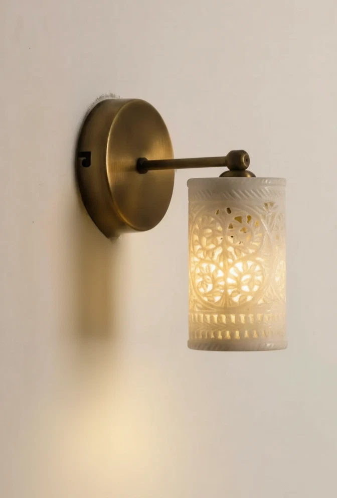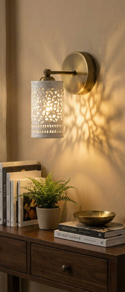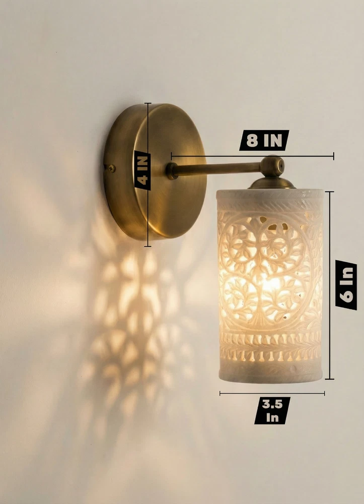 Enhance your home with this stunning Handcrafted Alabaster & Brass Wall Sconce. This premium wall lamp is a masterpiece from Golden Spoon Decor. It combines the natural beauty of translucent Alabaster stone with a solid, antique-finished brass frame. The shade features a hand-carved "Tree of Life" pattern that creates a magical play of light and shadow on your walls. Key Highlights: High-Quality Materials: Genuine Alabaster Stone & Solid Brass. Exquisite Craftsmanship: Hand-carved Jali work for a unique, luxury look. Beautiful Ambience: Perfect for creating warm, decorative lighting in bedrooms, hallways, or living rooms. Durable Finish: Antique Brass finish that resists tarnishing. Product Specifications: Dimensions: 8" (Length/Extension) x 6" (Height) x 4" (Base Width). Shade: 3.5" Diameter Cylinder Shade. Material: Alabaster & Brass. Type: Wall Sconce / Wall Lamp. Bulb Base: Compatible with E26/E27 LED bulbs (Not included). Tags...Alabaster Wall Sconce, Brass Wall Lamp, Tree of Life Light, Handcrafted Stone Lamp, Antique Brass Lighting, Moroccan Wall Sconce, Jali Work Light, Vintage Wall Lamp, Luxury Home Decor, Cylinder Wall Light, Carved Stone Sconce, Golden Spoon Decor, Bedroom Wall Light, Art Deco Lighting, Artisan Wall Sconce.