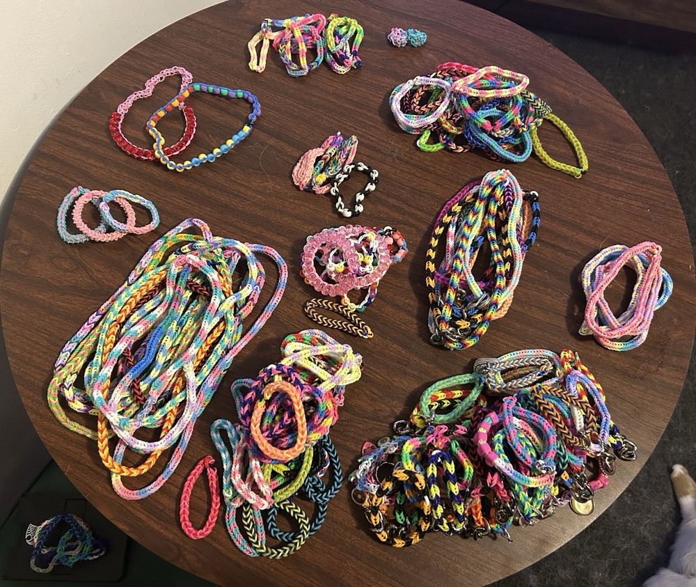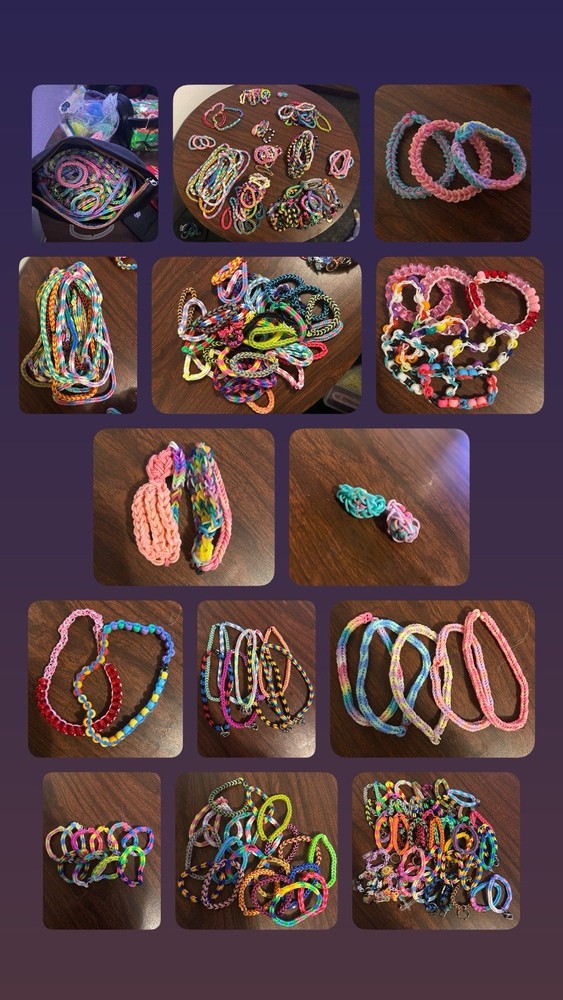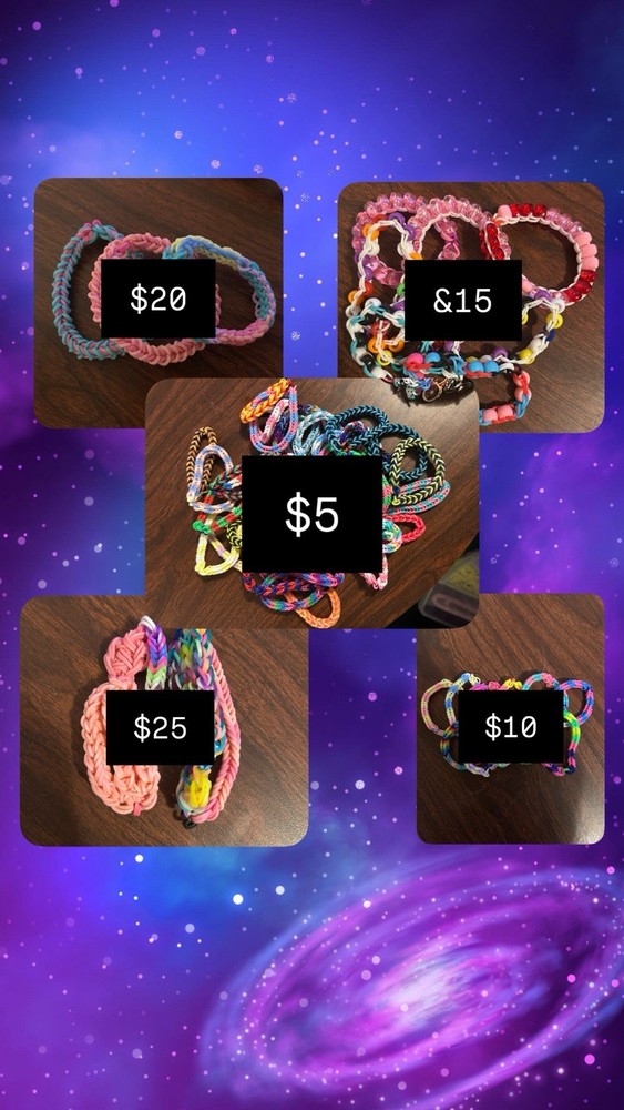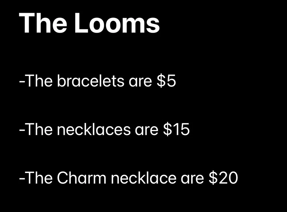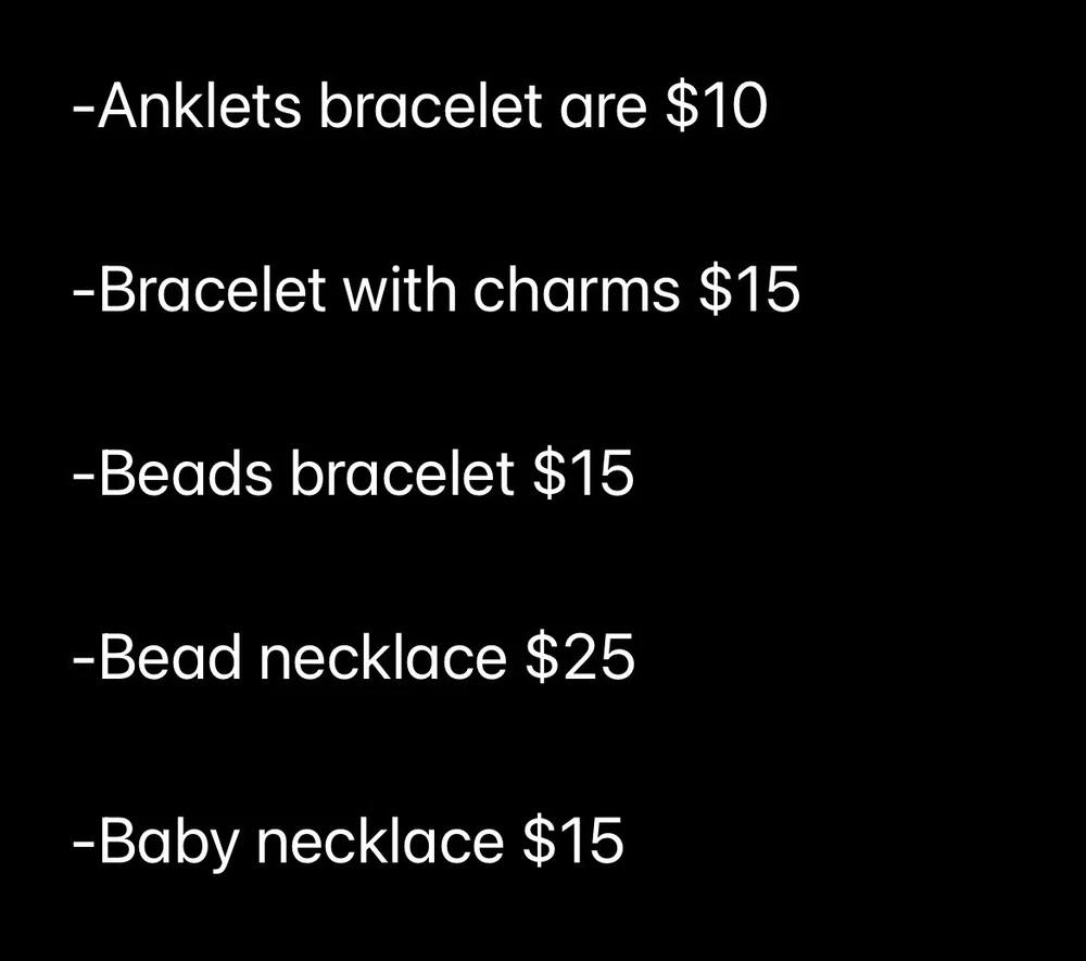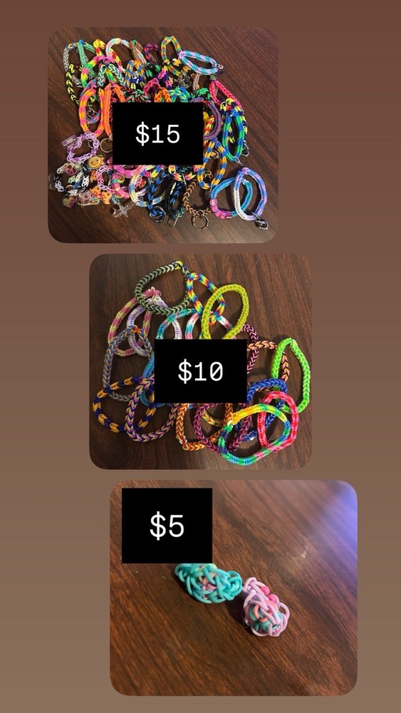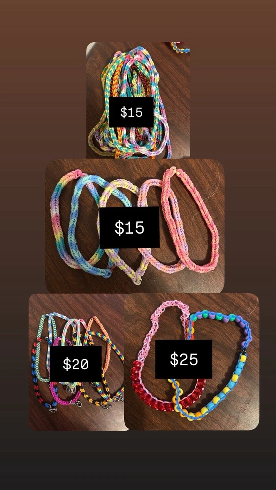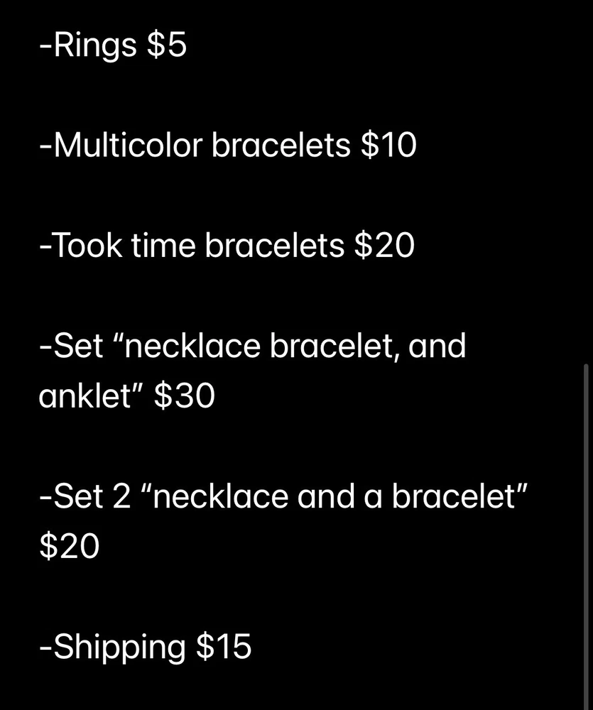 The Looms -The bracelets are $5 -The necklaces are $15 -The Charm necklace are $20 -Anklets bracelet are $10 -Bracelet with charms $15 -Beads bracelet $15 -Bead necklace $25 -Baby necklace $15 -Rings $5 -Multicolor bracelets $10 -Took time bracelets $20 -Set “necklace bracelet, and anklet” $30 -Set 2 “necklace and a bracelet” $20 -Shipping $15