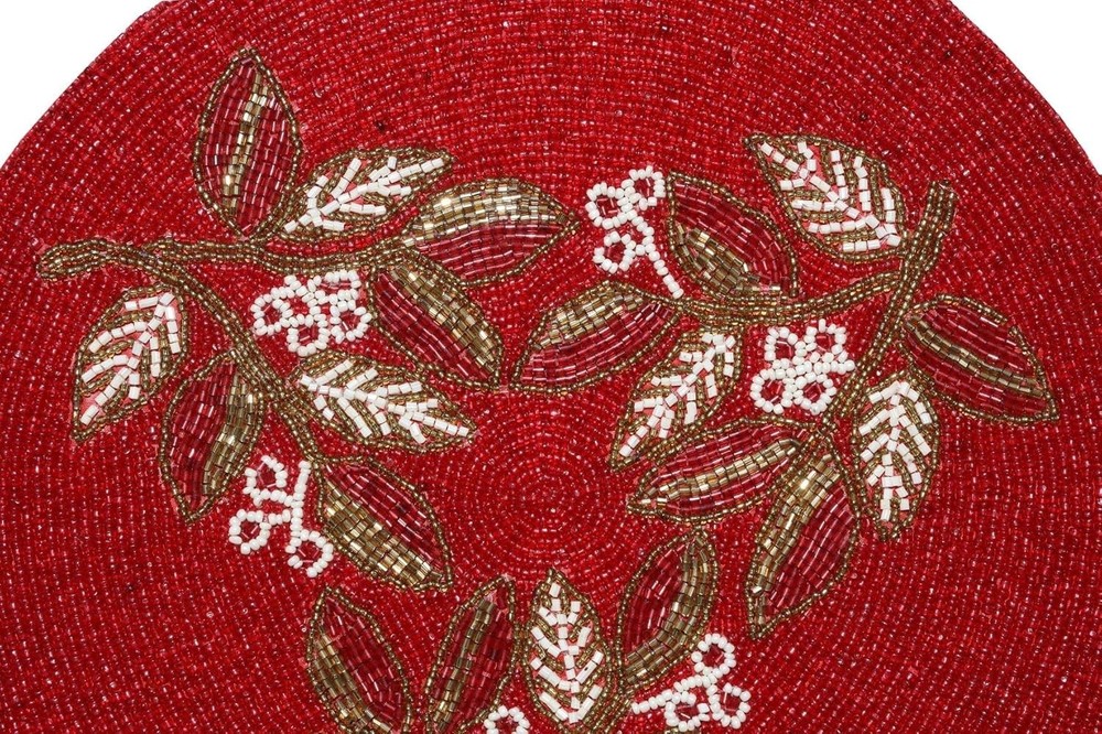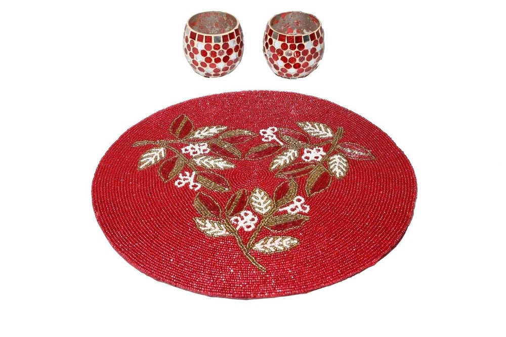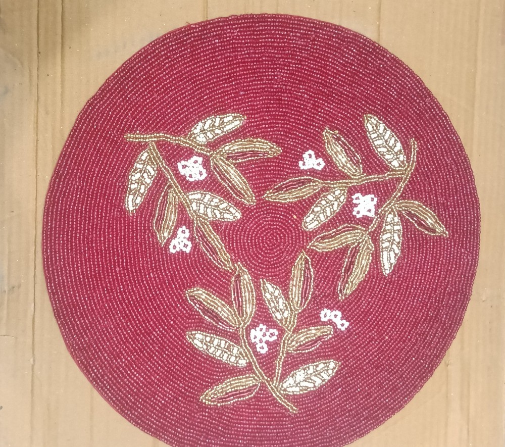 Brand: Handcrafted Country of Origin: India Theme: Christmas, Holiday Material: Glass Personalize: No Shape: Round Item Diameter: 10-15 in Features: Beaded Pattern: Flamingo Care Instructions: Hand Wash Only Number of Items in Set: 2 Type: Placemat Color: Red Occasion: Anniversary, Christmas, Engagement, Multipurpose, Wedding