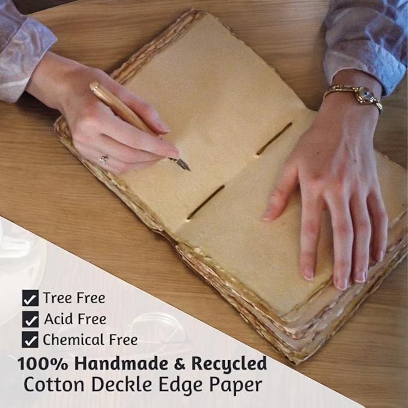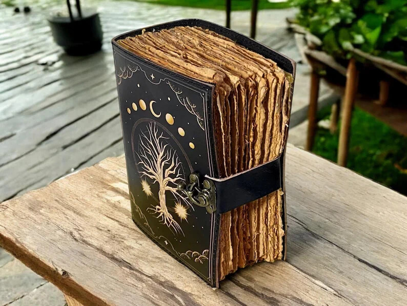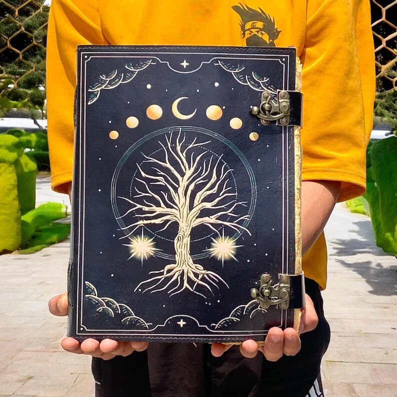 A Blank Spell Leather Grimoire Journal, Book of Shadows, printed with the Tree of Life is a handcrafted journal designed for those who wish to record their magical practices, rituals, spells, dreams, or spiritual reflections. The Tree of Life, a symbol found in various cultures, represents interconnectedness, growth, and the cycle of life. Key Features: Material : Crafted from genuine leather, often embossed with intricate designs. Design : The cover typically features an embossed or printed Tree of Life motif, symbolizing wisdom, strength, and the connection between all forms of creation. Closure : Equipped with a clasp or latch to securely close the journal. Pages : Contains unlined pages, allowing for freeform writing, sketching, or diagramming. Size : Dimensions can vary, but a common size is approximately 12.5 x 17.5 x 3 cm. Paper : Made from recycled cotton, providing a textured finish suitable for various writing instruments. Symbolism of the Tree of Life: In many traditions, the Tree of Life is a symbol of growth, strength, and a connection between all life forms. Its roots delve deep into the earth, its trunk stands firm, and its branches reach towards the heavens, embodying the interconnectedness of all existence. Availability in multiple size’s - 6x4 inches 7x5 inches 8x6 inches 10x7 inches 13x10 inches 200 pages is also available in this journal perfect gifts for him and her ● The witchcraft supplies journal is printed with a special “ Tree of life ” which helps to reveal inner truth within yourself and encourage self-awareness and self expression. We have taken extra to make sure that the emboss is perfect in every piece. ● Sketch, Doodle, Write on your Leather Blank Spell Journal with a Calligraphy Pen Fountain Pen, Brush Pen, Ball Pen, Acrylic Colours, Watercolor and many more. We guarantee no bleed through. ● Can be used as a notepad, journal, writing notebook, sketch book. 1.25 inch thickness, easy for handwriting, drawing or sketching and compact for carrying in your bag. Ideal for alternative ● Artist Sketchbooks, Photo Album, Traveling Notes, Business Executive, Logbook, Poetry Work, Journalists, Food Planner, Instagram Scrapbook and Bible Journaling. ● Best Gift For Your Companion: A Journal Is Like A Trusted Friend. You Can Use It To Solve Queries, Get Inventive, Or Record Valuable Memories For Them To Last Forever Or You Can Just Use It As A Gift For Your Wife, Son, Or A Daughter Or For Some Enthusiastic Writer In Your Family. Even For Looking For A Miraculous Spell Book Or A D&D Gamer Looking For His Quest Book. ● Perfectly Sized For Multi-Purpose Use: Length 5", Width 1", Height 7" Inches, This Easy To Carry Personal Diary Is Perfect To Use As A Health Journal, Sketchbook, And Poetry Journal. It’S An Ideal Journal Which Records Your Daily Thoughts And Life Lists.