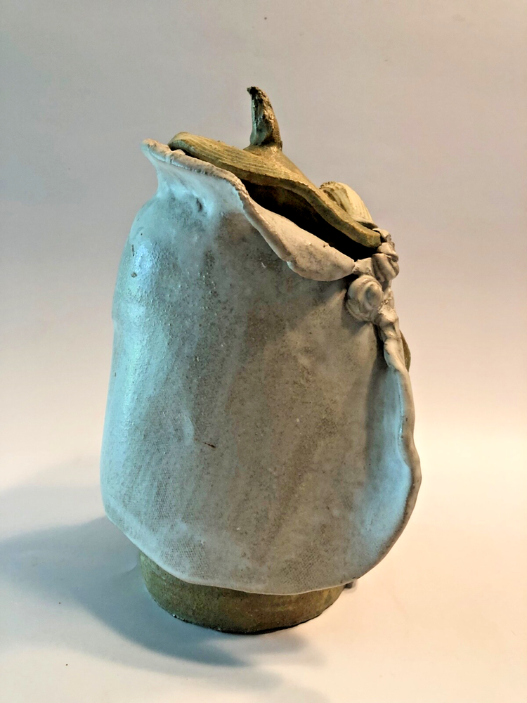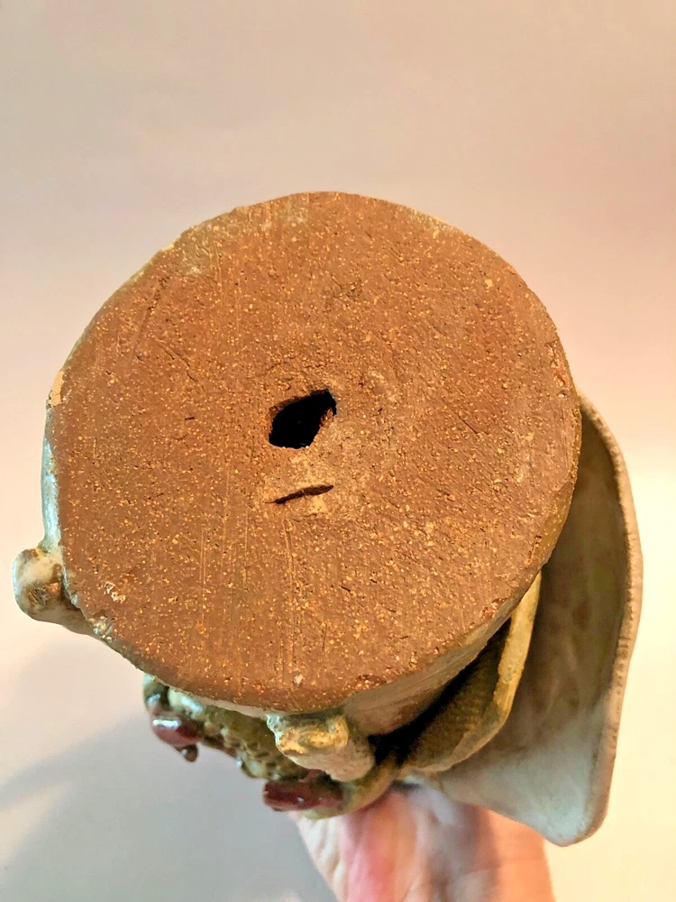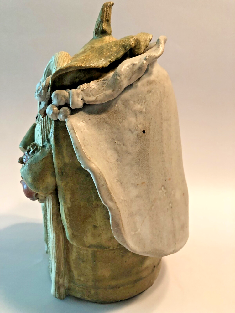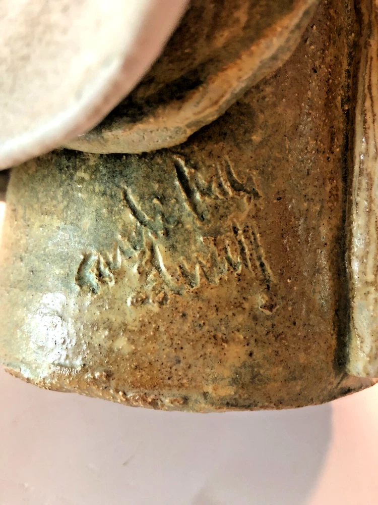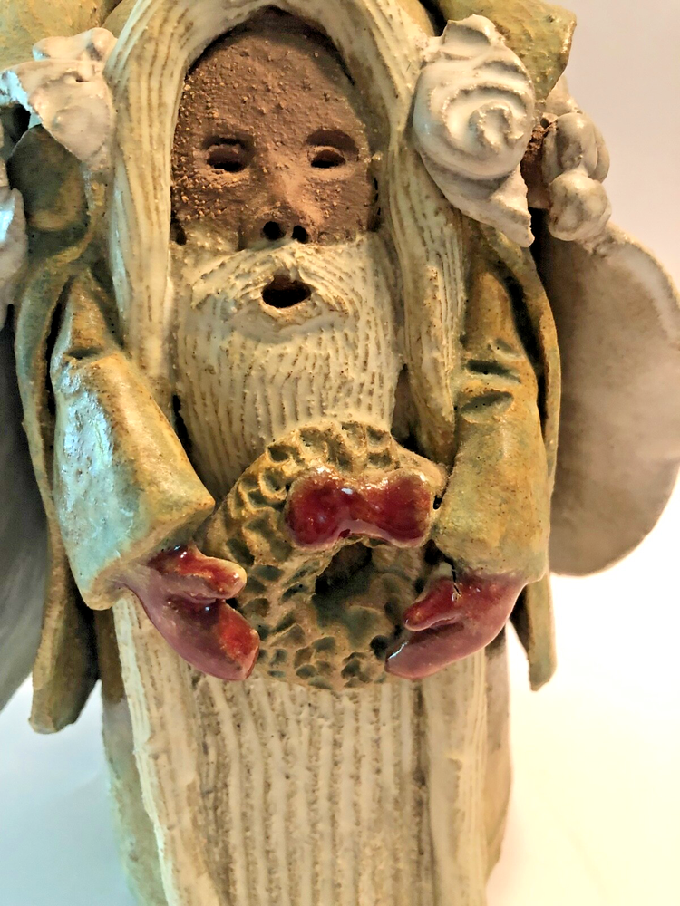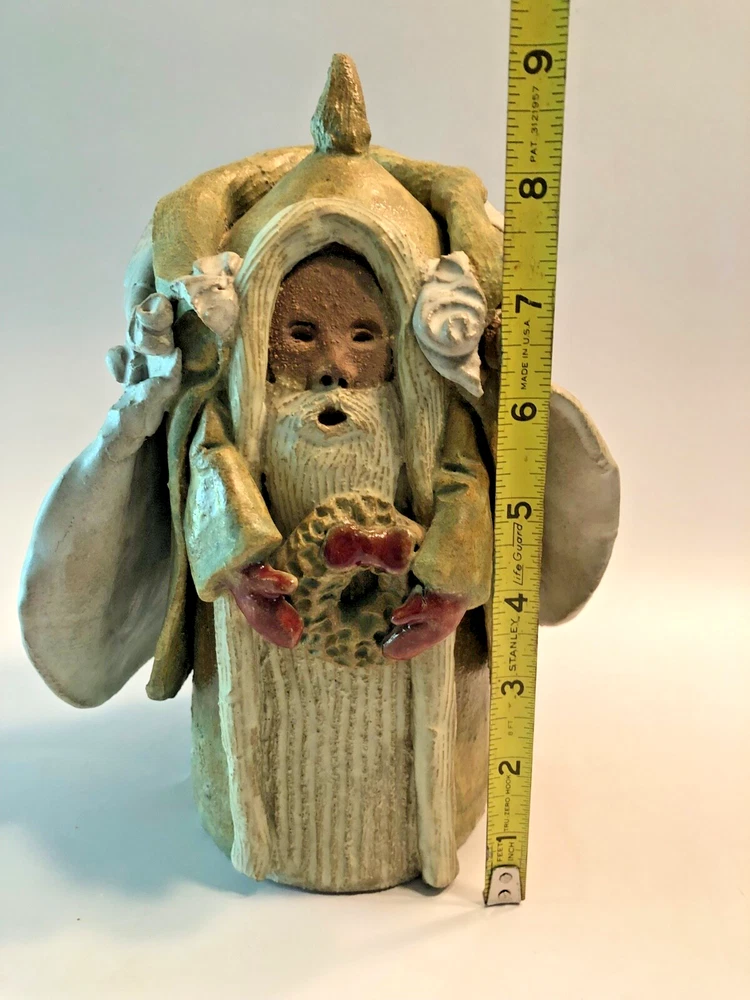 This handcrafted clay pottery Santa figurine sculpture is a unique and primitive piece perfect for Christmas decor. Standing at 9 inches tall, this brown-colored Santa figurine features intricate details and is signed by the artist. Made from clay, this original sculpture captures the essence of the holiday season with its charming design. Ideal for collectors or those looking to add a rustic touch to their home during the festive season.
