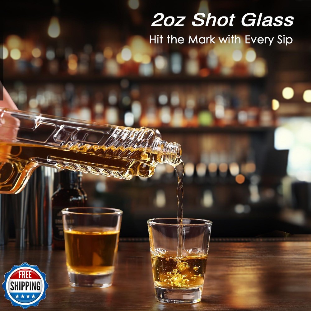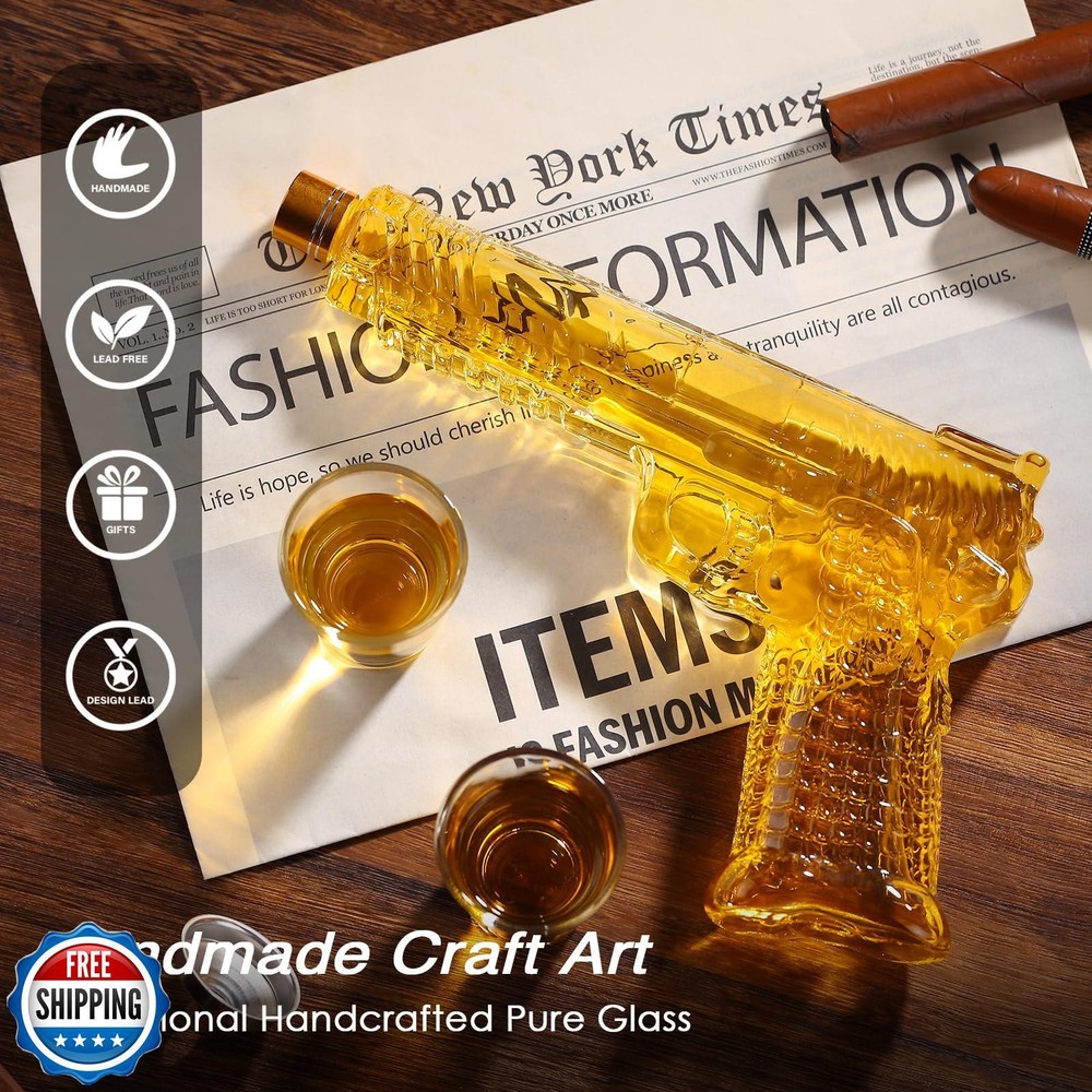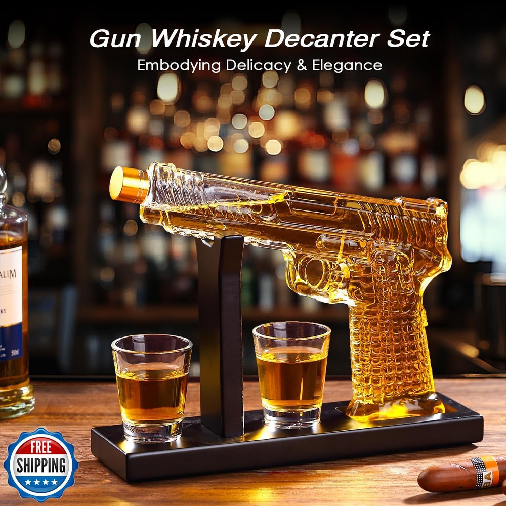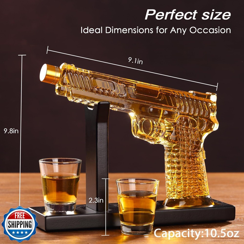 Fathers Day Handcrafted Gun Whiskey Decanter Sets for Men, Liquor Decanter Set with Glass, Unique Birthday Gift Idea for Dad, Cool Anniversary Stuff Gift for Him Husband, Dispenser for Bar Party Features Perfect Gift for Whiskey Enthusiasts: Searching for the ultimate gift for a whiskey aficionado with a passion for unique designs? Look no further. Our Modern gun Whiskey Decanter Set is a stunning blend of form and function, perfect for birthdays, Father’s Day, anniversaries,Christmas, or any special occasion. Whether it’s for your dad, husband, or boss, this set is a striking gift that will surely impress. Sleek and Modern Design: This whiskey decanter set features a contemporary handgun design, crafted with precision to stand out. Paired with an elegant wooden display stand, it is not just a decanter but also a captivating conversation starter, perfect for your home bar or man cave. Its unique visual appeal will elevate any gathering.This cool gun whiskey decanter gift set is an excellent value with 2 X 2oz whiskey glasses and a stunning whiskey decanter with a 10.5oz capacity. Premium Quality Craftsmanship: Made from 100% lead-free glass, our liquor dispenser set offers exceptional clarity and safety. Each piece is handcrafted with meticulous attention to detail to ensure durability and long-lasting elegance. The set includes a decanter and two whiskey glasses, enhancing your drinking experience with its tactile luxury and brilliance. Enhance Flavor and Preserve Purity: The sophisticated design of our decanter set is aimed at preserving the rich aroma and nuanced flavors of your favorite spirits—be it whiskey, bourbon, scotch, or tequila. Experience a smoother, more refined sipping experience with this elegantly crafted set that truly accentuates the essence of your drink. Secure and Elegant Packaging: Our whiskey decanter set comes in a beautifully designed gift box lined with black pearl cotton for maximum safety during transit. This premium packaging not only ensures the product arrives in perfect condition but also adds a touch of elegance, making it an exceptional gift choice that reflects your thoughtful gesture. Shipping Free & Fast Shipping: We offer free shipping to most of the USA with a normal delivery time of 3-7 days. However, due to the current situation, additional delivery time (up to 3 weeks) may be required for some items. Alternative Carriers: We may use alternative carriers (e.g., USPS, FedEx, UPS) to ensure your package arrives safely and on time. Due to the use of multiple carriers, we are unable to provide a tracking number automatically. Handling Time: Orders are processed and shipped within 1-2 business days of receiving cleared payment. Shipping Restrictions: Shipping to Alaska, Hawaii, Puerto Rico, Guam, and other US territories may incur shipping charges or delivery restrictions. Please contact us before ordering, or your order can be refunded/cancelled. State Restrictions: Certain items may not be shipped to California due to state regulations. Contact for Tracking Updates: If you require tracking updates or have any concerns about the delivery of your order, please feel free to contact us, and we will be happy to assist you. Return Policy 30-Day Hassle-Free Returns: If you are not completely satisfied with your purchase, you can return the item for free within 30 days of receiving it for a full refund or exchange. Easy Return Process: Contact us, and we will provide you with a prepaid return shipping label and detailed instructions. No Restocking Fee: There are no restocking fees for returns. However, the buyer is responsible for return shipping costs if the return is not due to a seller"s error. Refund Processing: Refunds will be processed within 1 business day of receiving the returned item in its original condition. Feedback Your feedback is extremely important to us. We strive to provide the best products and customer service possible. If you are satisfied with your purchase, please take a moment to leave us a positive review. If you have any concerns or issues with your order, please contact us before leaving negative feedback. We are committed to resolving any problems and ensuring your satisfaction. Contact Us If you have any questions or concerns, please feel free to reach out to our customer support team. You can contact us through the eBay messaging system. We are available Monday to Friday, 9:00 am to 5:00 pm EST, and we will do our best to respond to your inquiry within 24 hours. Thank you for supporting our small family business!