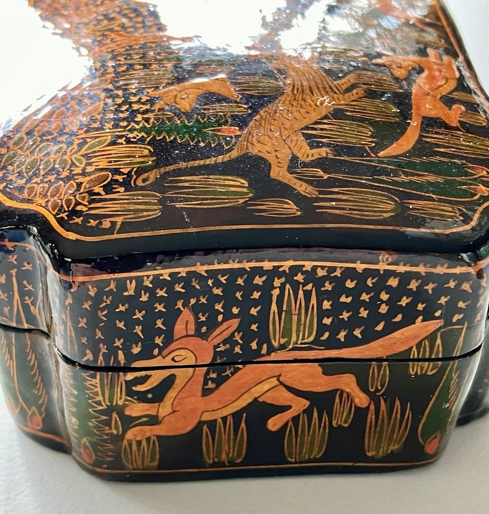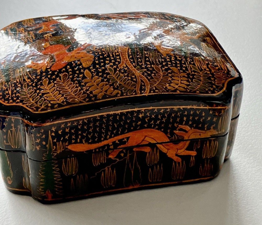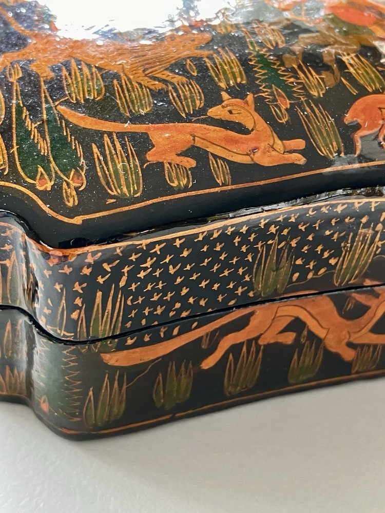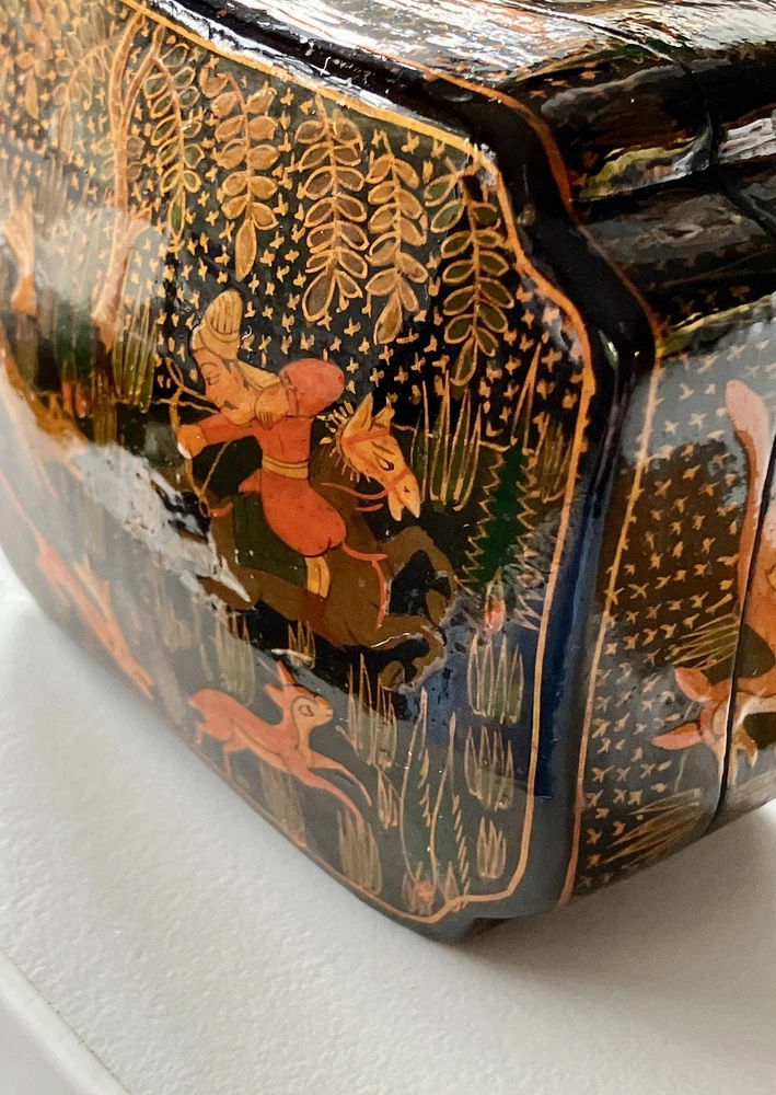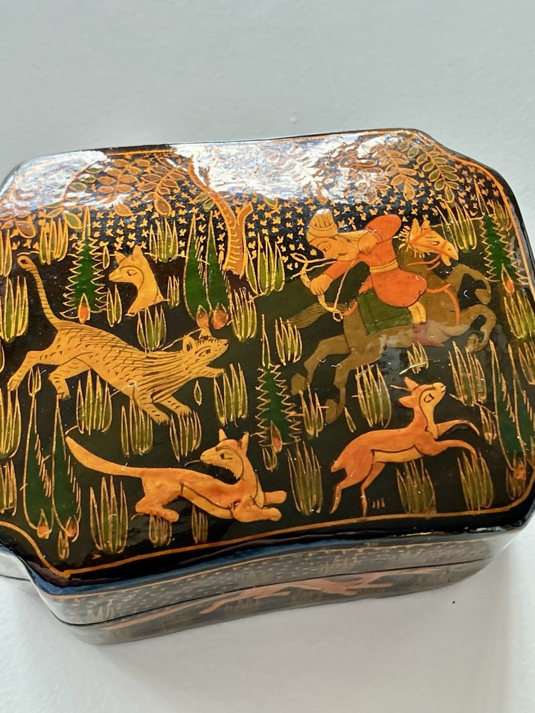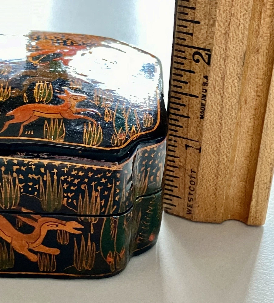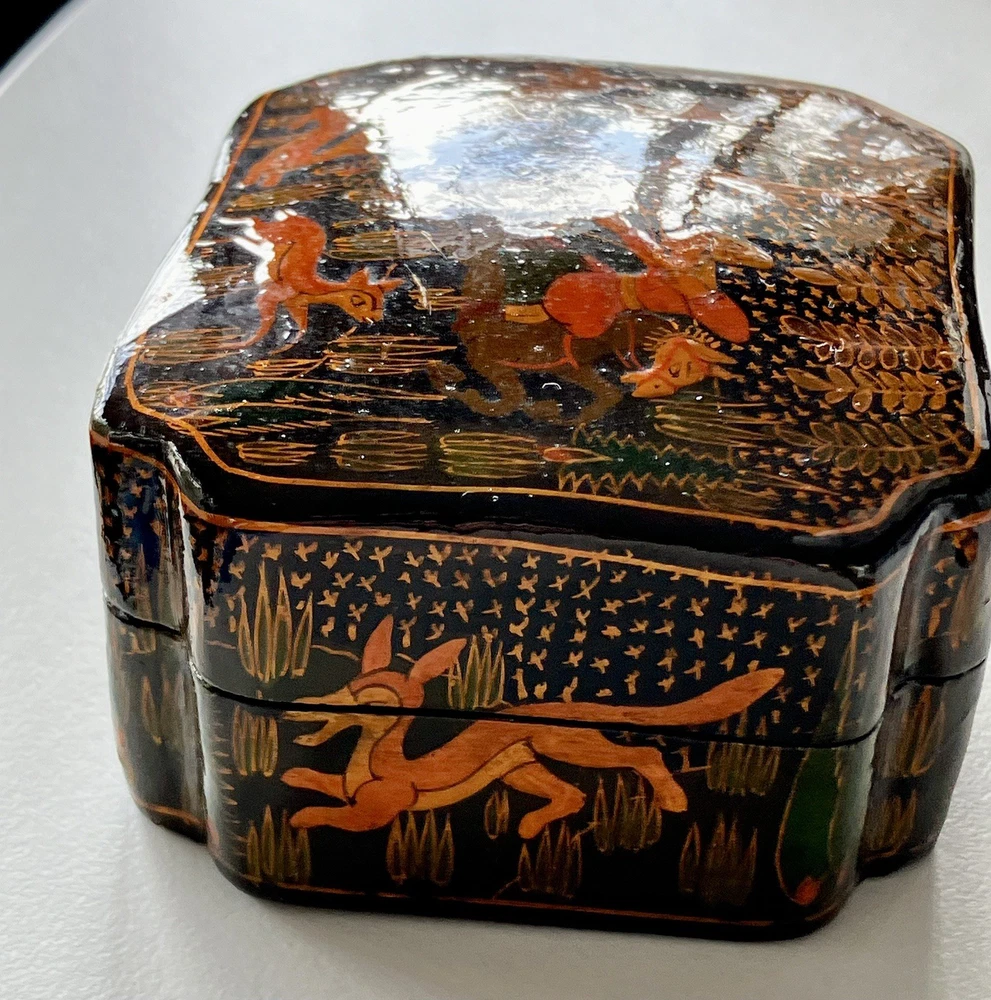 Handmade Kashmir India Trinket Box Hunting Scene Small Lacquered 3.5" x 1.75" beautiful condition let me know if you need more photos or have questions 042025 bx