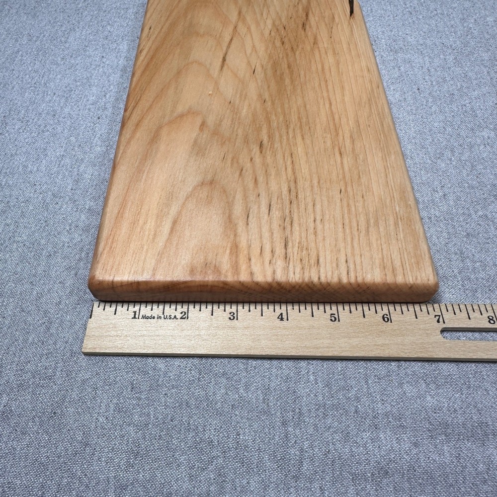 Beautifully handcrafted hardwood cutting boards with an elegant curved paddle handle Solid Maple – Sleek, clean look with pale cream color and subtle grain, ideal for modern kitchens Design & Craftsmanship * Sculpted swan-neck handle for comfort, style, and easy hanging * Face-grain construction: durable, knife-friendly, and warp-resistant * Silky-smooth finish * Treated with food-safe mineral oil and our own beeswax conditioner (4 oz. included with purchase) * Rounded corners and softened edges for an elevated, finished feel * Backside is fully finished—ready for use or display * Full length with handle approx. 7" x17" Usage Ideas * Charcuterie or cheese board * Cocktail prep or bread cutting board * Display piece for rustic or modern kitchens * Personalized gift for weddings, housewarmings, anniversaries Care Instructions * Hand-wash only with warm soapy water * Do not soak or place in dishwasher * Reapply board oil as needed to maintain finish
