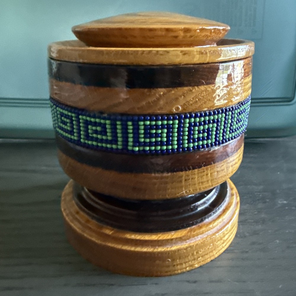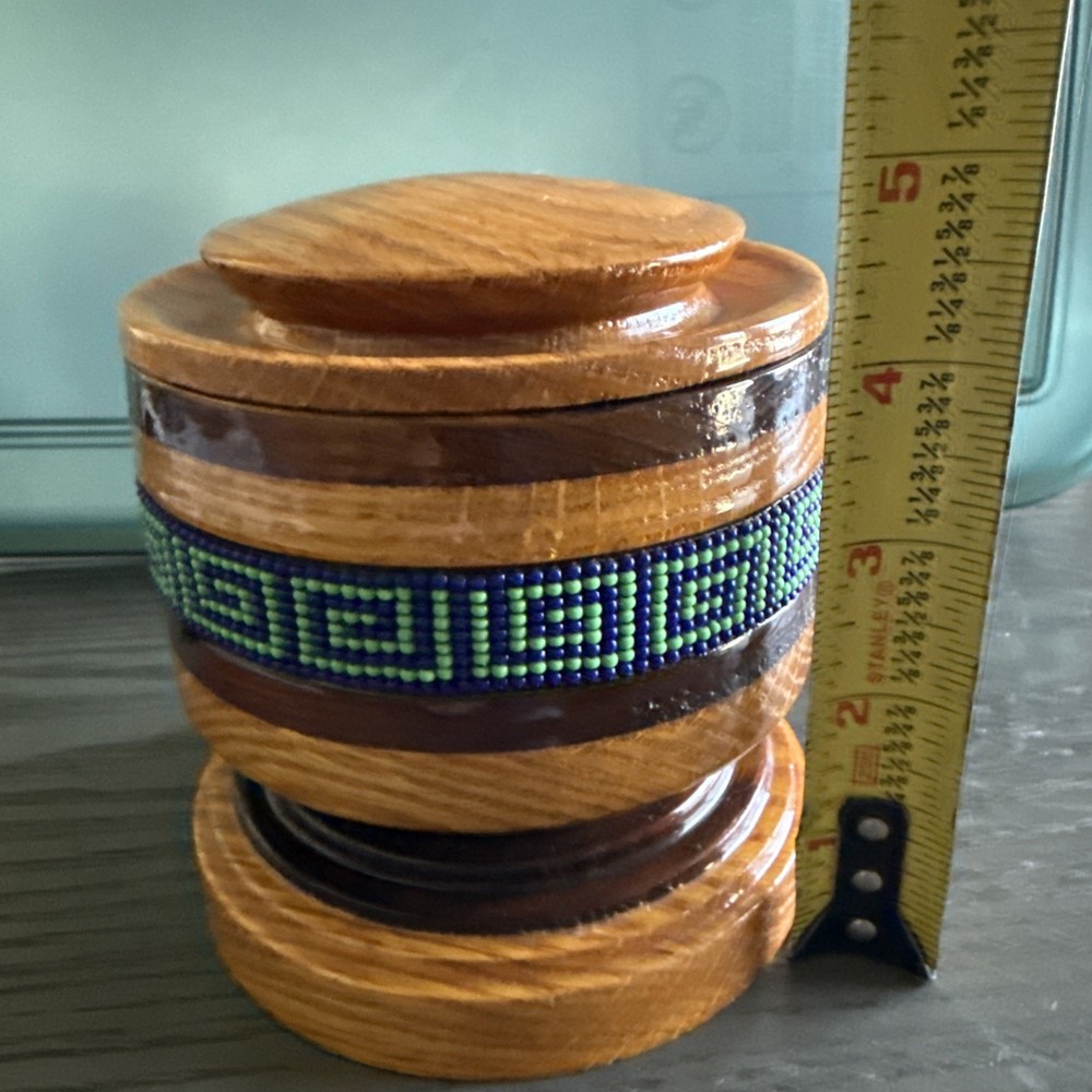 Handcrafted Round Wooden Trinket Box with Beaded Design 4.5 Inch