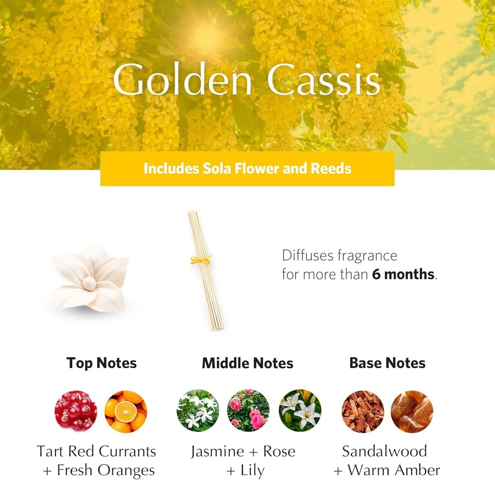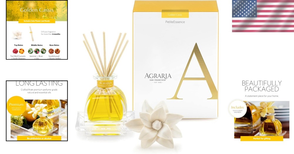 Brand: Unbranded Features: Diffuser, Natural, Handcrafted, Luxury Gift, Long Lasting Fragrance, Auto Shutoff: No Installation Area: Home Floor Area: 17.5 Square Feet Room: Living Room Occasion: All Occasions Style: Modern Auto Shutoff: No Product Dimensions: 2"l X 2"w X 3.75"h Handmade: Yes Number in Pack: 1 Size: Small UPC: Does Not Apply Intended Use: Aromatherapy Form: Liquid Coverage: Small Room Material Type Free: Lead Free Power Source: Battery Scent: Golden Cassis Capacity: 50 Milliliters Unit Count: 1.0 Count Color: Golden Cassis Type: Reed Diffuser Set gtin13: Does Not Apply Department: Adults Humidity Control: No Volume: 50 milliliters Recommended Uses For Product: Home, Office Number Of Items: 1 Item Weight: 0.26 pounds Material: Cotton, Sola Flower, Balsa Wood, Essential Oils Set Name: Petiteessence Duo