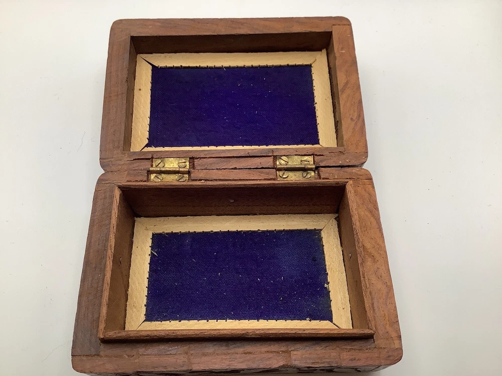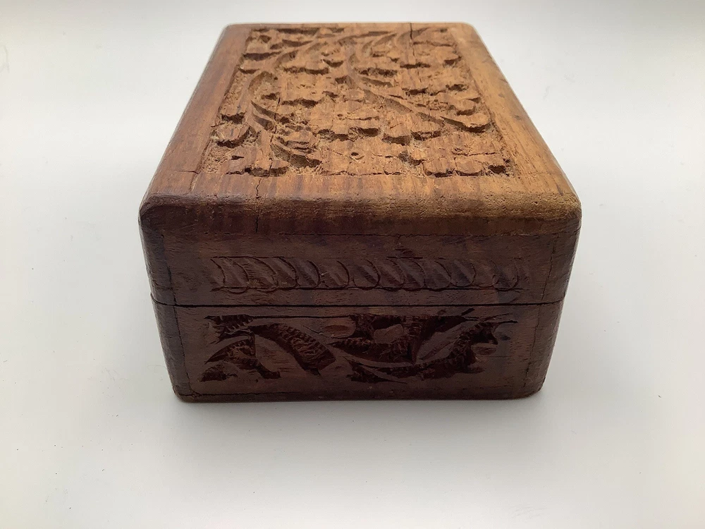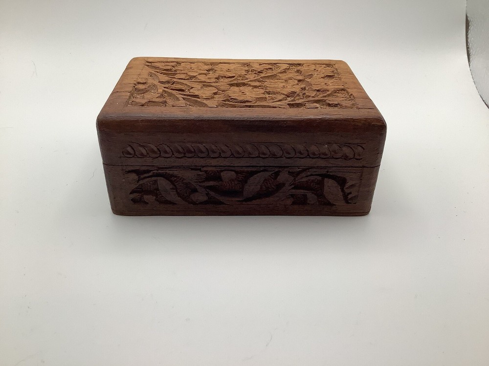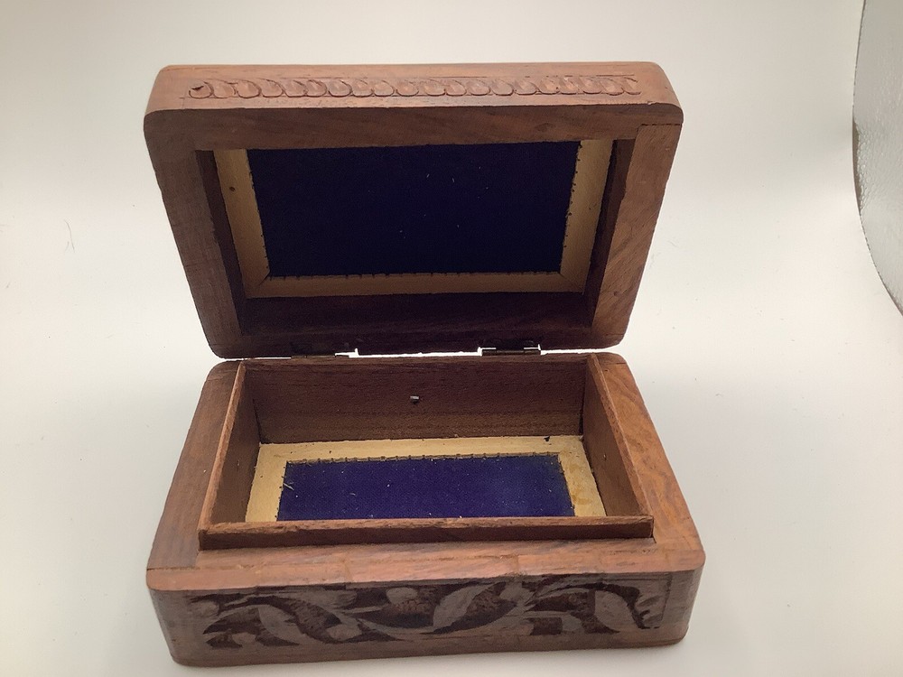 This vintage Carved Wooden Jewelry Trinket Box from India features a beautiful flower pattern and is lined with velvet. With intricate carvings and a medium size, this unique piece is perfect for storing small treasures and jewelry. Made with high-quality wood and velvet materials, this trinket box is ideal for any room and all occasions. The late 20th century design and handmade craftsmanship add to its charm, making it a lovely addition to any collection of decorative collectibles.