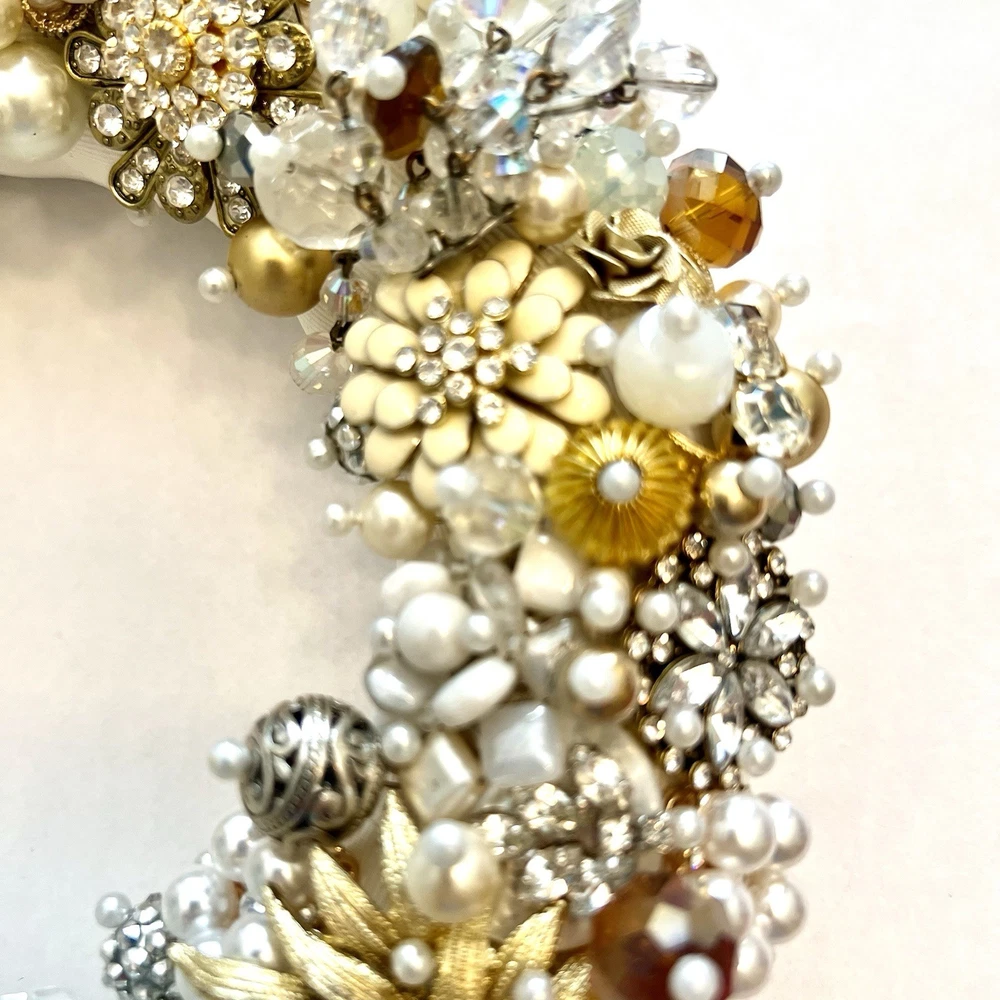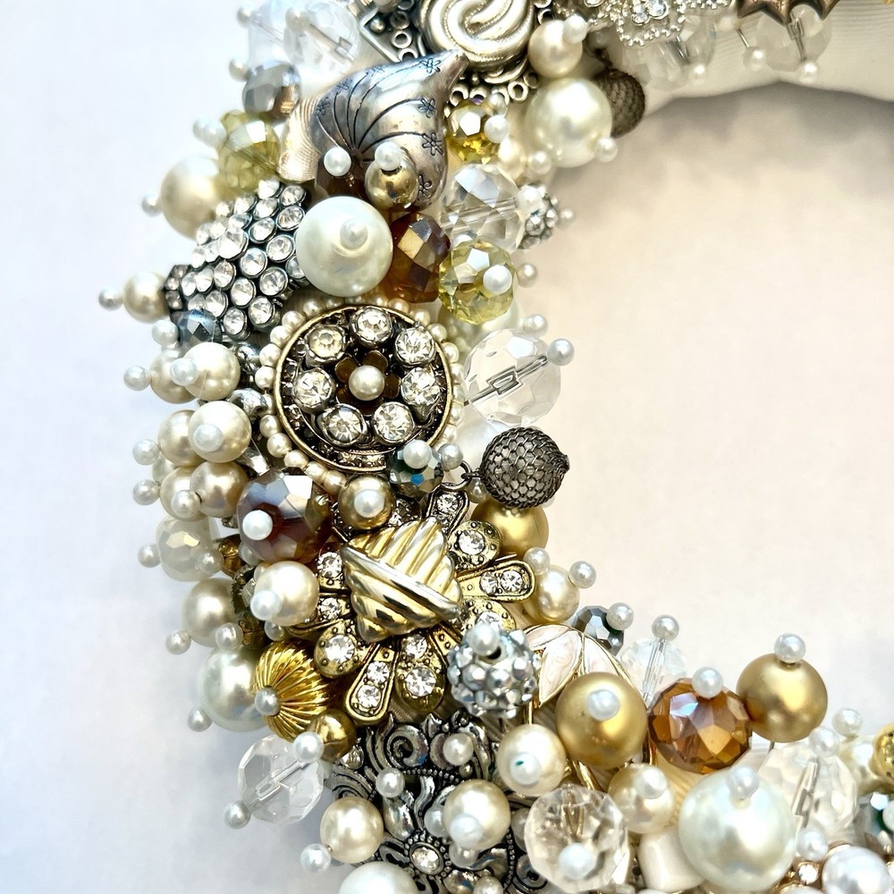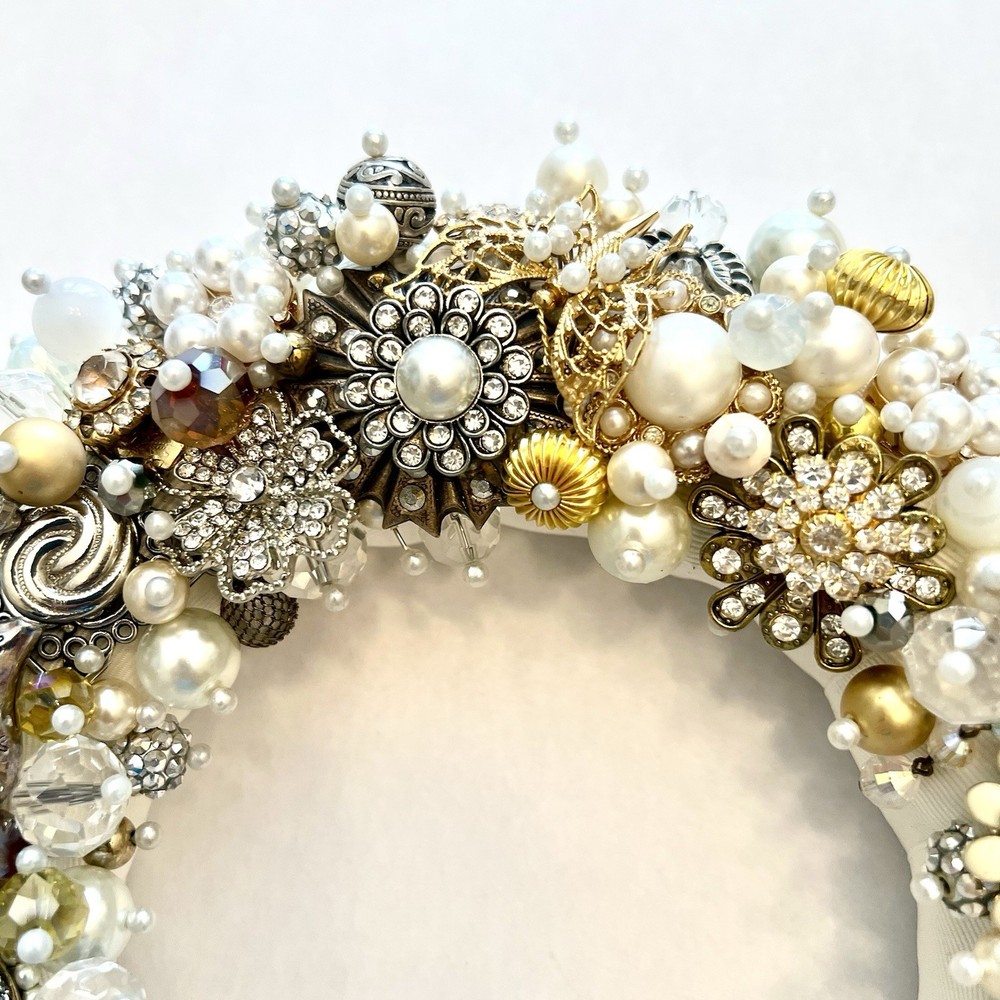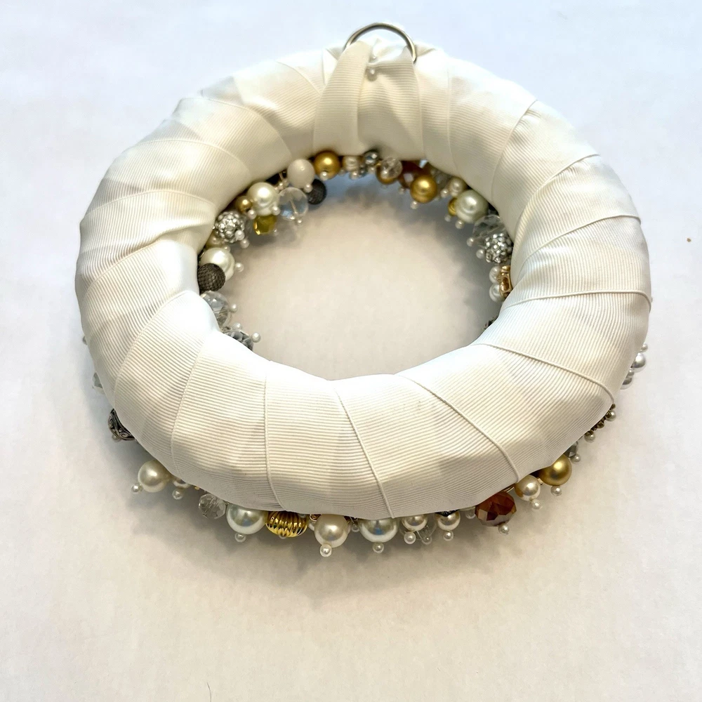 This hand-crafted decorative wreath hanger is a stunning addition to your holiday or everyday decor. Featuring a 9" round design with white, gold, and silver beads and rhinestones, this door or wall decoration is perfect for all occasions. Made in the United States, this wreath hanger adds a touch of elegance to your home with its intricate detailing and unique design.