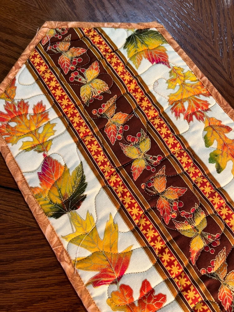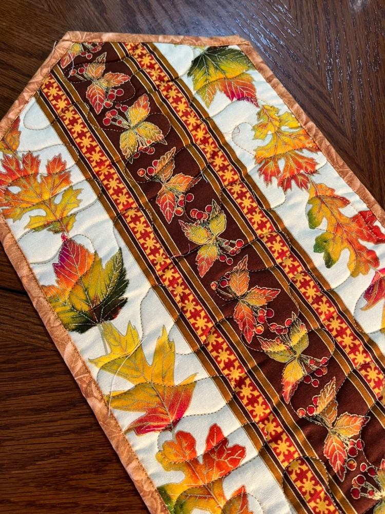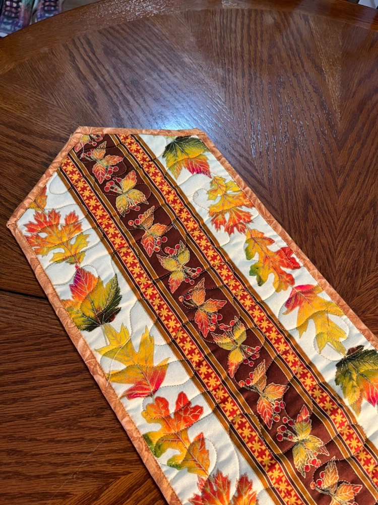 'Looking for a unique gift - add a candle or maybe a special vase and you have a wonderful gift! Perfect for Fall or have it for your Thanksgiving table! Makes great hostess gifts - especially for that Thanksgiving dinner. Enjoy the magnificence of fall with these colors and autumn leaves! NEW! - for Fall 2024 (1) Table Runner - Fall Print 9 by 30 inches (Please note the size.) Back: Brown Machine quilted. Center: Fall leaves in rust, golds on brown background Border: - Cream background with fall colored leaves, orange gold highlights HAND MADE TABLE RUNNERS SELL FOR 25.00 TO $35.00 AT MY LOCAL QUILT SHOP. When buying one, two, three of my auctions pay only one shipping charge - flat rate envelope. When buying four to eight pay one shipping charge - Medium flat rate.