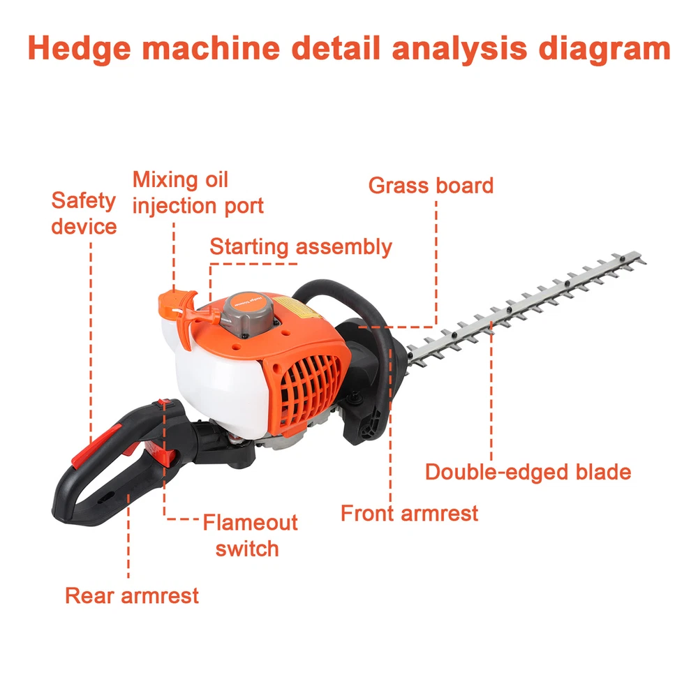 | | | | | | Handheld 26CC Gas Powered & Cordless & 2-Stroke Brush Weed Chainsaw Trimmer ro > > > > > > < < < < < < < < < < < < < < < < < < < < < > > > > > > > > > > > > > > > > > > > > > Description: Trimmer Head: The brush cutter attachment has a heavy-duty 24" wide blade, which is ideal for cutting thick bramble, shrubs, weeds, brush, nettles and thick overgrowth. Ergonomic Handle: Featuring ergonomic handle design, the gas weed eater is easy to grip and improve working efficiency, reducing fatigue and maximum cutting control. Lightweight Design & Easy to Store: Lightweight design is easy to handle and hold and includes a detachable shaft for easy transport and storage. Designed for moderate outdoor work, it gives you the freedom to quickly and easily tackle a range of jobs, from trimming hedges to clearing away excess branches. Fast Starts: With the 26cc gas hedge trimmer, you can start work right away without wasting time struggling to get the trimmer going. Its engine and starter are specially designed for quick starts with minimal effort. Wide Applications: The handheld Hedge Trimmer is designed for easy and efficient trimming of hedges, bush, shrubs for home, yard, garden and so on. Item Name: Hedge Shears Material: Metal Cutting Side Width: 24" Engine Displacement: 26cc Engine: 2-Stroke Cold Gas Engine Power: 0.74kw/7500RPM Fuel Tank Capacity: 0.6L Starting Type: Returning Cutting Machine Type: Double-Sided Blade Features: Strong Power, Cordless, Ergonomic Handle Size Details: L: 90cm/35.43", W: 25cm/9.84", H: 25cm/9.84" (Approx.) Notes: Due to the light and screen setting difference, the item's color may be slightly different from the pictures. Please allow slight dimension difference due to different manual measurement. Package Includes: 1 x Hedge Shears 1 x Installation Tool 1 Pair of Gloves 1 Pair of Goggles Payment Shipping Return Contact Us 1. We acceptPayPal,Credit card,Debit card,Apple Pay,Google Pay ect as payment. 2. Please be sure your shipping address is correct before make a payment. 1. We ship to your eBay or Paypal address. Please make sure your eBay and Paypal address is correct before you pay. 2. Items will be shipped within 1-7 business days when we received payment. 3. Delivery time depends on destination and other factors. 4. International buyers please note: a. Import duties, taxes and charges are not included in the item price or shipping charges. These charges are buyer's responsibility. We will try our best to reduce the risk of the custom duties. b. Please check with your country's customs office to determine what these additional costs will be prior to buying. 30 DAY RETURN POLICY Customer Satisfaction is our main goal, all items are quality checked prior to being listed and sent out. Please contact us prior to leaving any Negative Feedback and allow us to make things right! If you not satisfied with it please include the original packaging and return form & tracking number otherwise the return may take longer to process the refund. Once we have received the item and inspected it we will issue the refund or resend within 1-7 business days. Please contact us in time if any enquriy under any circumstances. We greatly appreciate your positive feedback and we'll do the same to you. We care about our valued customers, and will always try our best to help you, if you have any problems. Working time: GMT+8 / 9:00-18:30 in normal we will reply you in one working day.
