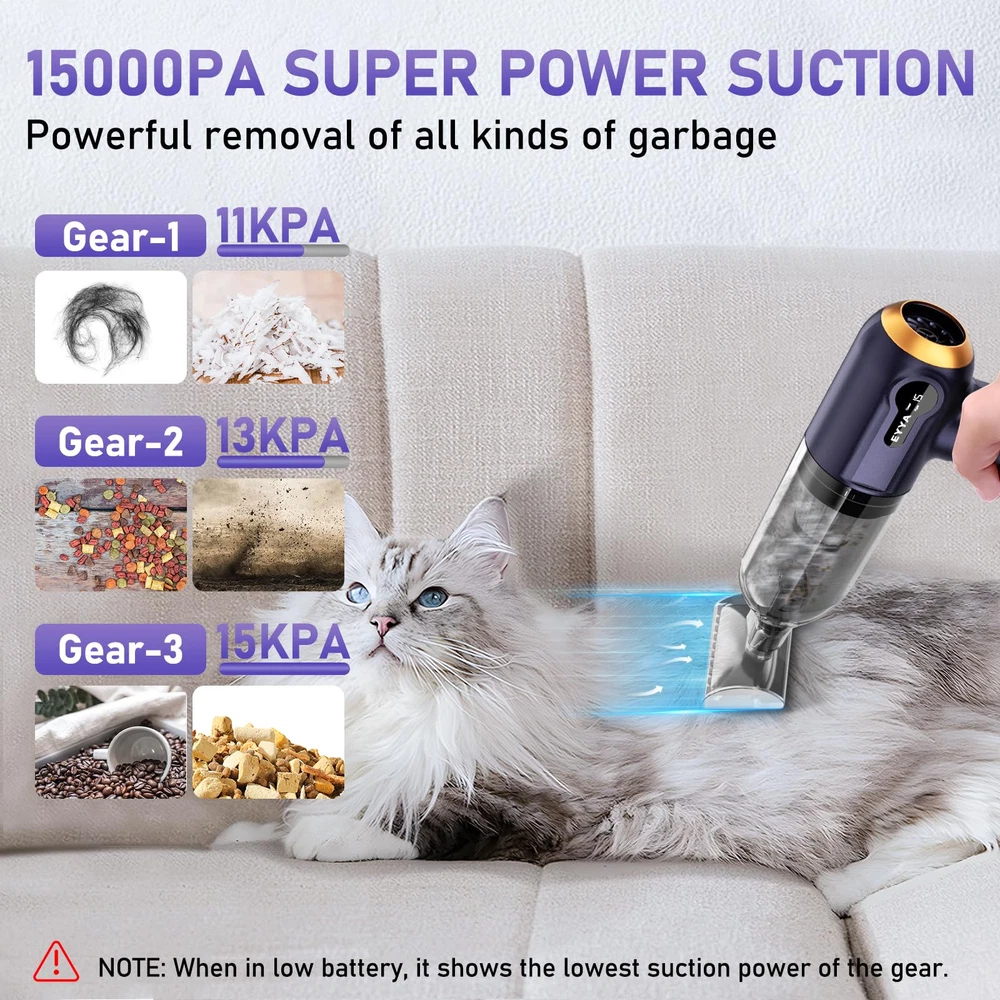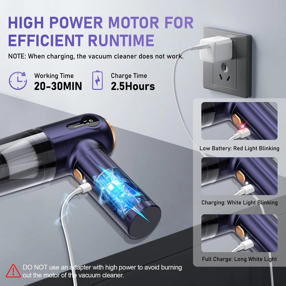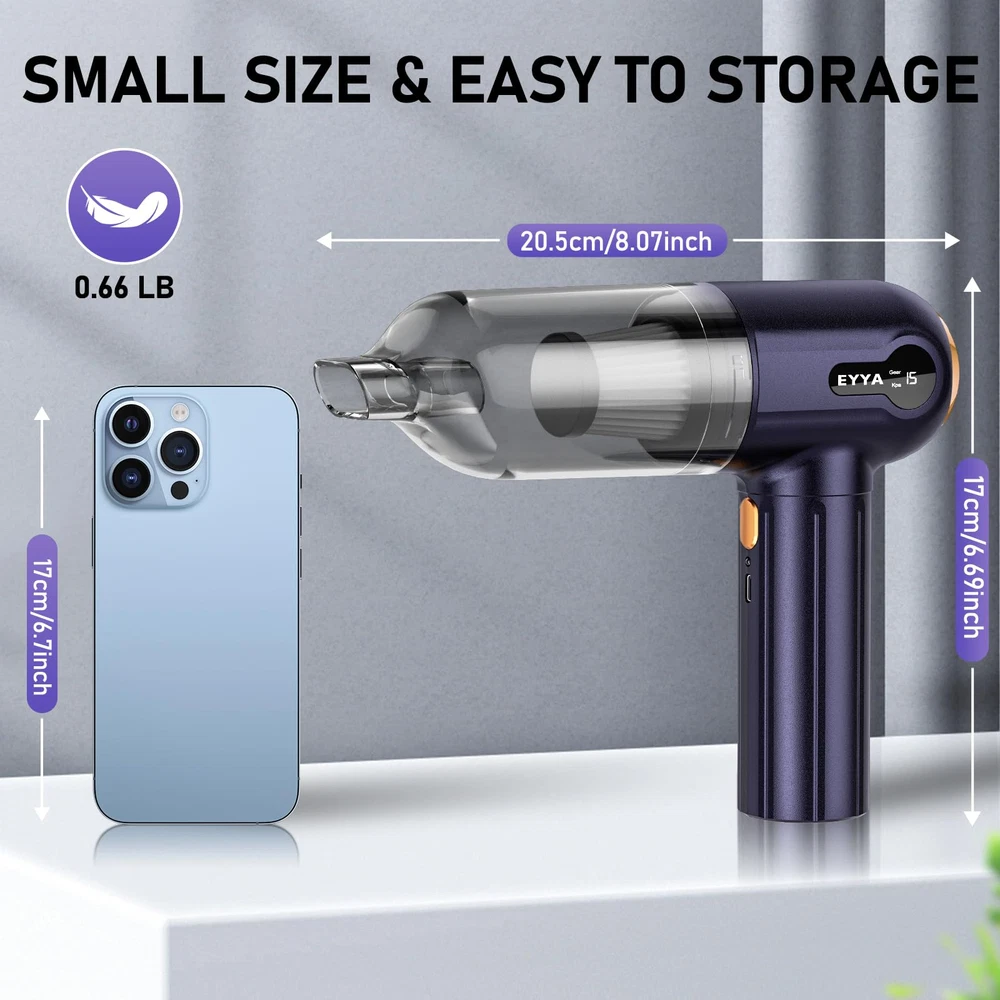 💜【Multifunctional Vacuum & 4 Modes】The car vacuum cleaner high power is used with 7 accessories to get 4 modes for different scenarios of use: regular vacuum mode, regular blowing mode, pet cleaning mode, and inflation mode, which can deal with all kinds of cleaning and multi-scenario use needs easily. Equipped with LED light can allow you to clean normally in a dim environment without light limitation 💜【15000PA Suction & Blowing Power】The 120W powerful motor provides 3 adjustable suction and blowing power, you can adjust the mini car vacuum cleaner gears according to your cleaning needs. 1-Gear 11KPA, which is suitable for daily cleaning work. 2-Gear 13KPA, can meet the requirements of efficient cleaning. 3-Gear 15KPA, suitable for comprehensive deep cleaning use 💜【7 Multi-Purpose Accessories】Multi accessories for all of your needs. Long nozzle, brush and long nozzle make it easy to clean all kinds of dust and garbage. Hair dryer nozzle provides powerful airflow to quickly dry damp clothes or hair. Suction nozzles can suction and inflate organizers to make organizing easier. Pet care brush can suck away hair while brushing your pet. Inflatable nozzles can inflate balloons, swimming rings and so on 💜【Digital Display & Fast Charging】The handheld vacuum cordless cleaner is equipped with a digital display, you can clearly see the current number of gears used and the suction power level, which can help you better control the cleaning progress. 4000mAh large capacity battery can be fully charged in only 2.5 hours, and it can be a run for 20-30min under full charge 💜【Cordless & Lightweight】The cordless design of portable vacuum for car cleaner allows you to get rid of tether and have the freedom to clean anywhere in your home and car. Our vacuum cleaner is compact, only 0.66LB, doesn't take up much space, allowing you to store it easily when not in use. Note: Please do not use the suction nozzle and inflatable nozzle for cleaning work to avoid dust entering the motor and causing damage to the vacuum cleaner 💜【High-Efficiency Washable HEPA Filter】The car vacuum portable cordless cleaner comes with a HEPA filter that is washable and reusable and is able to effectively filter out 98% of the microscopic dust. The large-capacity visible dust cup makes you don't need to clean it frequently, and it is easy to disassemble and simpler to clean. Note: The machine body is not washable NOTE: Please check that the filter is correctly installed before use. Leave it for a period of time after use and charge it after the body cools down. When not in use for a long time, charge regularly with a 5V-2A adapter to prevent self-discharge and over-discharge of the battery