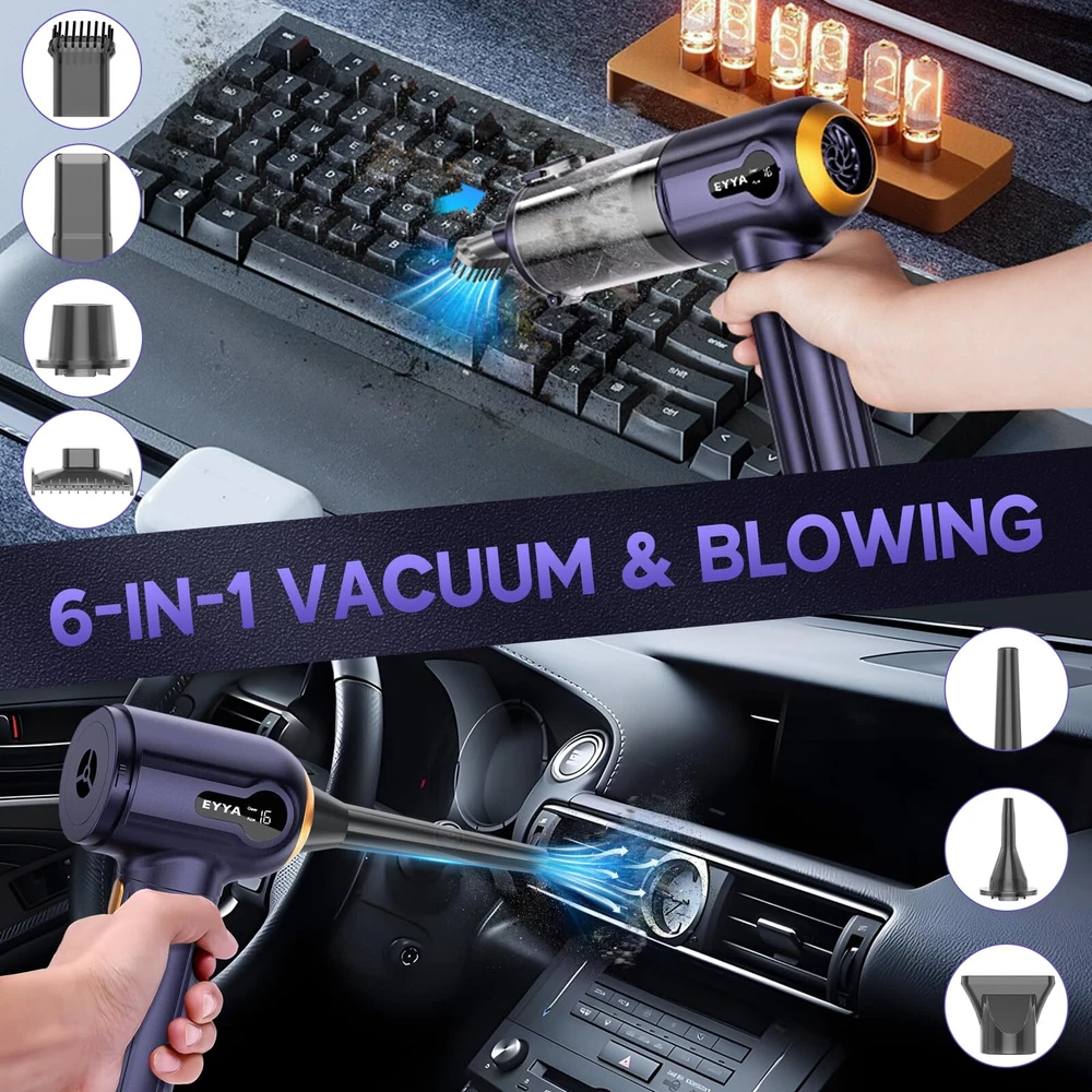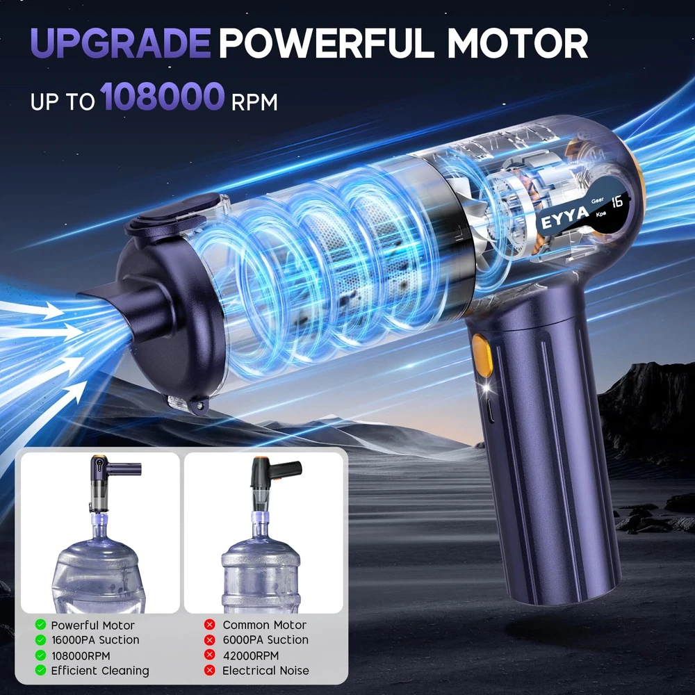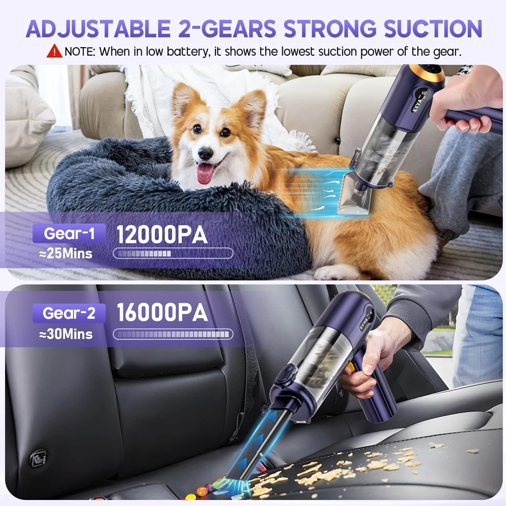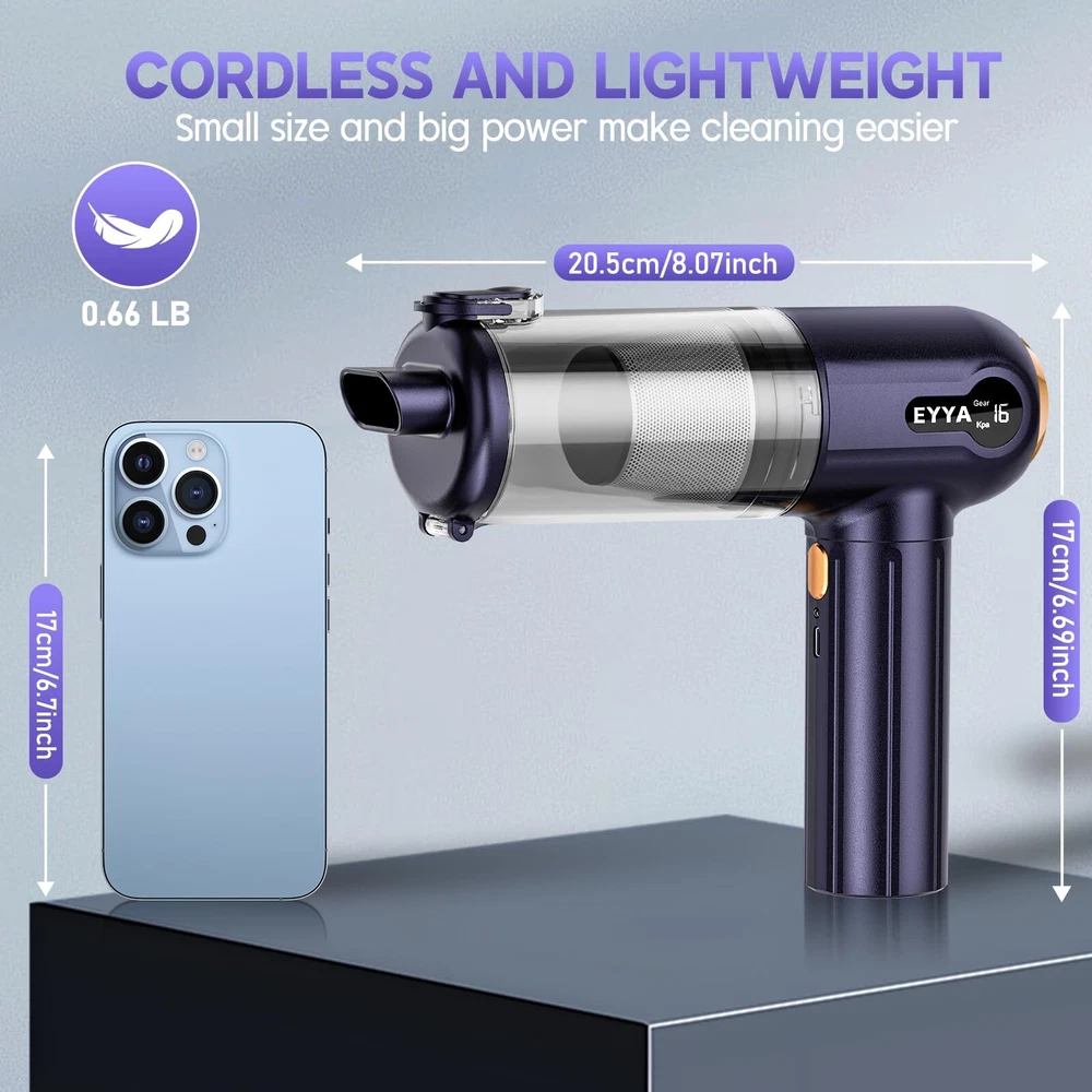 🟣【16000PA Powerful Suction】120W powerful motor provides strong suction and blowing options of 1 Gear-12KPA and 2 Gear-16KPA, you can adjust the vacuum cleaner's gear according to your cleaning needs. Whether cleaning up tiny dust or larger debris particles, it is easy to deal with. Car vacuum cleaner fast heat dissipation function keeps the motor stable at a high speed of 108,000RPM, preventing overheating and enhancing safety 🟣【7 Multi-Purpose Accessories】Multi accessories for all of your needs. Long suction nozzle, brush and long nozzle make it easy to clean all kinds of dust and garbage. Hair dryer nozzle provides powerful wind to quickly dry damp clothes or hair. Pet care brush can suck away hair while brushing your pet. Large universal nozzle can vacuum storage bags or inflate mattresses and rafts. Small universal nozzle can inflate and deflate yoga balls, swim rings and more 🟣【Dual Filtration System】Handheld vacuum cordless cleaner comes with an upgraded dual filtration system that prevents suction loss and clogging. With reusable filters, the steel filter can effectively filter large particles of debris, and the washable HEPA filter can filter tiny particles and dust to prevent damage to the motor. Unique -click dusting and U-locking design makes it easy to empty the dust cup while preventing accidental touching of the button 🟣【Digital Display & Fast Charging】Handheld car vacuum cleaner is equipped with a digital display that clearly shows the current number of gears used and the suction power level, which can help you better control the cleaning progress. 4000mAh reusable battery can be fully charged in just 2.5 hours. The working times of Gear-1 is 30min and Gear-2 is 25min under full charge. Note: Please don't use high power adapter, 5V/2A adapter can be used for charging 🟣【Portable & LED Light】Car vacuum portable cordless cleaner has a cordless design, so you don't have to worry about cords when cleaning. Our mini vacuum cleaner is made of lightweight material, only 0.66LB, making it easier to hold. Compact size can be easily stored in a drawer or locker to take up no space. Equipped with an LED light to illuminate dark corners, allowing you to easily clean without light restrictions