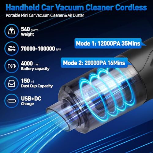 Return Policy Fast Delivery Trusted seller Handheld Car Vacuum Cleaner Cordless, High-Power Brushless 20000PA Mini Hand Held Vacuum Cleaner with 8 Multi-Functional Nozzle & 2 Replaceable Filters, Portable Vacuum Cleaner for Car Office Pet Hair Product Description 【Suction & Blow 4 in 1】Our handheld car vacuum cleaner offers versatile functionality, combining suction, blowing, charging, and vacuuming. With powerful 20,000PA suction, it's perfect for cleaning your car and home. Easily remove debris from stubborn crevices, windows, and desktops, and use it to clean keyboards or inflate items. This multi-use tool covers all your cleaning needs. 【20000Pa Strong Suction Power】 This high-performance vacuum delivers up to 20,000PA of suction, effectively cleaning pet hair, crumbs, dust, and sand from car seats and sofas. Its compact design allows for easy storage without taking up much space, making it both functional and aesthetically pleg. 【2-Speed Adjustable】This cordless car vacuum cleaner features adjustable speeds: 12,000PA for up to 35 minutes and 20,000PA for about 20 minutes. With a simple button press, you can easily empty the dust bin and clean the vacuum. The washable and reusable HEPA filter maintains strong suction while preventing clogs from dust and dirt. 【Rechargeable Battery and Fast Charging】 This mini car vacuum cleaner features a built-in 2*2000mAh battery and a Type-C fast charging cable, allowing full charge in just 2.5h~3 hours for 4-in-1 functionality. The Type-C port makes recharging easy with car chargers, power banks, or laptops. Weighing only 540g, it’s lightweight and portable, taking up minimal space. 【Wide Application】 This portable vacuum cleaner includes various detachable brush heads for versatile cleaning. It effectively cleans keyboards, cameras, air conditioners, sofas, windows, pets, plants, and more. Use it according to your needs to make cleaning easier. Shipping Returns Payment Shipping Shipping is FREE to all addresses other than APO/PO boxes in the lower 48 states. All our stock ships from US-based warehouses. Shipped via USPS or UPS (depending on location and package weight) Unless stated otherwise, all orders will ship within 24-72 hours of your payment being processed. Check our feedback to see the great reviews of FAST shipping we offer. Returns Seller does not accept returns Payment We currently accept payment via eBay managed payments only. Once payment is cleared, we will dispatch your shipment within 1-3 business days. Please refer to the "Shipping" tab for more information regarding shipping speed to your destination.