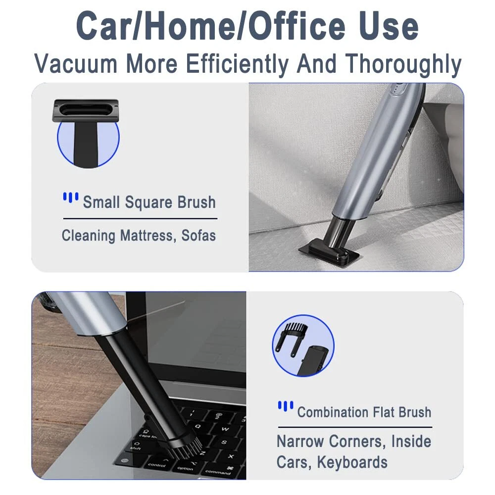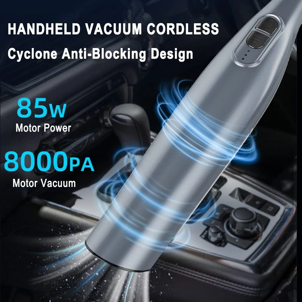 š šćUpgrade Handheld VacuumćCORDLESS DESIGN- Cord-free! Rechargeable for Home! Home & Car & Office Use! This rechargeable portable car vacuum cordless hand vacuum helps you move easily to any hard-to-reach corners! Hand-held vacuuming cordless for pet hair! š šćHand Vacuum Best SuctionćHandheld Vacuum Cordless adopts a cyclone anti-blocking design that can provide 85W/8000Pa strong cyclone suction, which can easily suck away dust, sundries, and snack chips. The vacuum car has a HEPA filter triple filtration that is washable and durable and doesn't require frequent replacement. Portable vacuum for cars also comes with 2 different brushes for all your car and home cleaning needs. The handheld cordless vacuum is a powerful partner for cleaning cars or pet hair! š šćRechargeable Portable VacuumćHand Held Vacuum with a large capacity 6000mAh battery & charging dock, battery up to 30minutes, in less than 3-4hours for a full charging time within the charging dock. Built-in LED work light to illuminate your surrounding environment, providing convenience for your car travel. š šćWashable & Easy to StorećPortable car vacuum cleaner with a high-efficiency filter HEPA filter element and different brushes can be washed with water and can be used wet or dry, pay attention to clean and dry the filter, no need to change it frequently. Large-capacity dust bin, easy to empty the garbage, save time and effort to clean. š šćWhat You GetćPacking list:1*Handheld Vacuum Cordless Car Vacuum Cleaner,1*Charging Dock,1*Cleaning Square Brush,1*Cleaning Flat Brush,1*USB Charging Cable. If you have any questions, please contact us. We will provide you with a satisfactory answer.