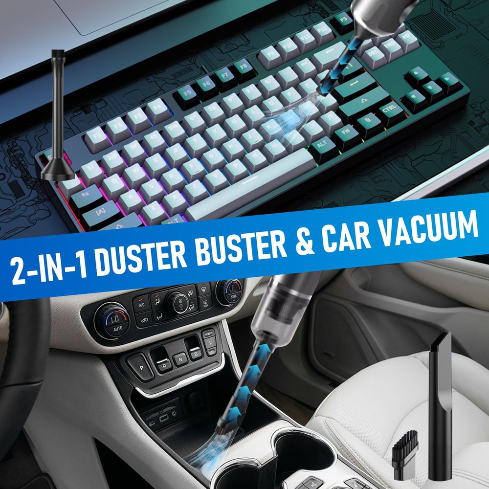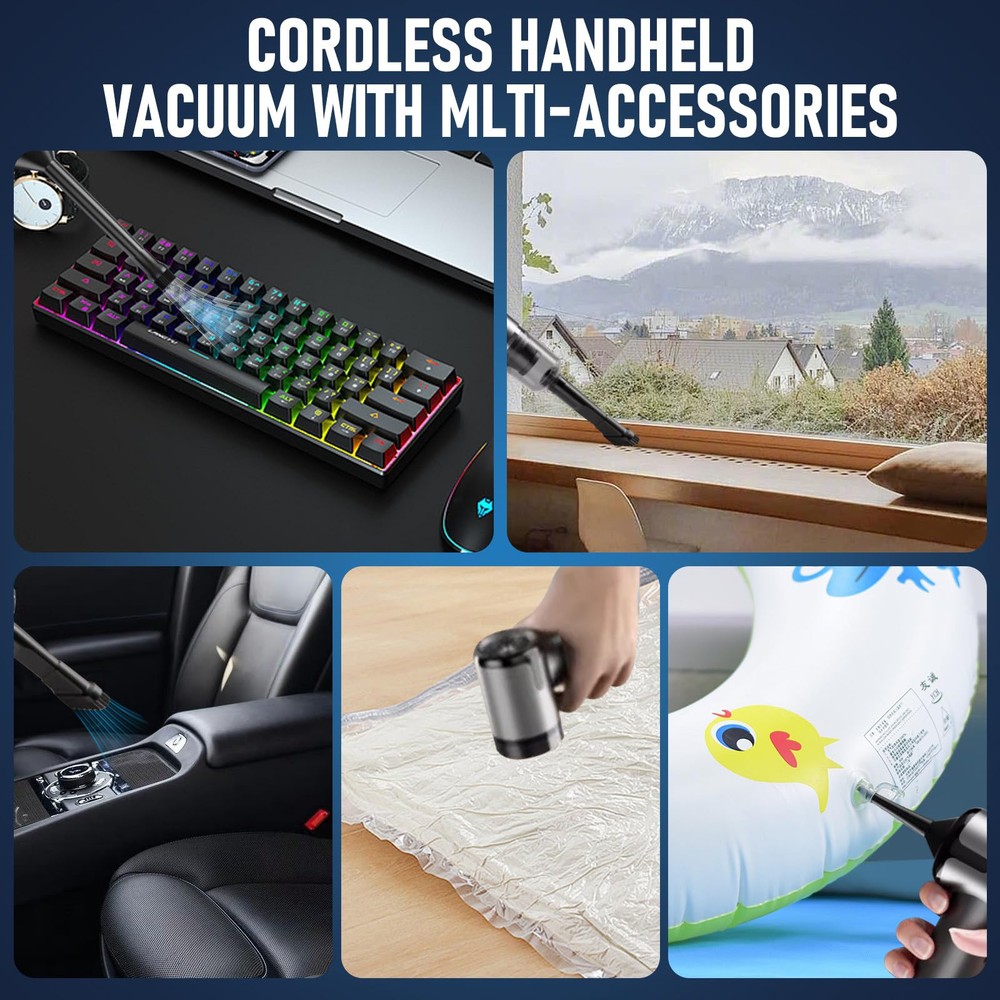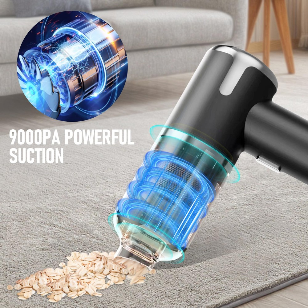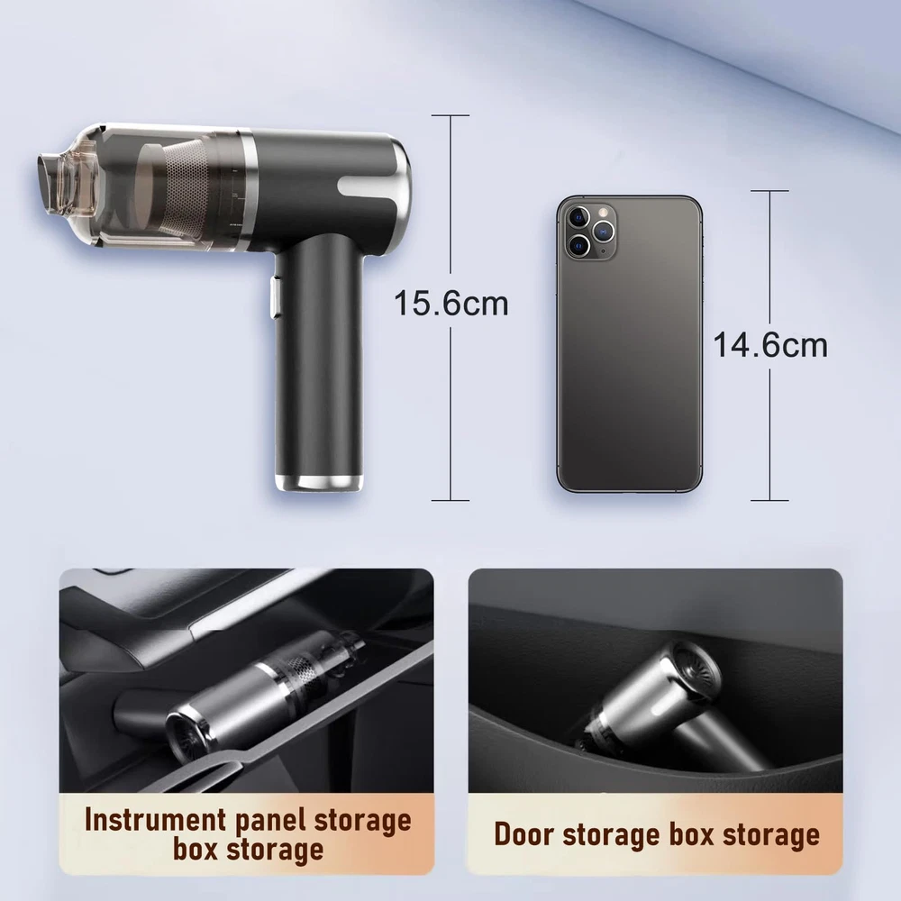 Multi-functional Cordless Car Vacuum: car vacuum is equipped with various nozzles that can support 3 mode : vacuum mode,dust blower mode,vacuum sealing mode. This versatile car vacuum cleaner is a must-have for keeping your vehicle clean and fresh at all times. 12000PA High Power Suction:A powerful brushless motor is installed in our wireless handheld car vacuum cleaner.It upgrades the suction power to12000PA and effectively removes any dirt or debris,making all kinds of cleaning easy. Small Size and Portable:Handheld design weighs only 0.66 pounds . Its lightweight construction allows effortless maneuverability around the house and car, making cleaning a breeze. Store it conveniently in the trunk or closet for quick access 5000mAh Rechargeable Battery:Get rid of the traditional bulky charger,our hand held car vacuum cleaner can be easily charged anywhere with a USB port.With fast charging in less than 2 hours, it can run for 15 minutes Reusable HEPA filter is washable and air-dried. Efficient cleaning leads to an elegant life. Buy a car vacuum cleaner now and enjoy it immediately