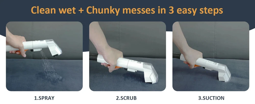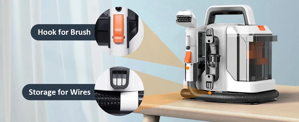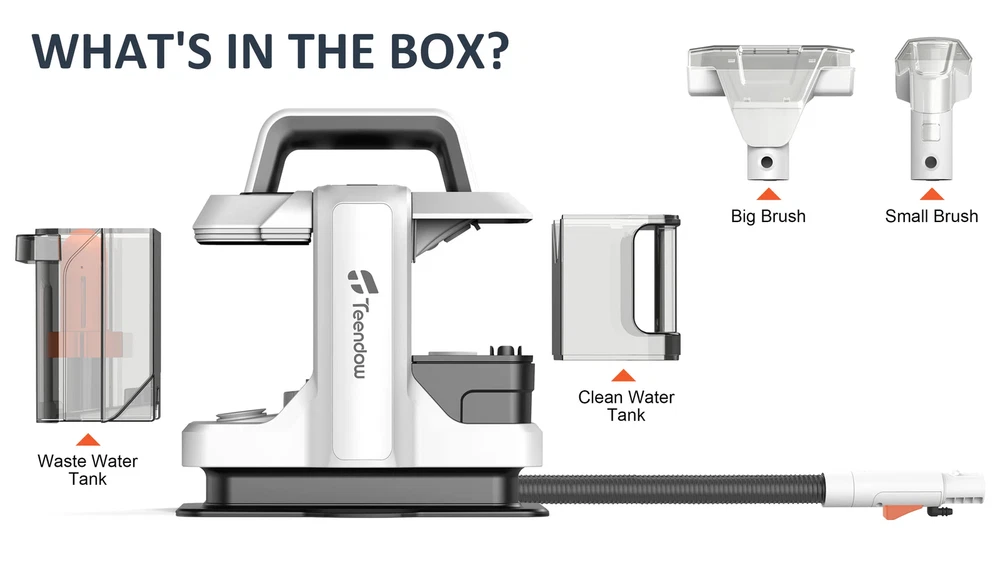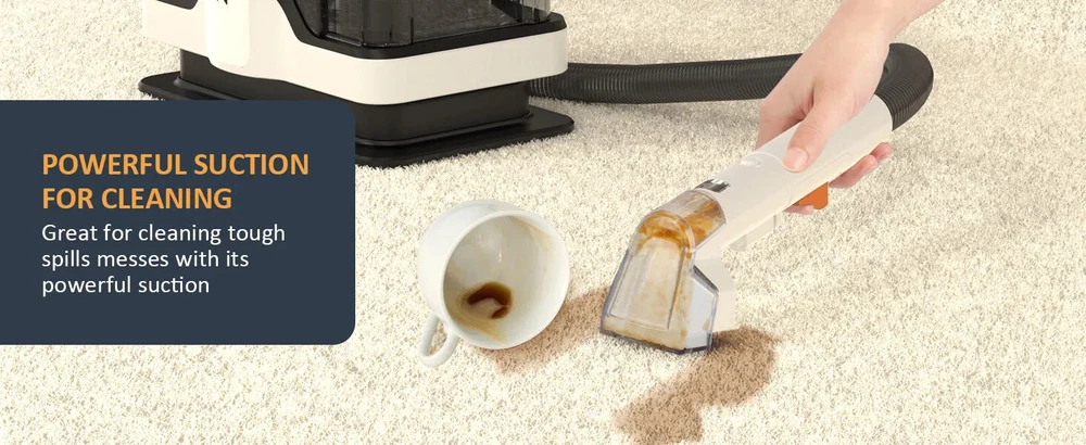 Spot Cleaner 15Kpa 450/750W Handheld Carpet Cleaner Vacuum Cleaner Spray Suction Integrated Machine Clean Machine Stop Working without Dirty water tank Rated inlet power:450/750W Rated Voltage:220-240V Rated Frequency:50/60Hz Max Suction:≥15Kpa Max air flow:≥11.5 l/s Suction Water Speed(Big brush):400 ml/min Suction Water Speed(Small brush):370 ml/min Sound power noise:≤80 dB(A) Protection Class:IPX4 Certification:CE,CB Clear Water Tank Capacity:1080ml Dirty Water Tank Capacity:800ml Power Cord Length:3m Hose Specification: ø32,1.2m