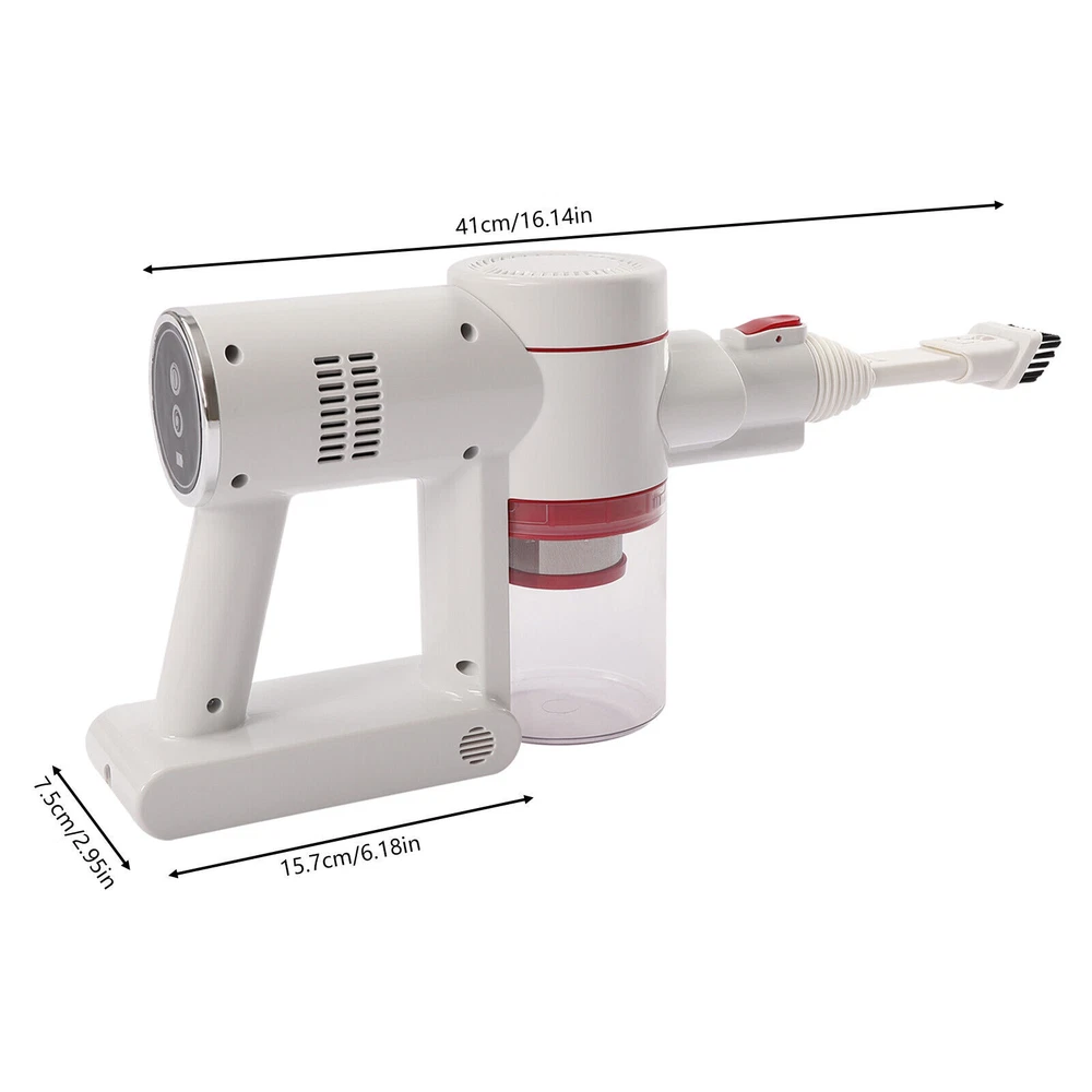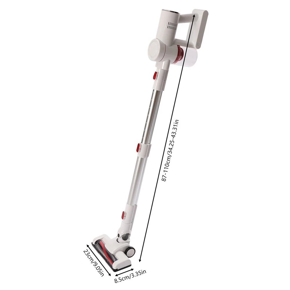 Specification Model: LM-001 Color: White, Silver Housing Material: ABS Style: Modern Plug Voltage: 110V Rated Voltage: 100-240V Power: 150W Number of Gears: 2 Vacuum Suction: 9500PA (Strong Gear), 5000PA(Standard Gear) Power Type: Plug-in, 3*2200mah Lithium Batteries(3.7V) Fully Charge Time: 4h Duration of Use On a Full Charge: 30min(Standard Gear), 15min(Strong Gear) Plug: American Standard Number of Wheels: 2 Wheel Type: Directional Wheel Number of Motors: 2 Motor Type: Pure Copper Motor Motor No-load Speed: 40000rpm Dust Collection Cup Capacity: 0.8L/0.2gal/27oz Brush Head Rotation Angle: Max 270° Rod Rotation Angle: Max 180° (Horizontal), Max 90° (Vertical) Noise: Max 68dB Maximum Clean Area: 120㎡/1291ft² Assembly Required: Yes Net Weight: 1.82kg/4.01lbs Welcome Description Description Bending down to do housework is very tiring and small corners are always difficult to clean. This cordless vacuum cleaner can ease your heavy housework. Made of two pure copper motors, it has high cleaning efficiency with low noise ( Max 68dB ). It has three lithium batteries and each one has a large capacity (2000mah), allowing it to continuously work for more than 15min or 30min under different modes. This cordless vacuum cleaner will be a good addition to your home. Key Features High-quality Material: This product is made of high-quality ABS, which is wear-resistant , waterproof , strong, durable, and not easy to deform. Powerful Suction: It uses two powerful motors and cyclonic duct design to provide strong suction power (9500PA) so that it can easily and quickly suck in fruit shells, paper dust, dust, etc, bringing you a new cleaning experience and saving you lots of time. Excellent Performance: This product uses two pure copper motors, which have strong power, high efficiency, high load capacity, and long-lasting range, providing you with excellent performance. With flexible 180°swivel sideways and 90°up and down, it glides under furniture and cabinets easily to eliminate dust and debris that is hard to reach. Also, it produces low noise (Max 68dB), providing you with a quiet environment. Multi-layer Filtration: Cyclone filtration at the air inlet filters airborne dust, then HEPA filtration and steel filter screen can block fine dust as small as 0.3 microns and lock it in the filter to avoid secondary pollution and ensure good air quality. Lightweight and Convenient: This product is designed to be wireless , which makes it easier for you to flexibly clean the corners in the living room, bedroom, and other places. The lightweight design ( 1.82kg/4.01lbs ) allows you to use it effortlessly with one hand. Women and the elderly will not feel fatigued after using it for a long time. Large Capacity: The dust collection cup has a large capacity of 0.8L/ 0.2gal to store dust, which can avoid air pollution and reduce the cleaning frequency of the machine. Meanwhile, the clear design allows you to view the dust volume for timely cleaning. Long Endurance: The three lithium batteries can support this product to work continuously for about 30min under strong mode and 15min under standard mode on a full charge. It can clean to a maximum area of 120㎡, which can avoid frequent charging to save you lots of time. Snap-on Design: The water tank adopts a snap-on design. After installing the water tank, the brush head can capture dust and hair as well as kitchen air-dried soy sauce and vinegar stains at the same time, avoiding the labor of kneeling to wipe, while reducing the long exposure to absorbing acid and alkali solvent rags to avoid skin aging, roughness, and other injuries to hands. Easy to Operate: The button on the top allows you to turn the machine on or off with just a touch, which is very convenient and quick. Flexible Movement: The two directional wheels at the bottom of the product can facilitate the movement of the product, which makes it easy to clean all corners of the room and can save you a lot of energy. Easy to Install: This product is simple in structure and complete in the package with a detailed instruction manual. You only need a few simple steps to install it, which is very time-saving and labor-saving. A Great Gift: The modern style and good practicality make it a great gift. You can present it to the elders to ease the housework. Protective Packaging: In order to prevent the product from being damaged and bumped during transportation, we fill the package with anti-collision protection foam to protect your products to the maximum extent possible. Guaranteed Customer Service: We are committed to providing quality products and services. If you have any questions, please feel free to contact us. We will reply as soon as possible and solve the problem. Details Ergonomic Handle: The handle is ergonomic and comfortable to hold, which can reduce the fatigue of your hands and arms, and provide you with a pleasant experience. Wall Bracket: It allows you to hang this product on the wall for easy storage. Heat Dissipation Holes: There are heat dissipation holes on the product, which can dissipate heat in time and prolong the service life of this product. Cleaning Brush: It has dense bristles and is suitable for cleaning irregular object surfaces such as curtains, keyboards, and chandeliers. Crevice Nozzle : It is suitable for window slots, sliding door slots, and other furniture with narrow edges and small corners. LED Headlights: It is equipped with LED headlights to easily track dust and debris in dark places. Application It is ideal for cleaning the home, garage, workshop, and vehicle projects. Specification Model: LM-001 Color: White, Silver Housing Material: ABS Style: Modern Plug Voltage: 110V Rated Voltage: 100-240V Power: 150W Number of Gears: 2 Vacuum Suction: 9500PA (Strong Gear), 5000PA(Standard Gear) Power Type: Plug-in, 3*2200mah Lithium Batteries(3.7V) Fully Charge Time: 4h Duration of Use On a Full Charge: 30min(Standard Gear), 15min(Strong Gear) Plug: American Standard Numbe