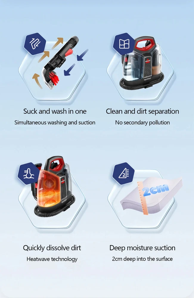 Household Handheld Steam Cleaner Sofa Carpet Curtain Car Vacuum Cleaner Spray Suction Integrated Machine Cleaning Machine Product parameter Model: 3698-Z Power: 330W Voltage: 220-240V Function: wet and dry Cable length: 5m Size: 39*32.5*16cm Net weight: 3.86kg Product parameter 1. Small fabric sofa and carpet cleaning machine, spray and suction integrated cleaning machine, household vacuum cleaner 2. Integrated suction and washing, clean and separate dirt, fast dissolve the dirt Heatwave heat wave technology 3. Deep moisture absorption, go deep into the surface layer 2, spray water and absorb water as a whole to clean, absorb and wash in one step 4. Strong pressure water seepage, low-grind fine dense brush to clean the colleague without damaging the material, clean dirt separation, clean water tank 725ML, sewage tank 1100ml Suck and wash in one Simultaneous washing and suction Clean and dirt separation No secondary pollution Quickly dissolve dirt Heatwave technology Deep moisture suction 2cm deep into the surface Pollution is difficult to remove from hiding Precipitation stains are like icebergs. After the surface is cleaned, 90% of stains are still hidden in the bottom of the fabric Deep suction Water spraying and water suction are integrated and clean In-depth cleaning of deposited stains and old spots in the fabric Between back and forth, the washing and suction is done in one step Moisture Suction Technology Three-step cleansing and renewal 1 spray Strong pressure seepage Press on demand, spray water instantly, spray evenly 2 brush Low-wear fine brush Flexible as silk, clean without damaging the material 3 suck Focus on suction design Suck stains on the bottom of the fabric Clean and dirt separation No secondary pollution To be used with the original cleaning fluid Purify the home environment and maintain the fabric A heated water tank Dissolve stains quick one step Proprietary heatwave technology Keep the water tank at its initial water temperature, helping to break down stubborn stains ● Wash the carpet ,it is recommended to use water below 30 degrees; ● Clean stains, blood stains, it is recommended to use cold water; ● Cleaning fabrics such as sofas, it is recommended to use warm water from 25 to 40 degrees. Handle every accident with ease The mat at the door Old footprints sofa Milk stains/crayon marks Long hair carpet in the living room Watermelon juice/drink mattress Urine stains/milk stains/holidays Car seat Coffee/drinks curtain Old stains/dust Get closer Pet odors go nowhere Quickly clean pet urine stains, dirty footprints Relieves odors at home Small and convenient,It's easy to play from a distance,6.3m large cleaning radius,From the living room to the bedroom, there is no need for frequent interstitial changes Easy to store,Bag size, does not take up space,Easy to carry away, easy to store Clean easily and hide in detail. ①Soft plastic switch Soft touch, waterproof and static-resistant ②Wire hooks Tangled wire is good to store, wires do not tangle feet ③The hose hook Around bunching design, save storage space Product parameters Product name: fabric cleaning machine Clean range :Fabric furniture Rated power : 330w Noise :65dB Clean water tank: 725ml Weight :3.86kg
