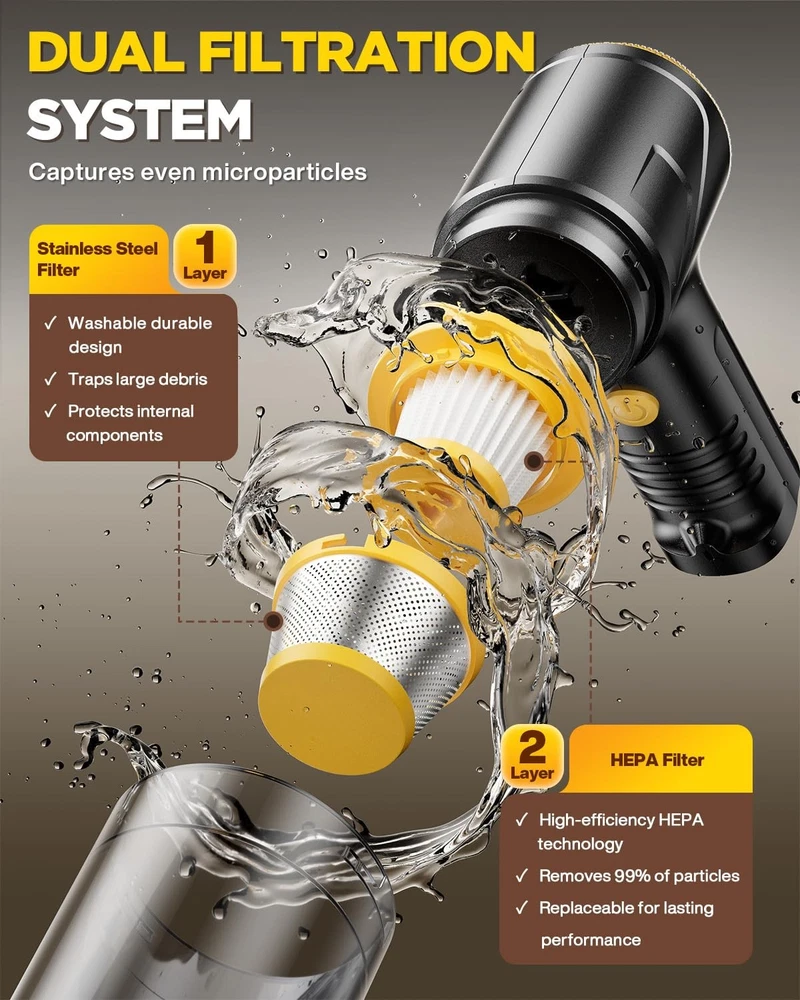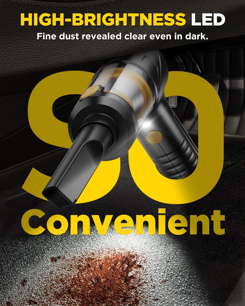 vacuum packs 30% more suction than ordinary models—strong enough to lift debris vertically. Easy to erases pet hair, digs out food crumbs, pulls up dust from cracks, and even yanks away stubborn cat litter. No residue, no repeats. Hurricane-Force 21,000Pa Suction - Dominate dirt with 's core: an 85,000 RPM brushless motor featuring dual ball bearings. Delivering 21kPa suction power – 30% stronger than standard vacuums – it annihilates embedded pet hair, stubborn crumbs, crevice dust, ash, and even clumped litter. Nothing escapes its grip 4-in-1 Handheld Vacuum (7 Accessories Included) - One device, endless solutions. Blow away debris from keyboards, vents & electronics. Deep-clean car seats & tight gaps. Rapidly inflate air mattresses, pool floats & balloons. Deflate storage bags fast. 7 practical accessories conquer any cleaning challenge anywhere – home, car, or on-the-go Dual Filtration & Hassle-Free Dust Release - Cleaner output guaranteed. Our HEPA filter traps 99.99% of micro-dust and allergens. The metal mesh shield blocks damaging large debris. Best part? Empty the bin in 3 seconds with one touch – no messy hands. Secure latches ensure worry-free operation Dual Power Modes & Fast USB-C Charging - Smart power for every task. Choose Eco mode (40 min runtime) for daily cleaning or Turbo mode (13 min) for tough messes. Recharge anywhere via universal USB-C – wall adapter, car, power bank, or computer. Full charge in ~3 hrs. Clear LED indicators: Red=Charging, Green=Ready Ultra-Portable Cordless Freedom - Lighter than your drink (just 0.8 lbs!), yet packs serious power. This cordless vacuum have long-lasting battery offers instant cordless cleaning anytime, anywhere. Effortlessly tackle messes indoors, in your car, or outdoors. Stashes anywhere – always ready for action LED Illumination System - See the unseen! This car vacuum integrated LED headlight cuts through shadows, revealing hidden dust in floor grooves, under furniture, and deep within crevices. Activates automatically on startup – no extra steps. Low-energy design ensures precise, thorough cleaning every time