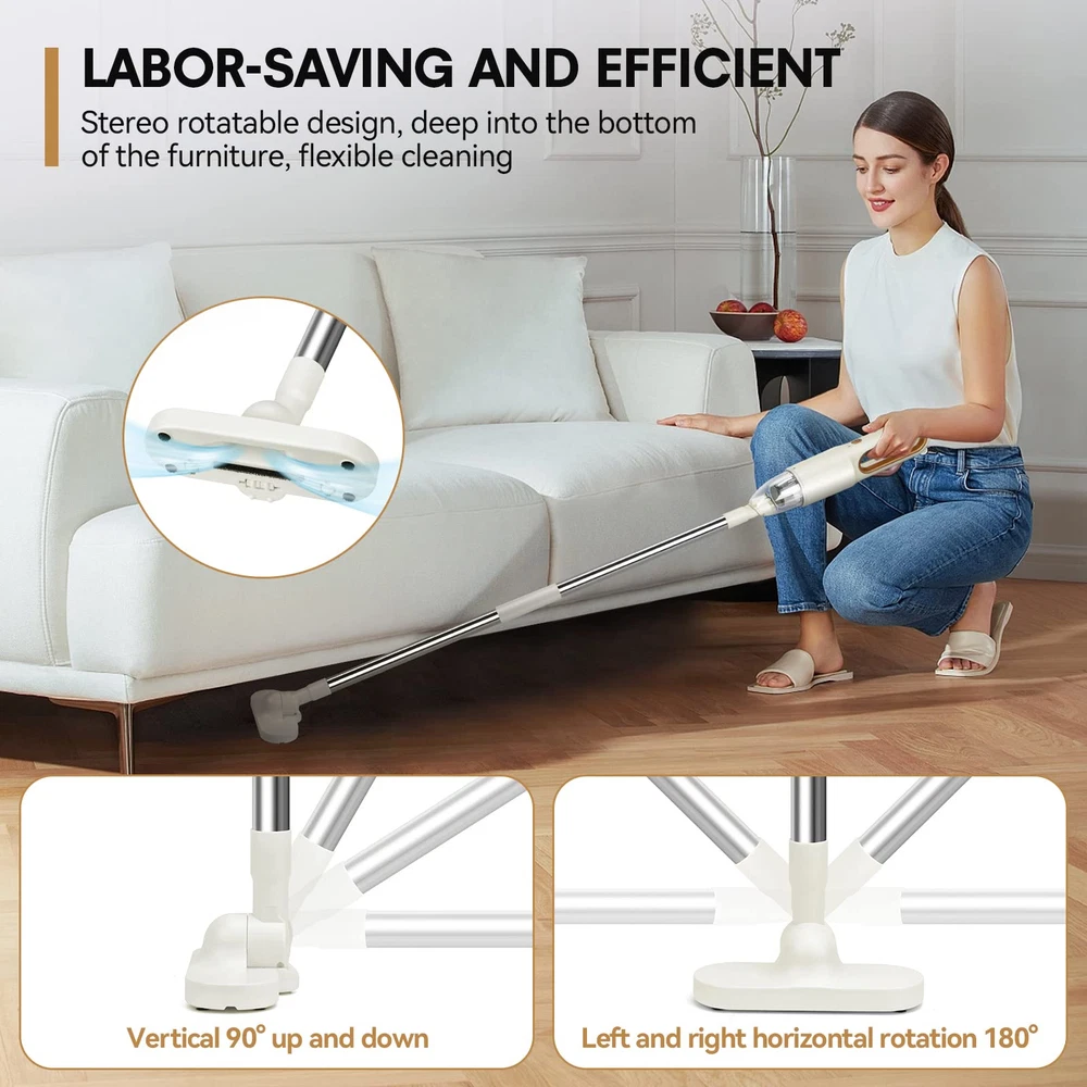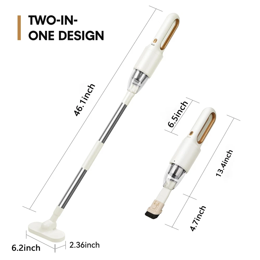 2-in-1 Versatile Cordless Vacuum Cleaner: The cordless vacuum cleaner combines the power of two models in one. Mode 1: A handheld vacuum that delivers 6000Pa suction, making it ideal for picking up dust, debris, pet hair, and paper waste in tight spaces. Mode 2: A detachable pusher vacuum that offers cordless convenience for easy floor cleaning, letting you reach every corner effortlessly. Whether you need a car vacuum for quick cleanups or a handheld cordless vacuum for daily tasks, this versatile vacuum cleaner covers all your needs. Multipurpose Mini Vacuum for Every Surface: Designed with an ergonomic grip and an integrated cleaning brush that can be quickly swapped out, this mini vacuum is perfect for tackling a variety of surfaces, including desktops, sofas, and car interiors. It’s also an excellent high-power car vacuum cleaner for maintaining your vehicle’s cleanliness. The 300ml dust collection cup allows for multiple uses before needing to empty, making this cordless vacuum a practical choice for home and car cleaning. Lightweight and Portable Handheld Vacuum: Weighing only 500 grams and measuring 14" H x 2.7" W, this portable vacuum cleaner is compact and easy to carry. It’s perfect for use as a car vacuum, and its USB charging feature allows for flexible charging at home or in your vehicle. Whether you need a hand vacuum for quick pickups around the house or a portable vacuum to keep in your car, the cordless vacuum cleaner is the ideal solution for on-the-go cleaning. High-Efficiency Dual Filtration System: This handheld vacuum is equipped with an advanced dual filter setup, featuring a washable HEPA filter and a stainless steel filter that together capture 99.99% of dust particles. The durable lithium battery provides up to 30 minutes of powerful cleaning. For the best performance, fully charge the vacuum before each use to ensure it's always ready when you need it. Whether tackling tight spots as a mini vacuum or handling larger areas as a portable hand vacuum, it consisten. Premium Customer Service: This vacuum cleaner, equipped with a beautiful outer box, is perfect for gifting. If you have any problems during use, we will be happy to help you.