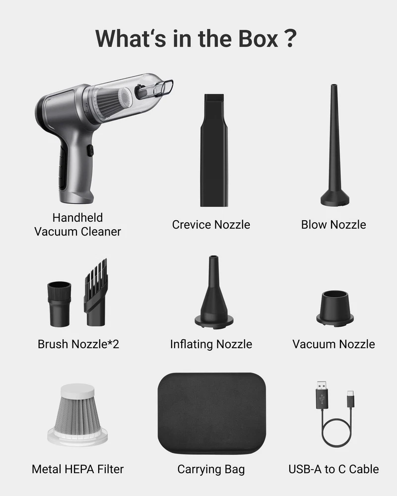 Powerful Motor for Deep Clean: The Handheld Vacuum Cordless boasts 12,000Pa strong suction and 75,000rpm brushless motor for efficient cleaning. Clean your car or home in just one go effortlessly with its powerful performance. Lightweight and Portable: The Small Vacuum Cleaner Cordless is super lightweight at only 0.8lb and compact in size, making it easy to clean tight spaces without tiring your hands. The portable vacuum allows you to keep your car and home clean and tidy anywhere you go. Cordless and Ergonomic: The Cordless Handheld Vacuum's ergonomic and wireless design allows for easy maneuvering, comfortable extended use, and hassle-free cleaning, without being tethered to a power outlet so you can use the vacuum anywhere. Versatile 4-in-1 Design: The Handheld Vacuum Cordless with its 4-in-1 function makes cleaning and organizing a breeze. It's perfect for removing dust, cleaning keyboards, inflating outdoor gear, and extracting air from storage bags, anytime and anywhere. Long-Lasting Rechargeable Battery: Clean your car and home anytime with Vacuum Cordless Rechargeable. 26 minutes of uninterrupted cleaning time, up to 90 days standby time and USB-C charging ensures long-lasting power. 4-Layer Filtration: Clean effortlessly with the portable vacuum cordless. Its separated structure, detachable dust cup, powerful motor, HEPA filtration, and tapered seal design captures 99.7%* of dust and debris while preventing garbage leakage. (Note: The washable HEPA filter should be dried completely before reusing for optimal performance.)